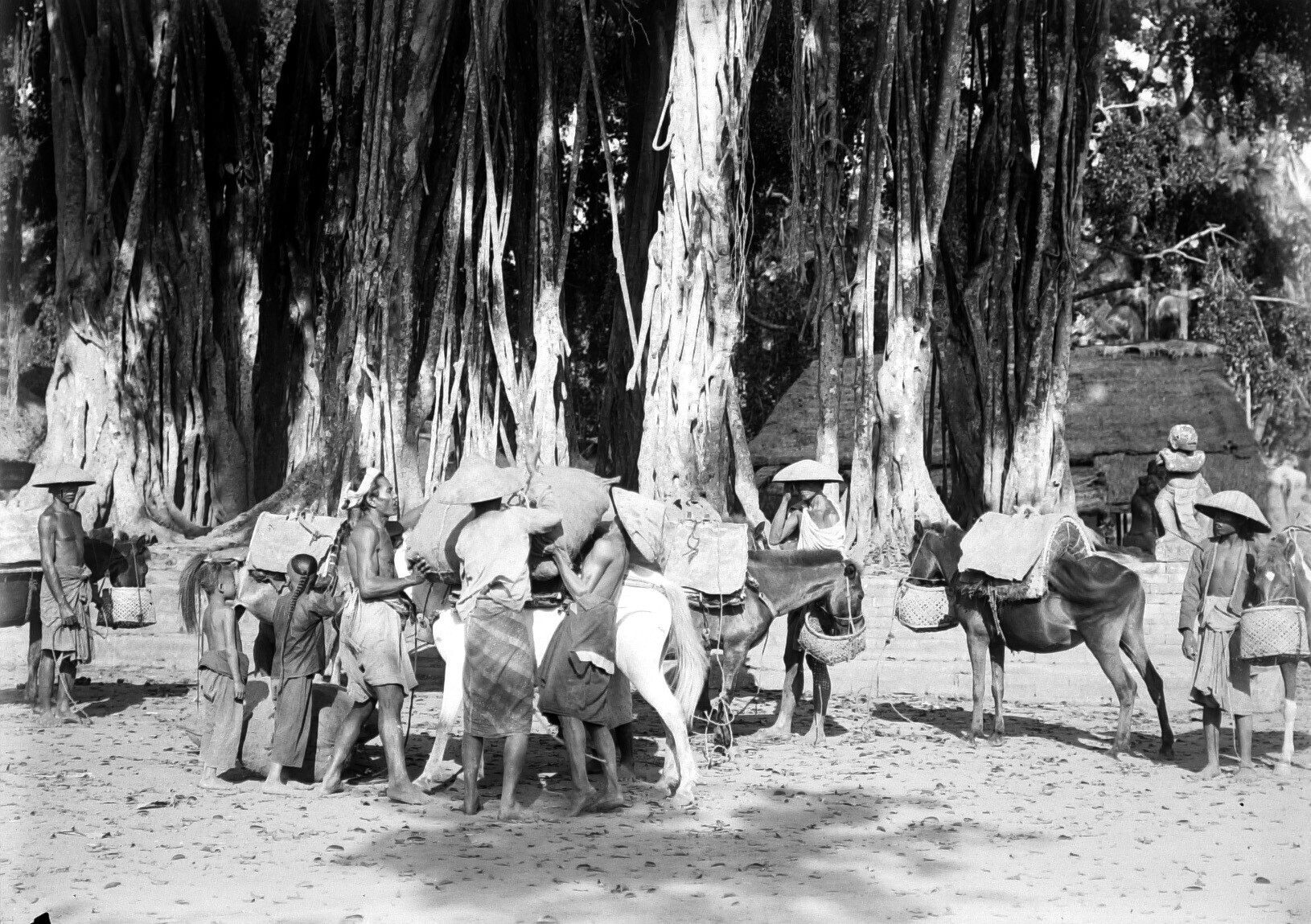 Paarden worden bepakt op het marktplein bij de grote...