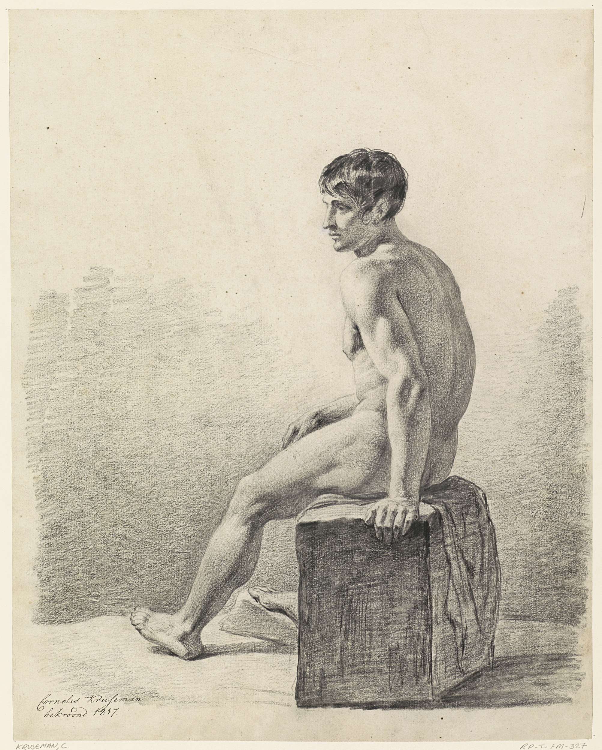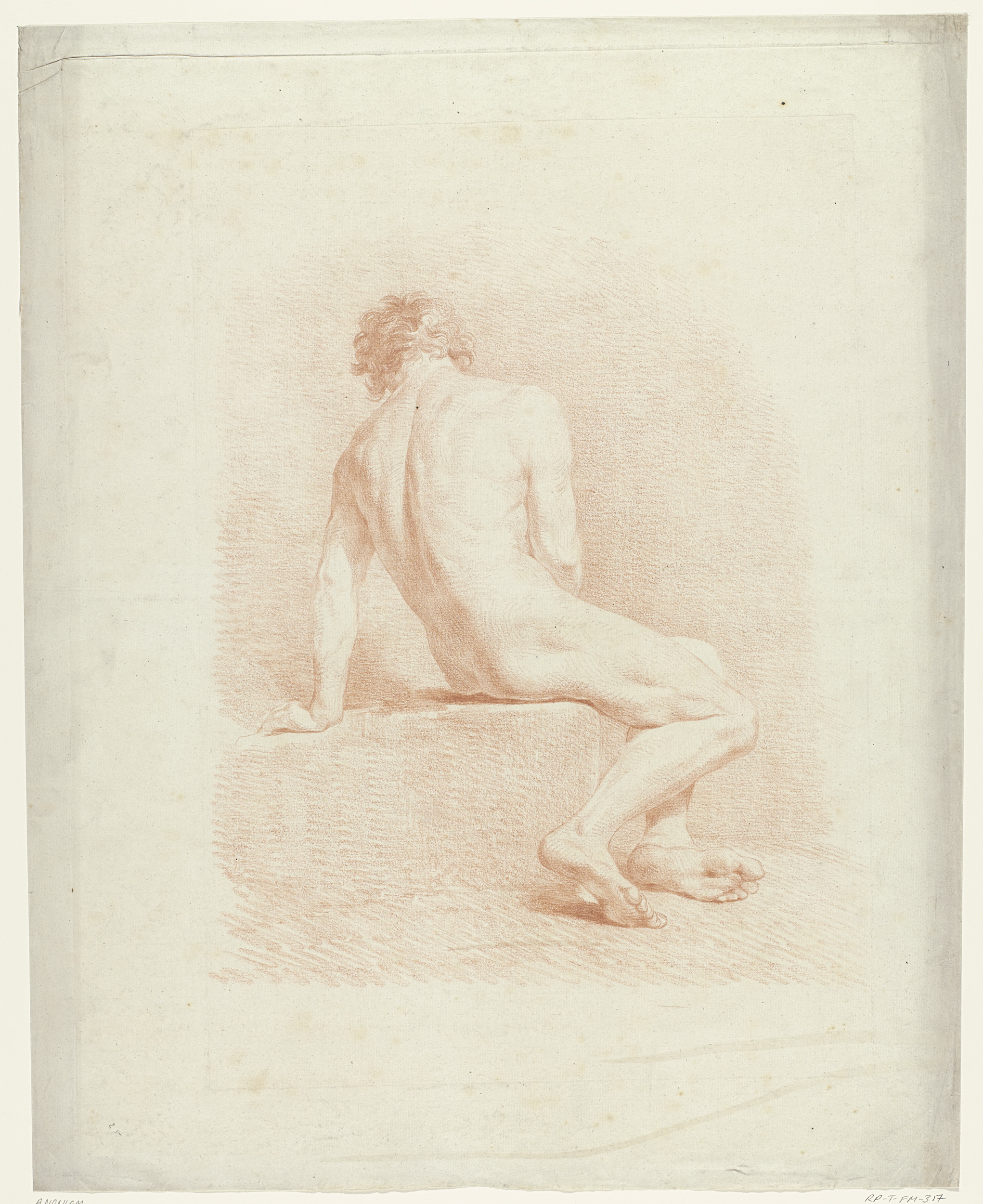 Zittend mannelijk naakt op een blok, op de rug gezien