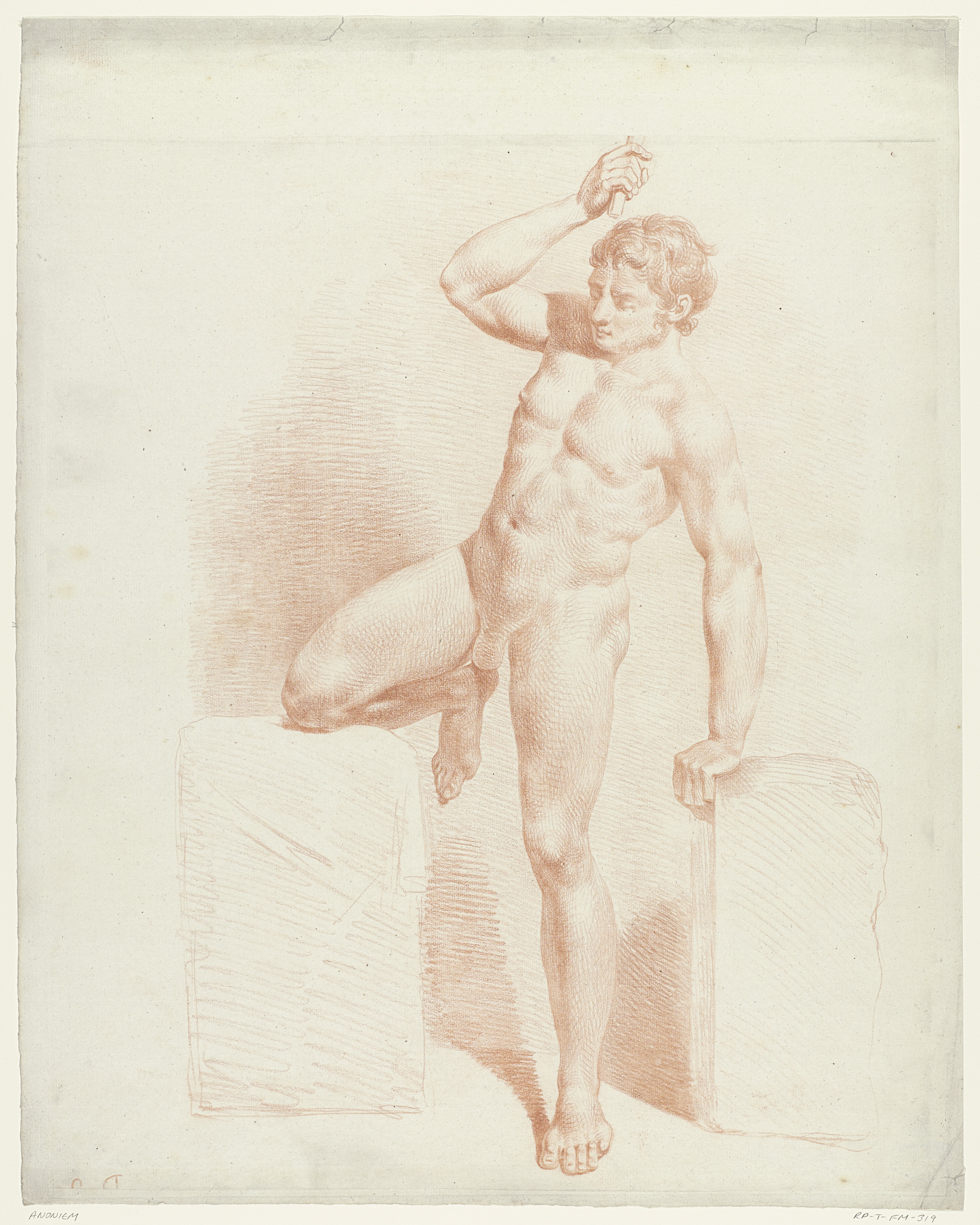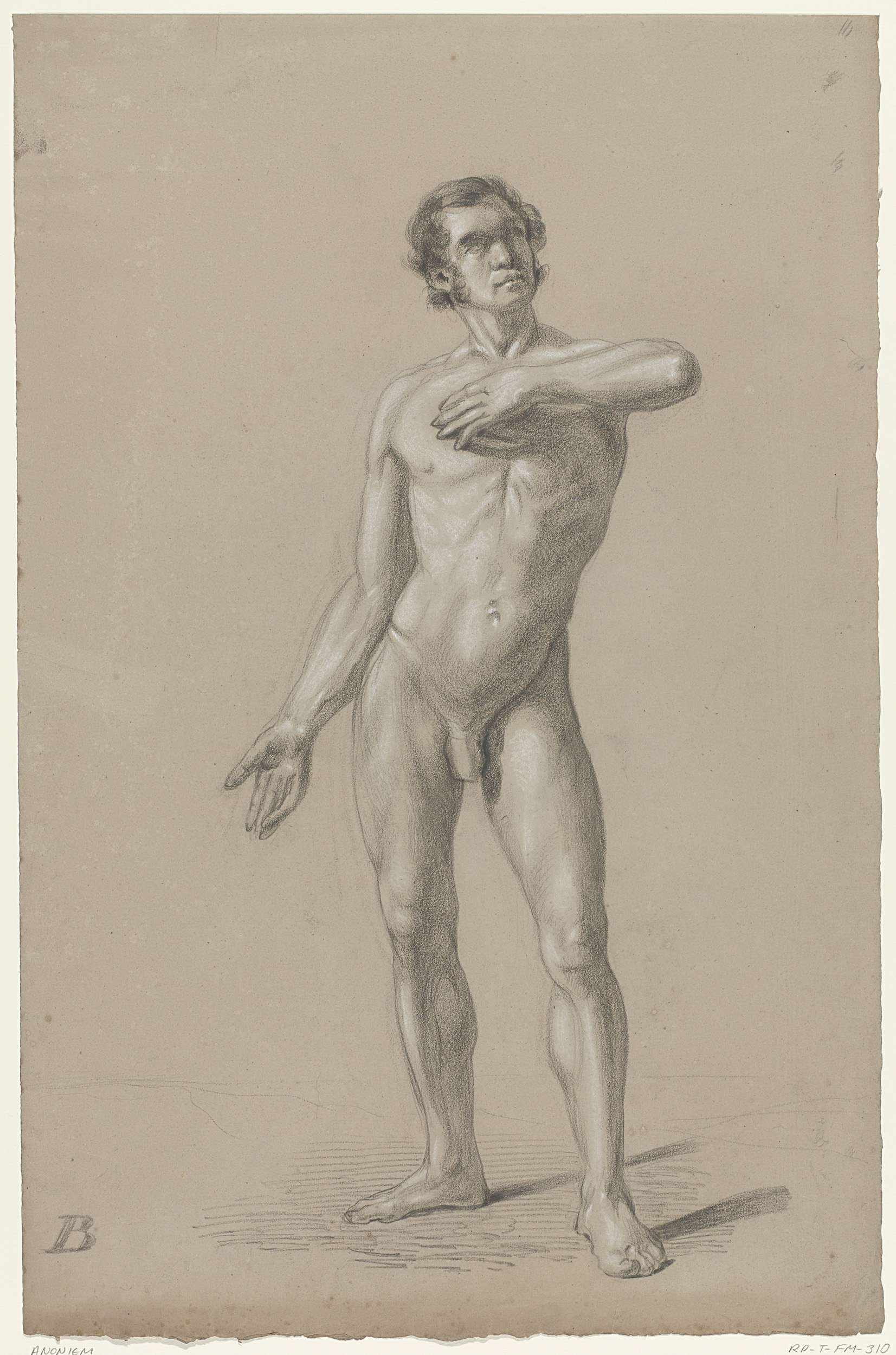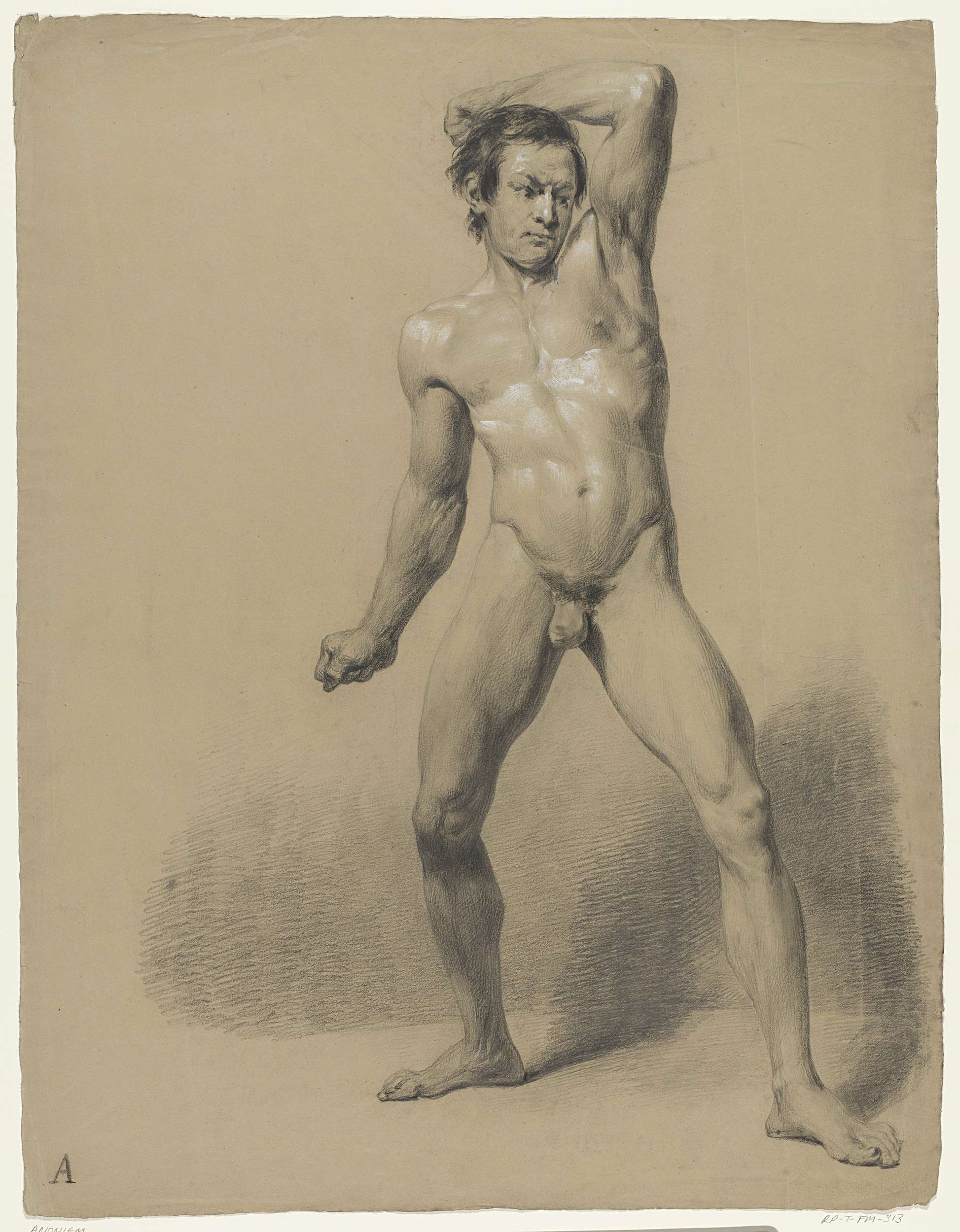 Staand mannelijk naakt, een arm opgeheven en de ande...