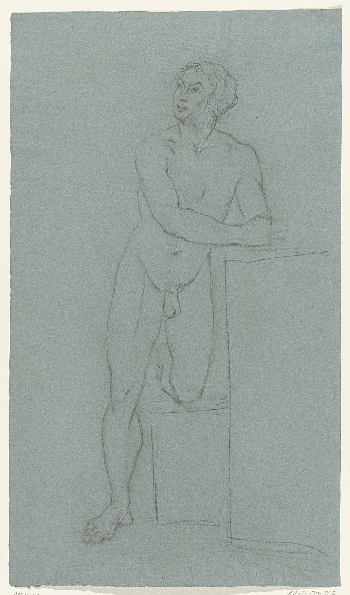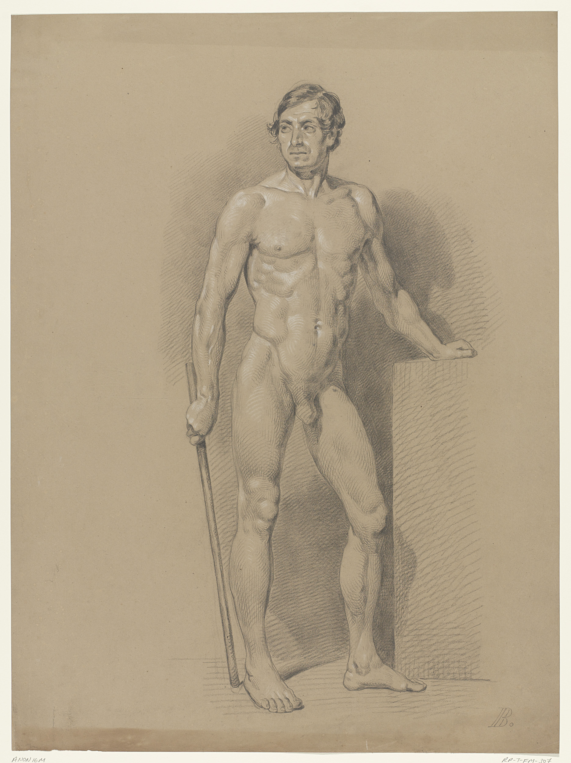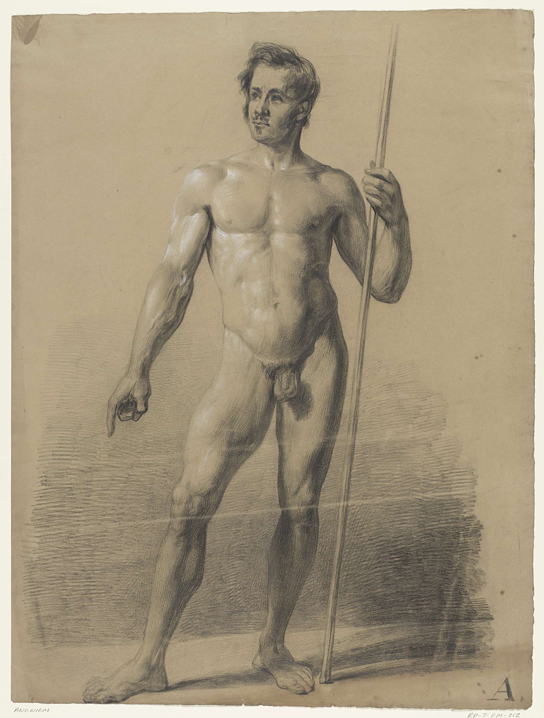 Staand mannelijk naakt, een arm opgeheven en de ande...