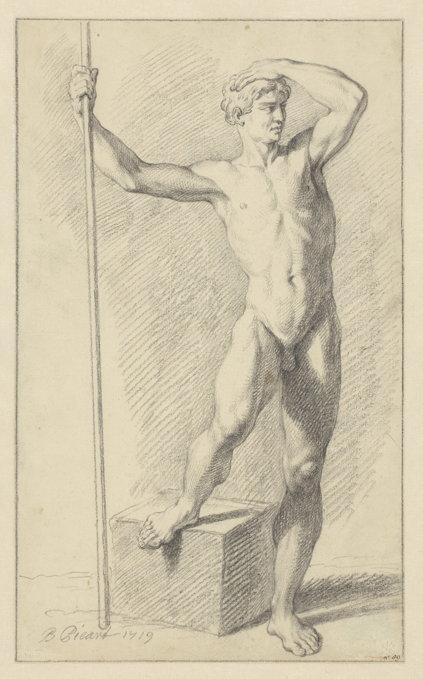 Mannelijk naakt, met een been geknield op een blok e...