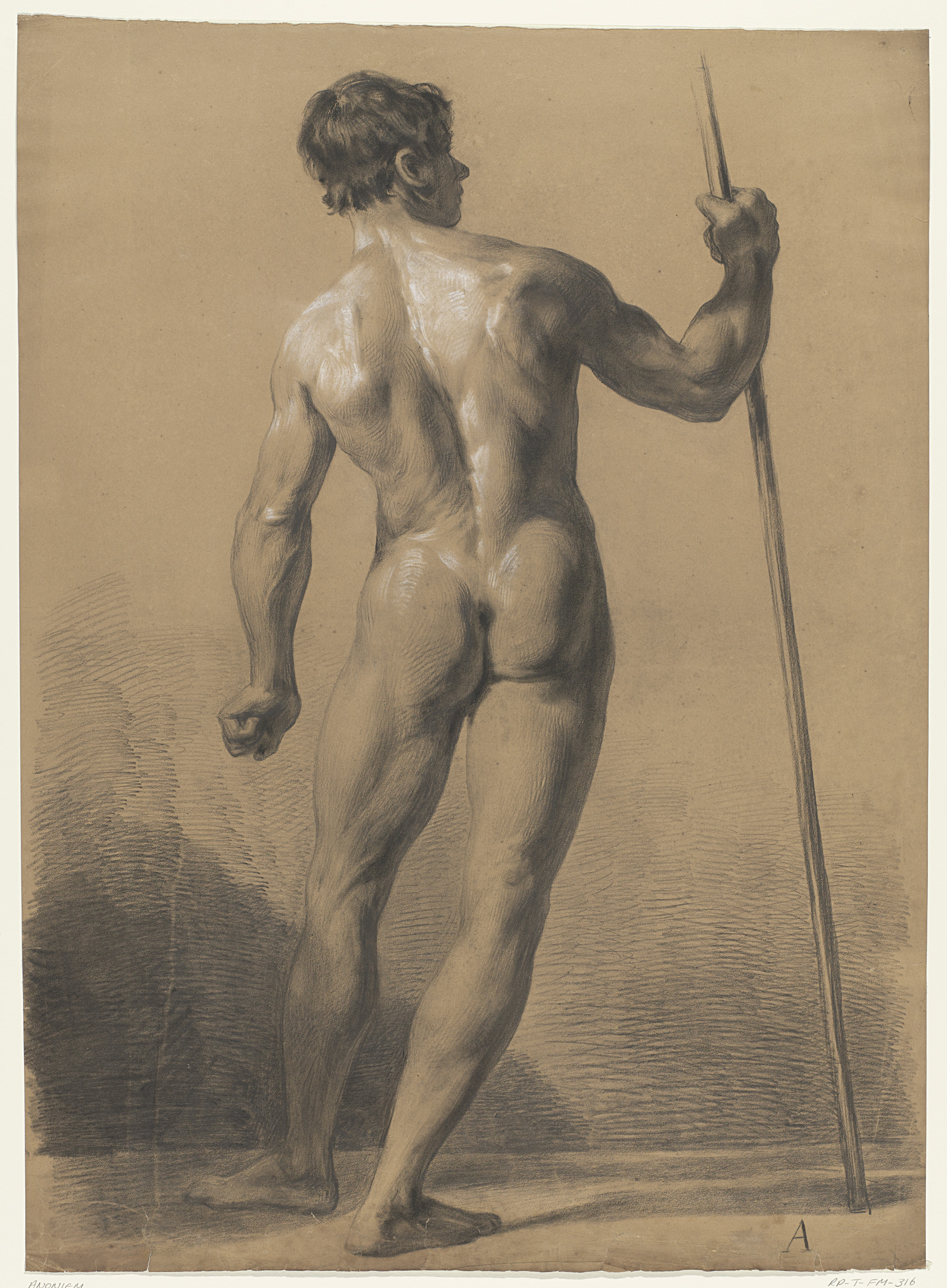 Staand mannelijk naakt met speer, op de rug gezien