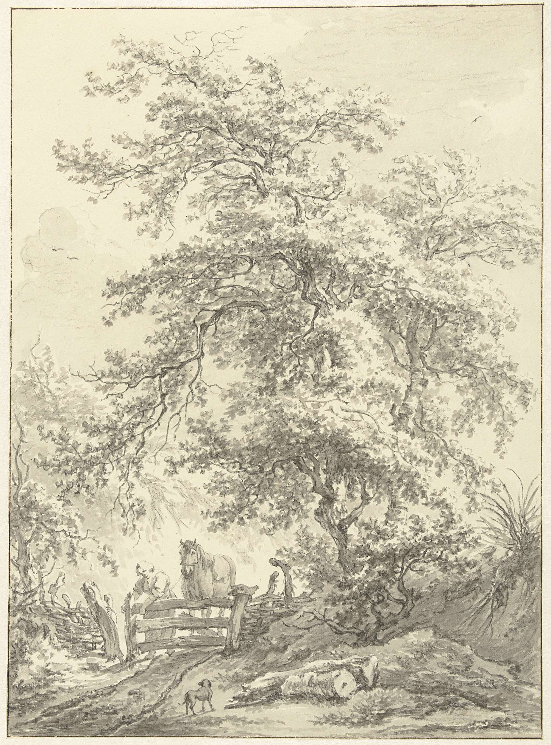 Vrouw met paard bij hek onder grote boom