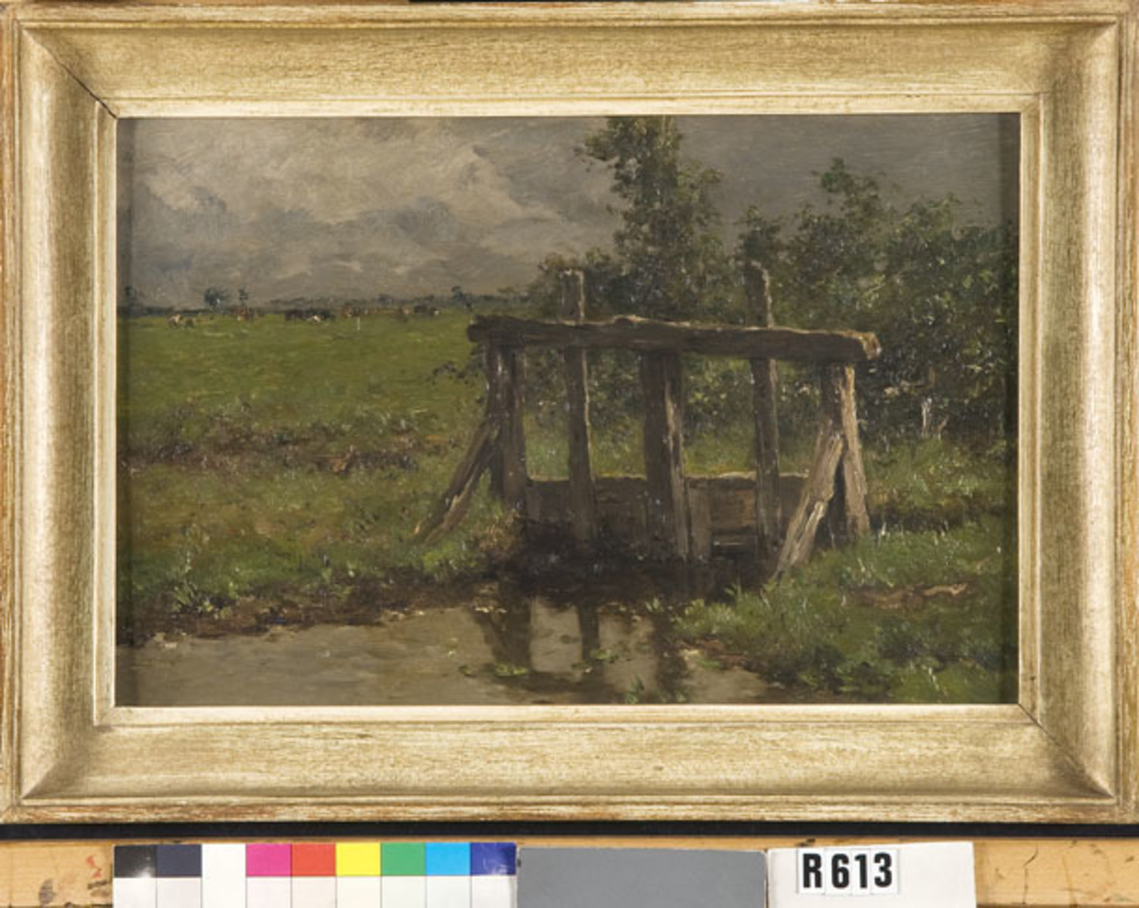 Houten sluis in weiland
