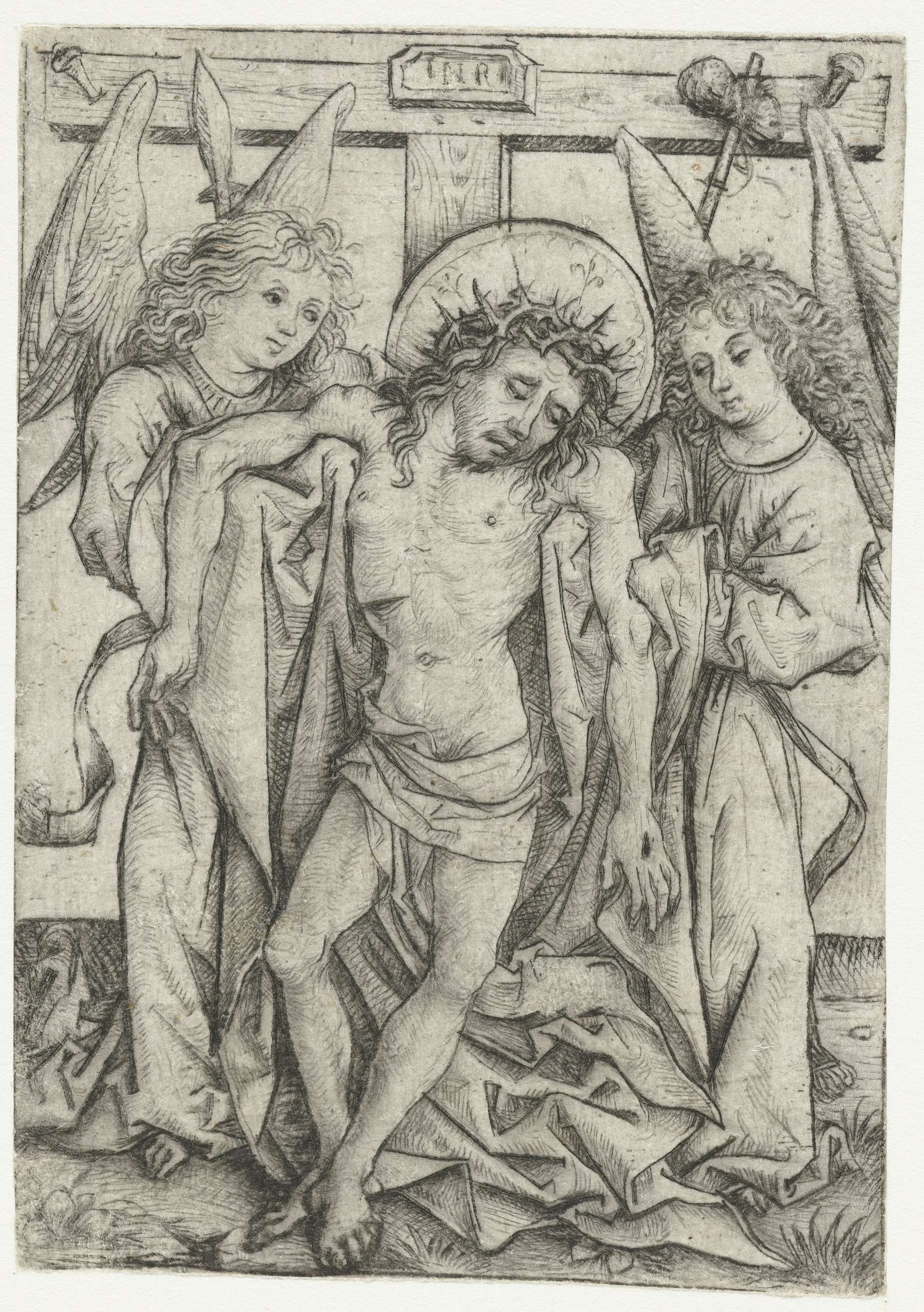 Het lichaam van Christus ondersteund door twee engelen