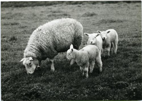 Foto in zwart-wit van een schaap en twee lammeren do...
