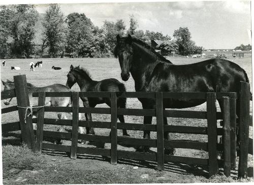 Foto in zwart-wit een paard bij een hek door J.D. de...