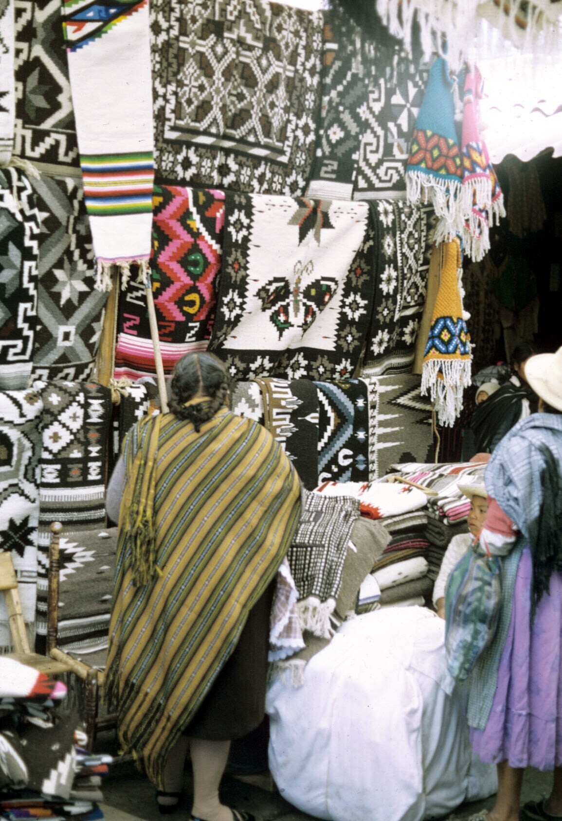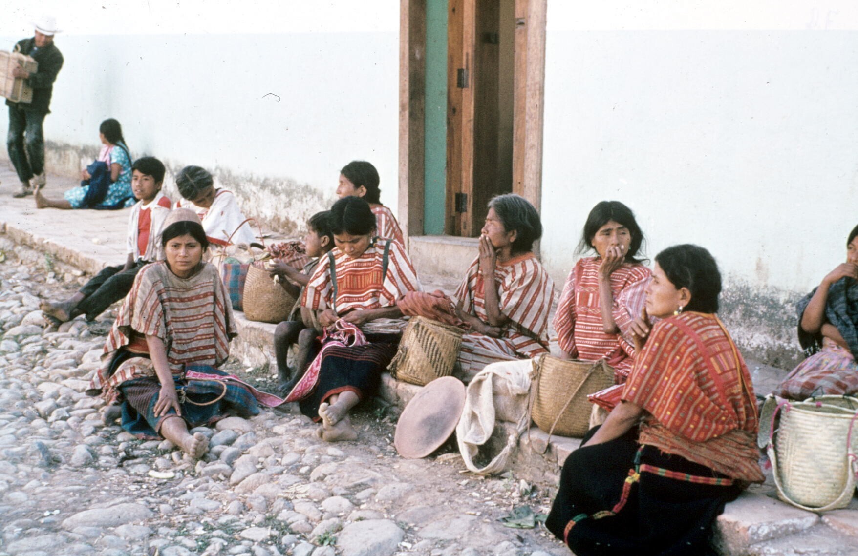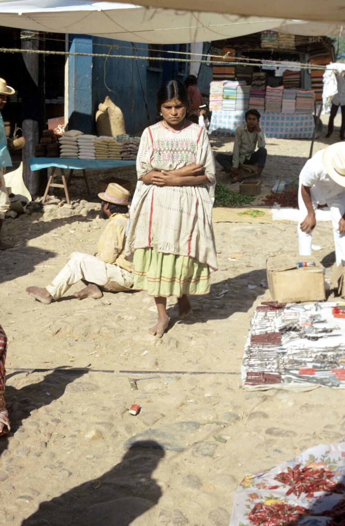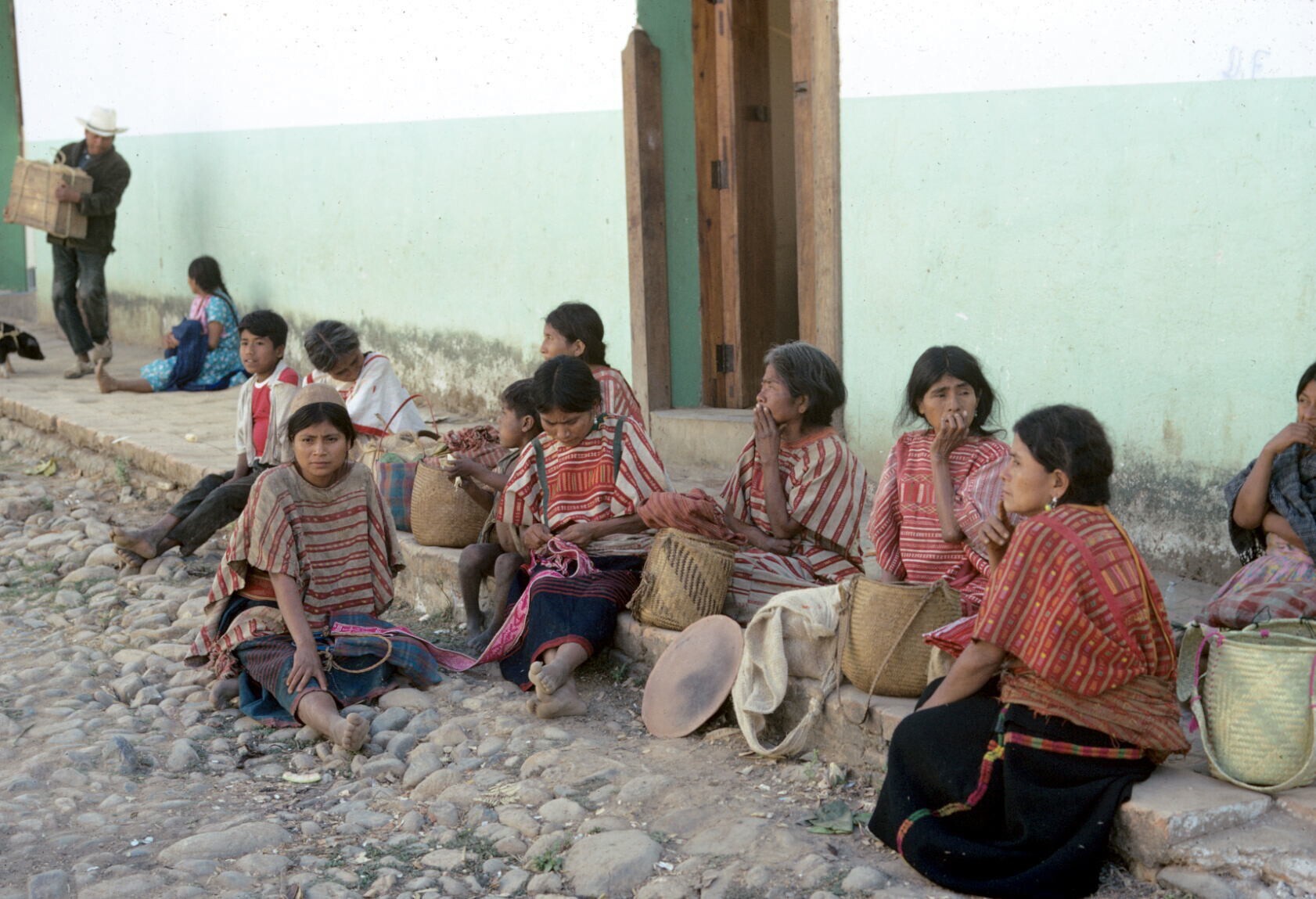 Trique vrouwen op markt, een van hen faja (ceintuur)...
