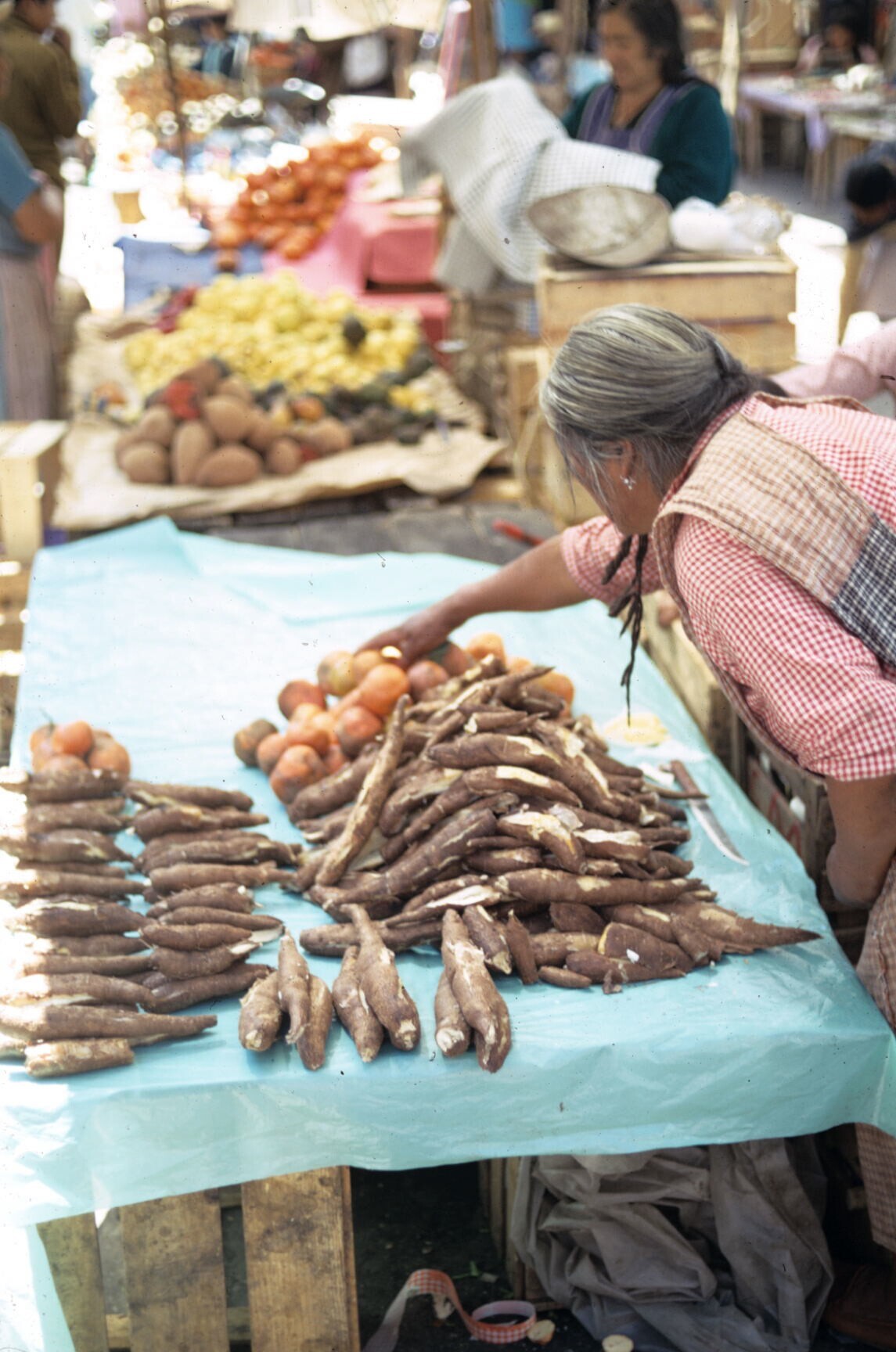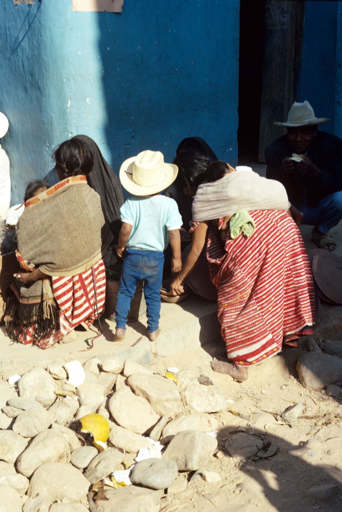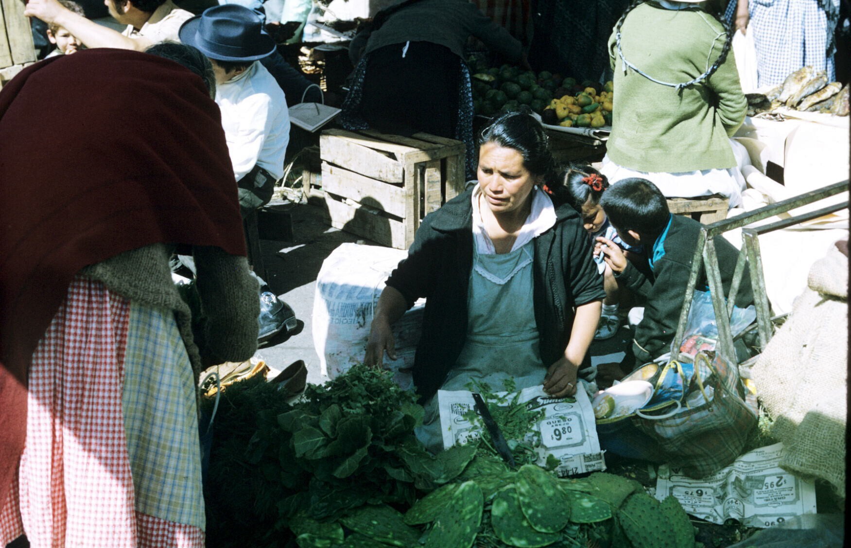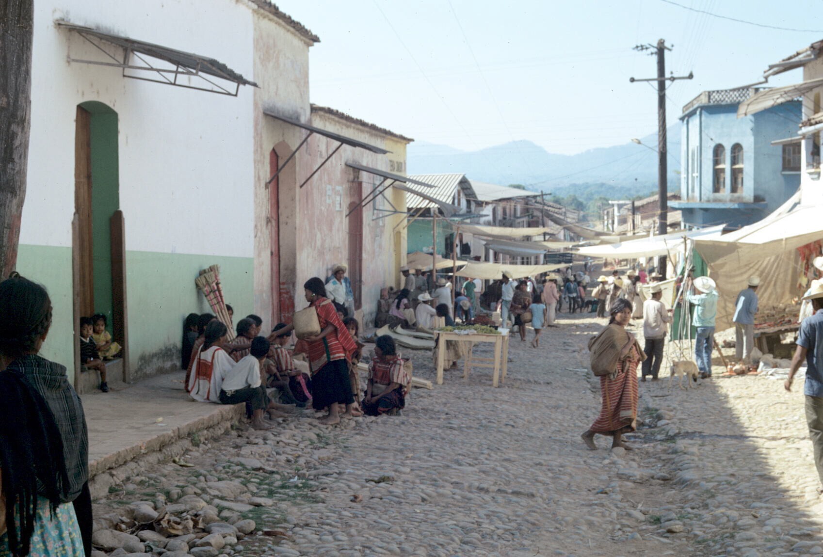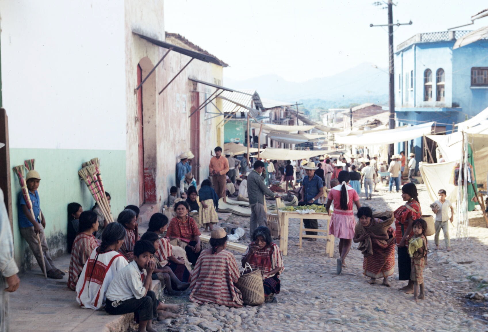 Trique vrouwen op markt, een van hen faja (ceintuur)...