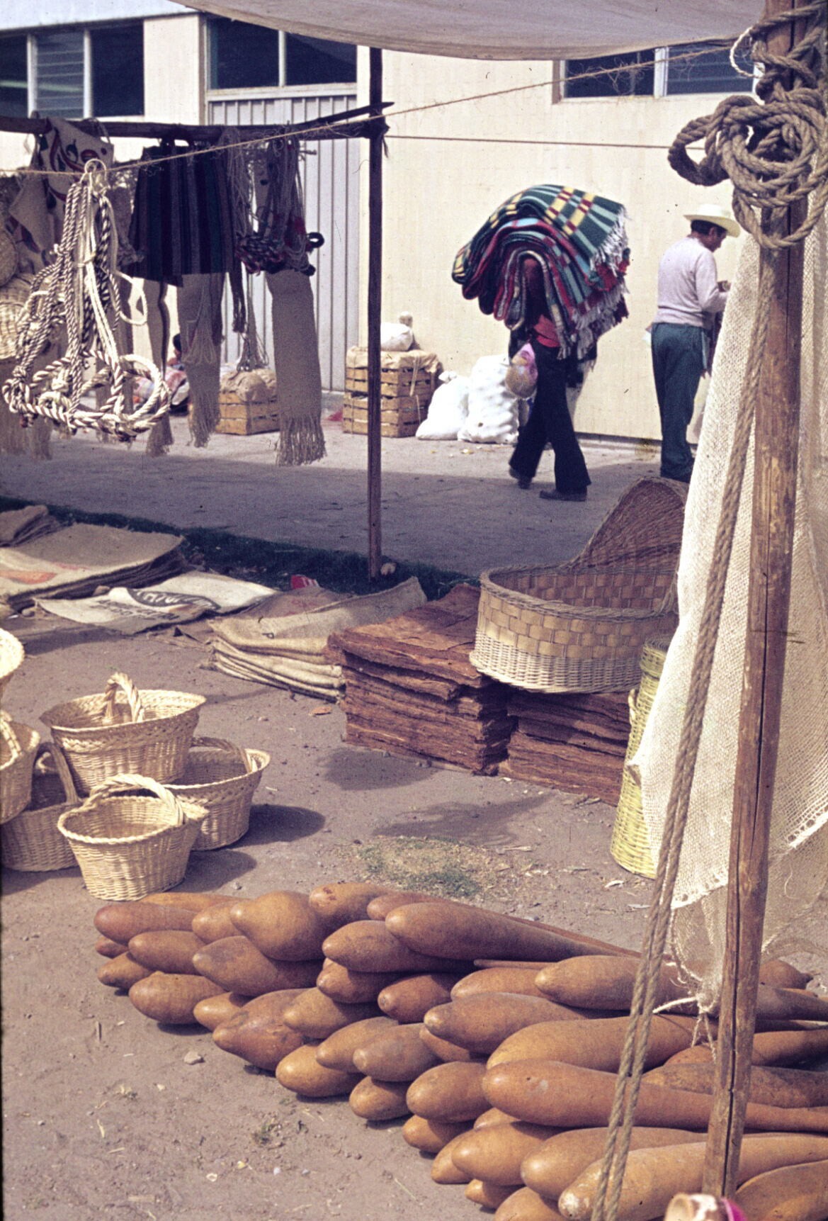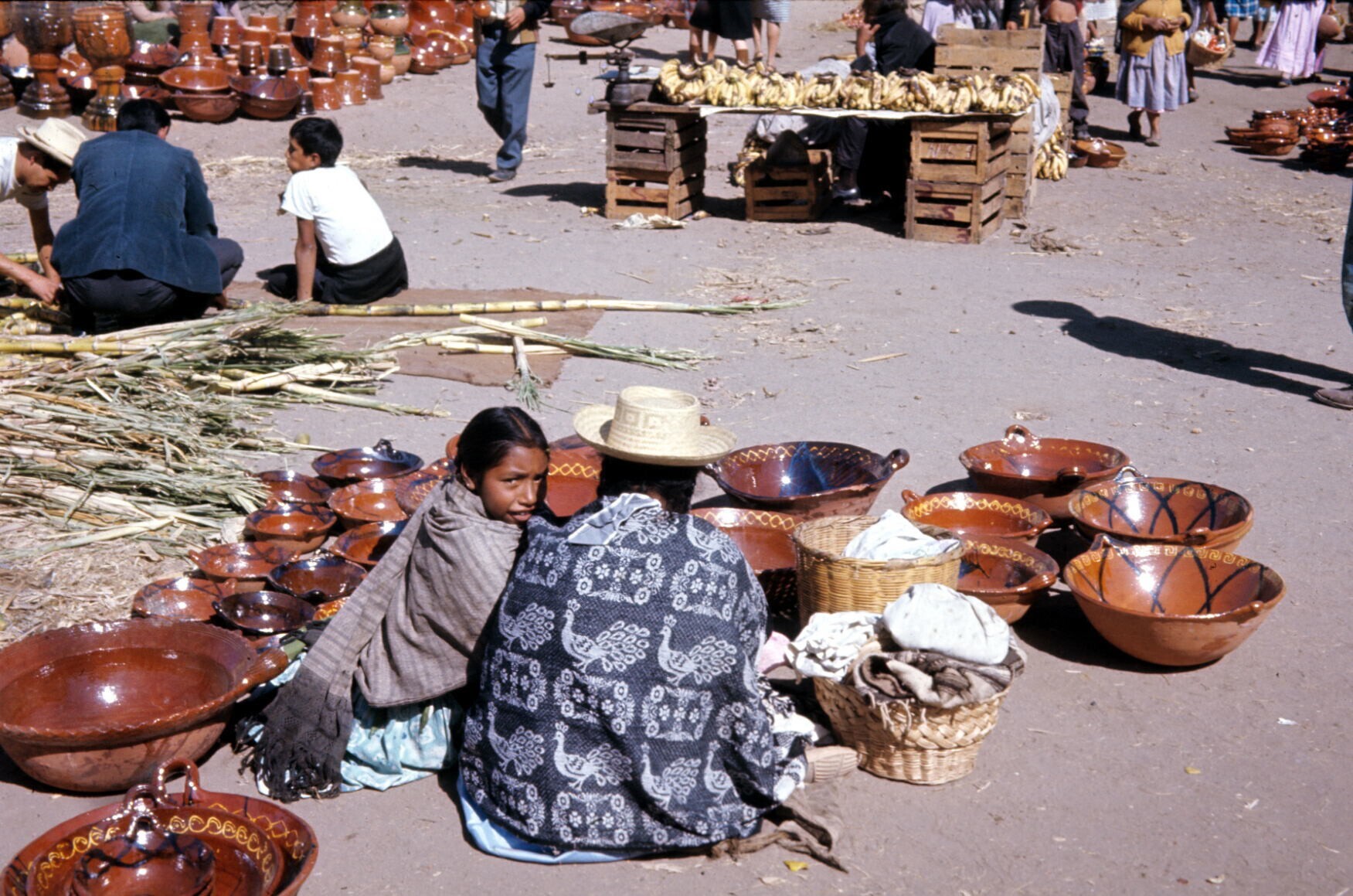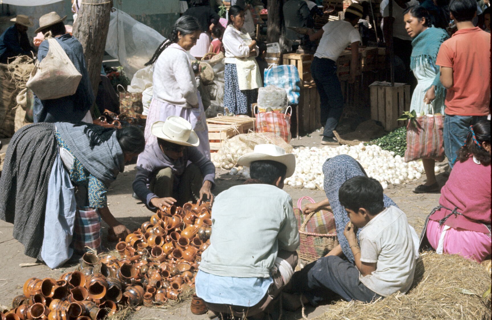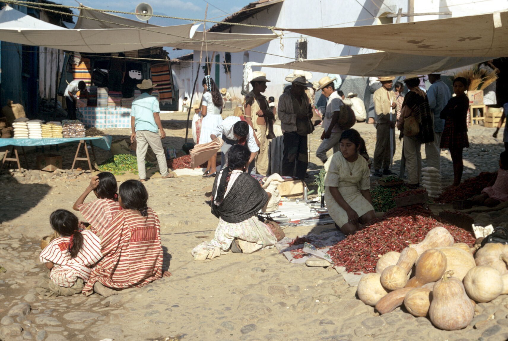 Trique vrouwen op markt; NB halve kalebas als hoofdd...