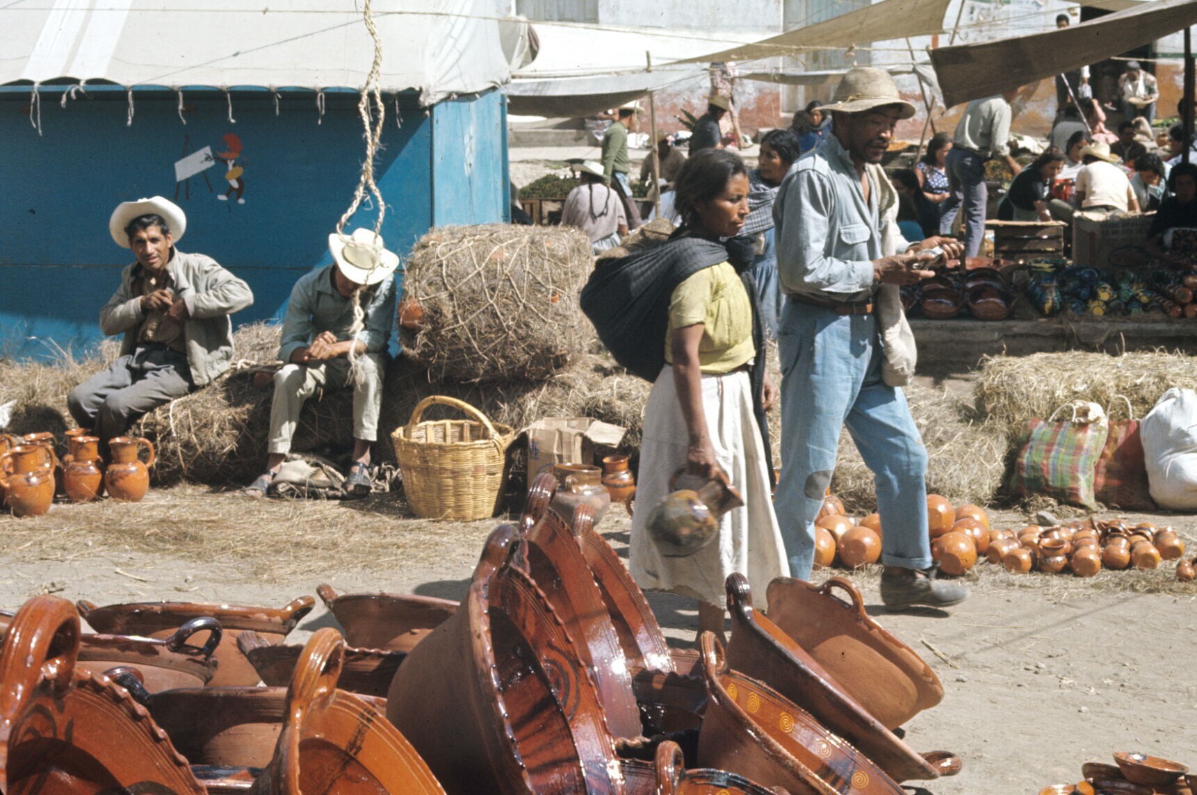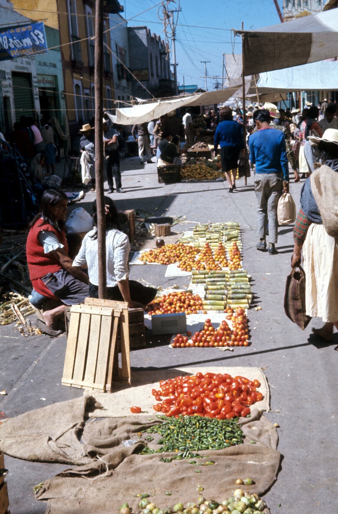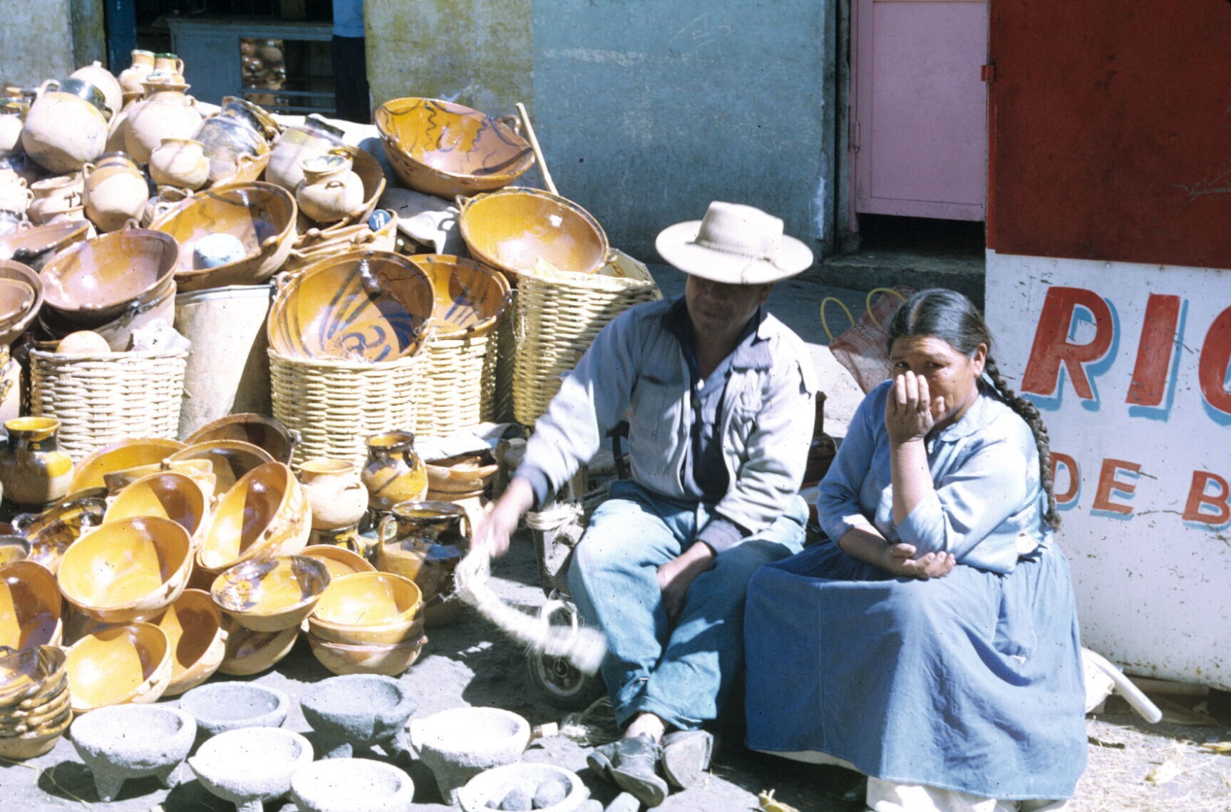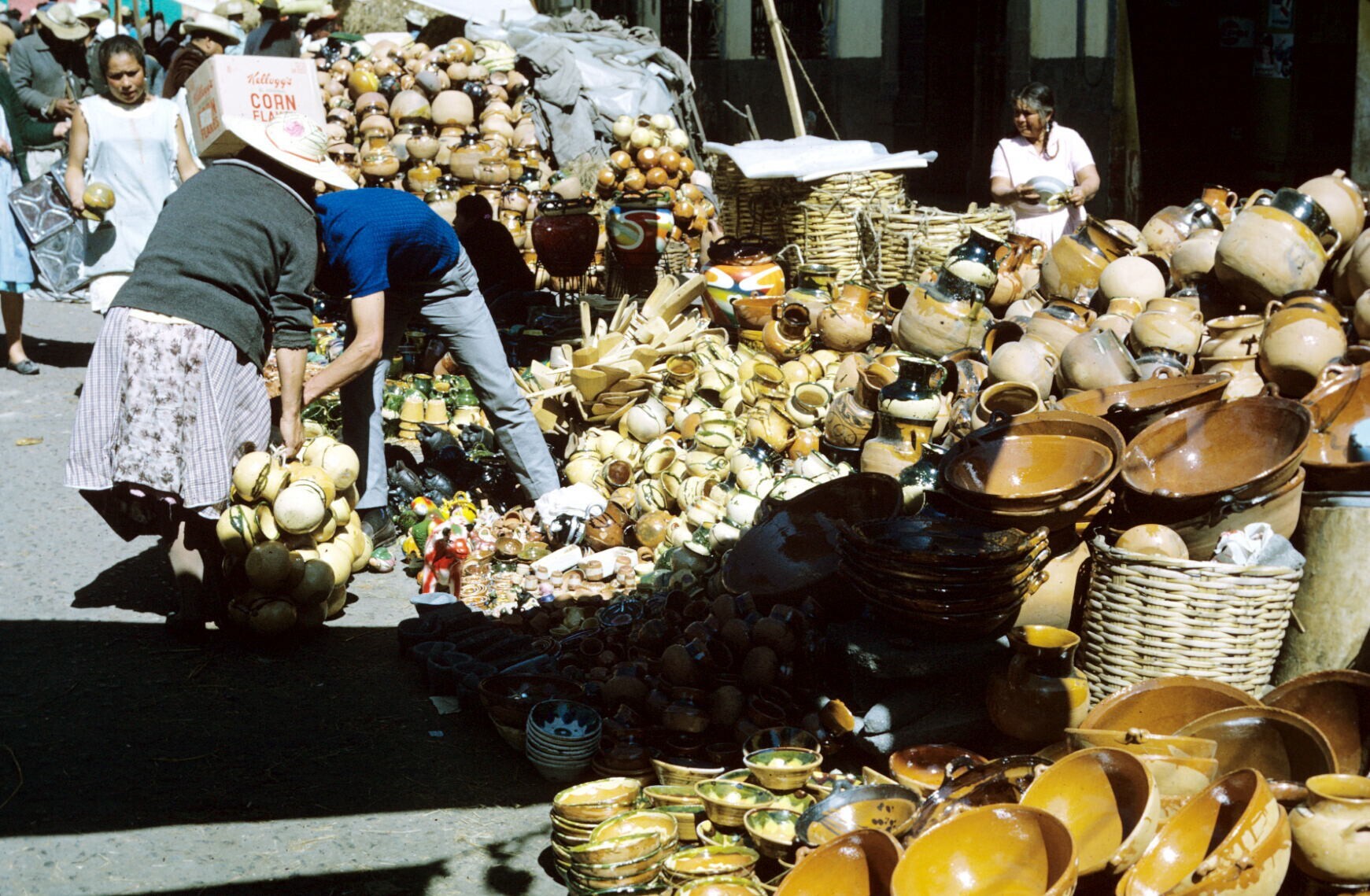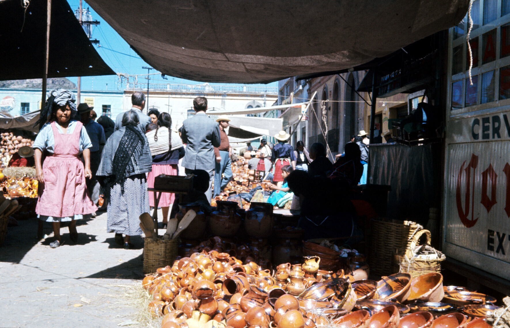 Trique vrouwen op markt; NB halve kalebas als hoofdd...
