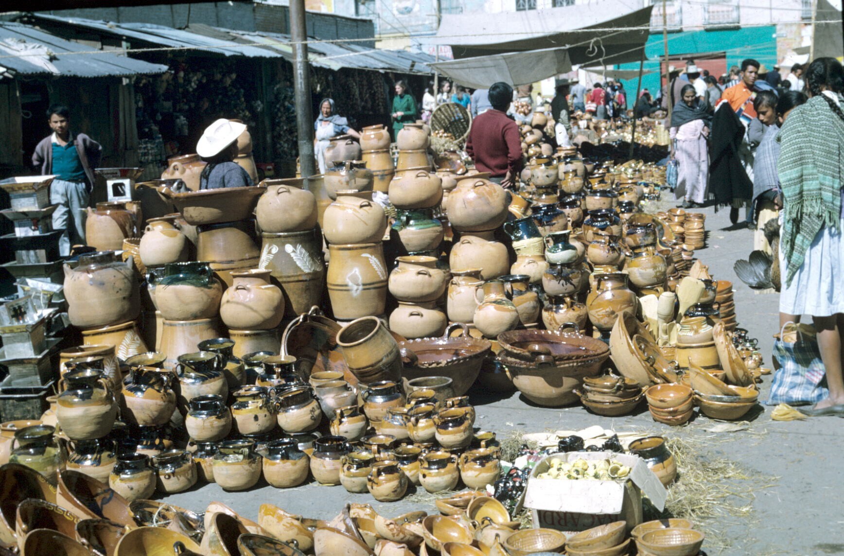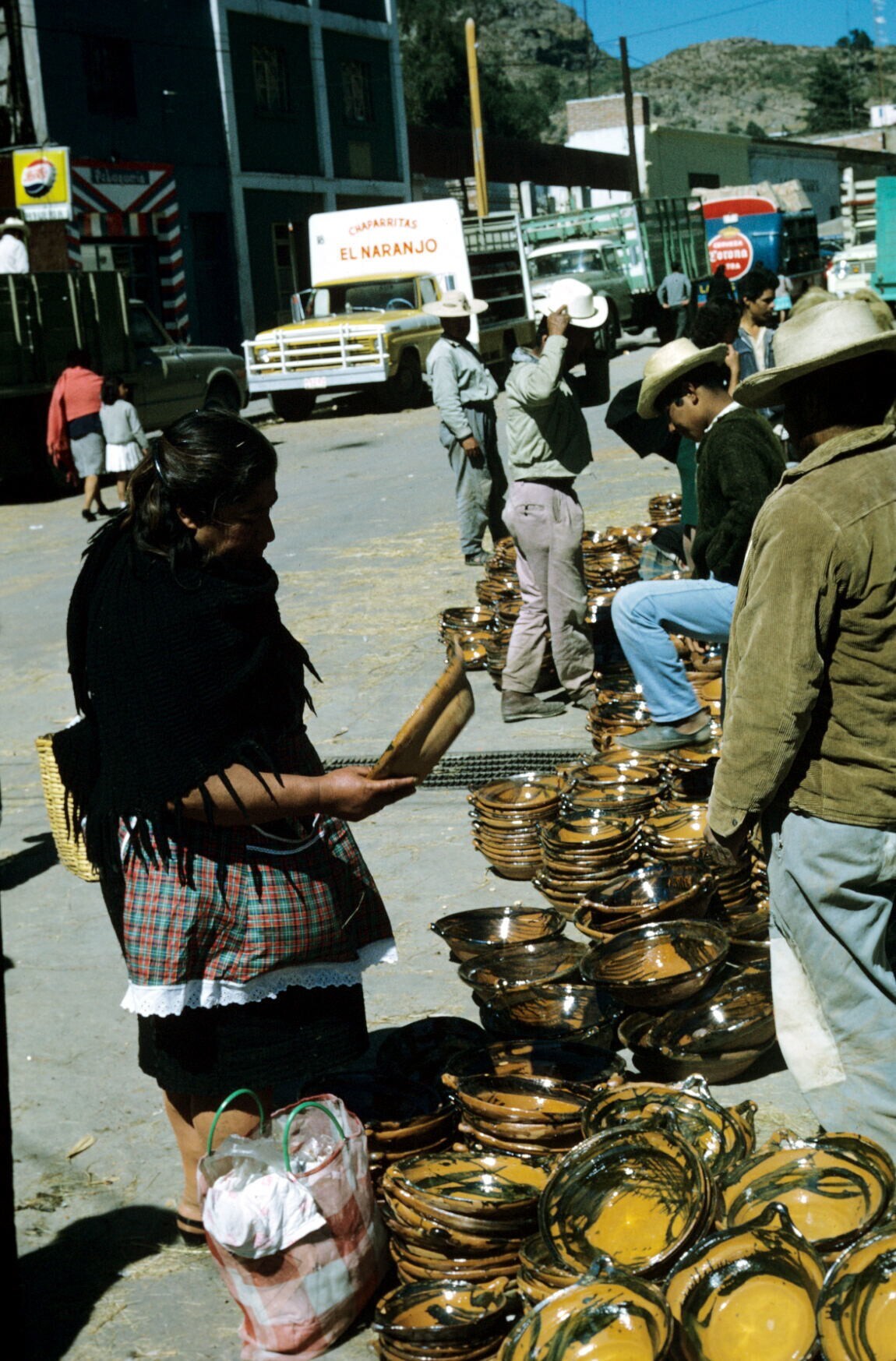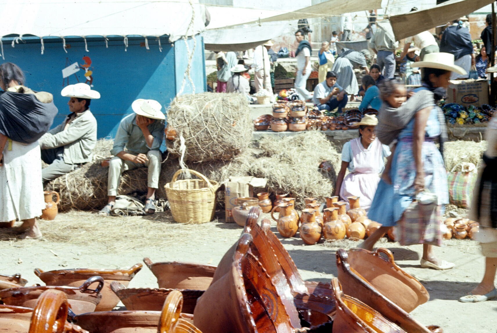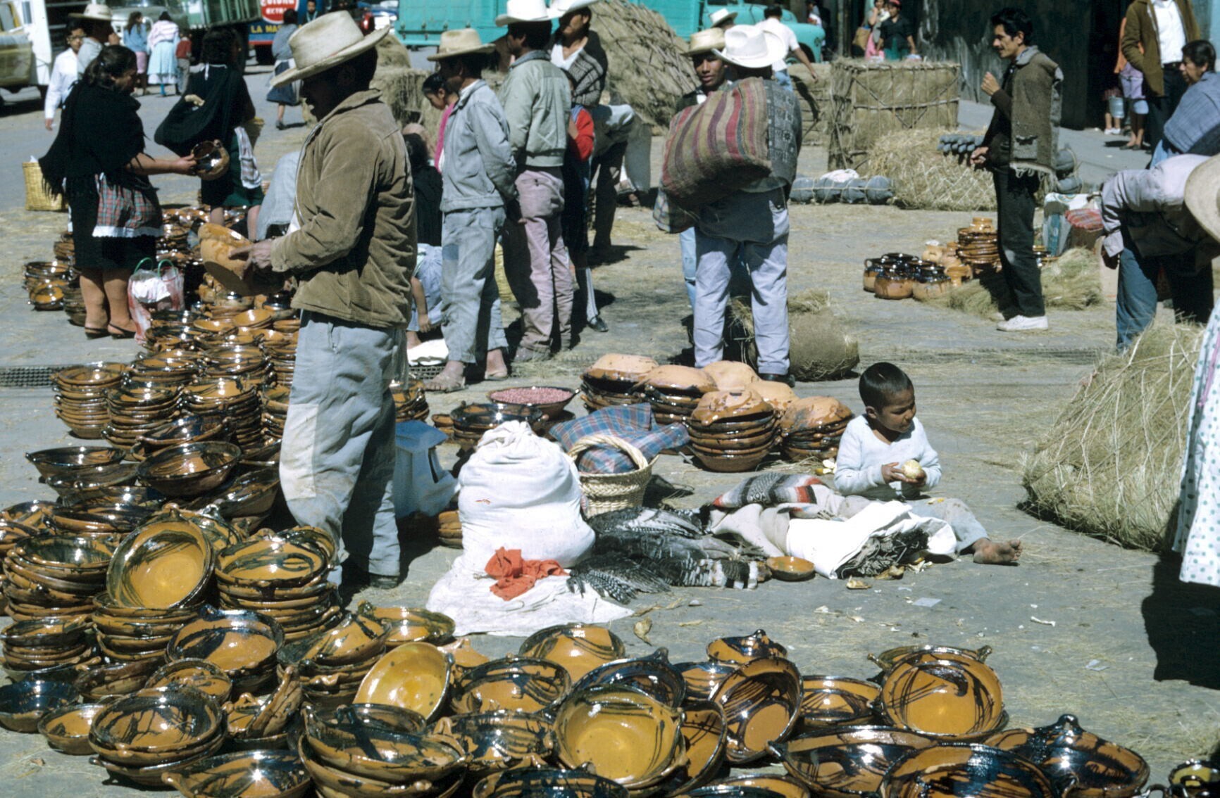 Trique vrouwen op markt; NB halve kalebas als hoofdd...