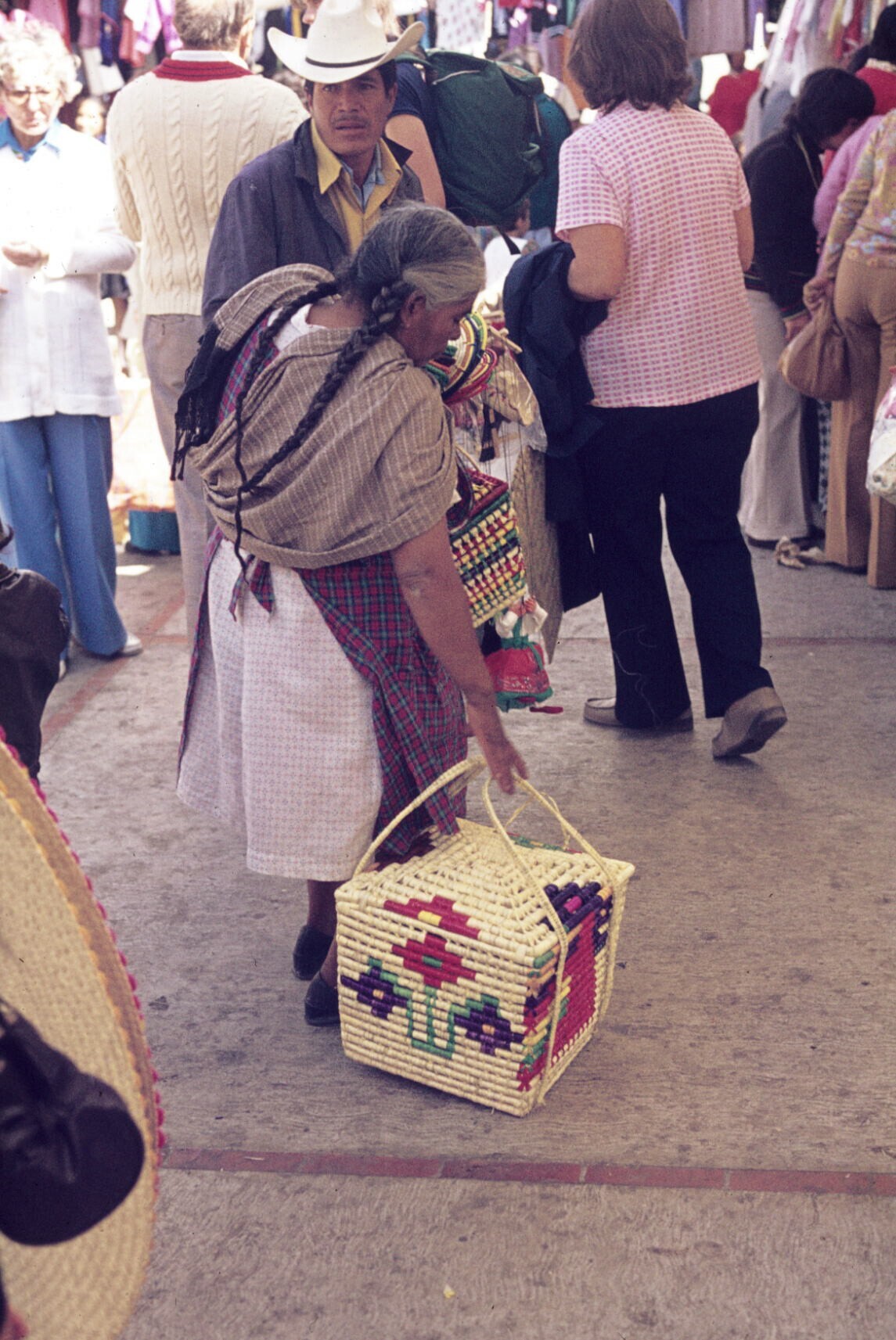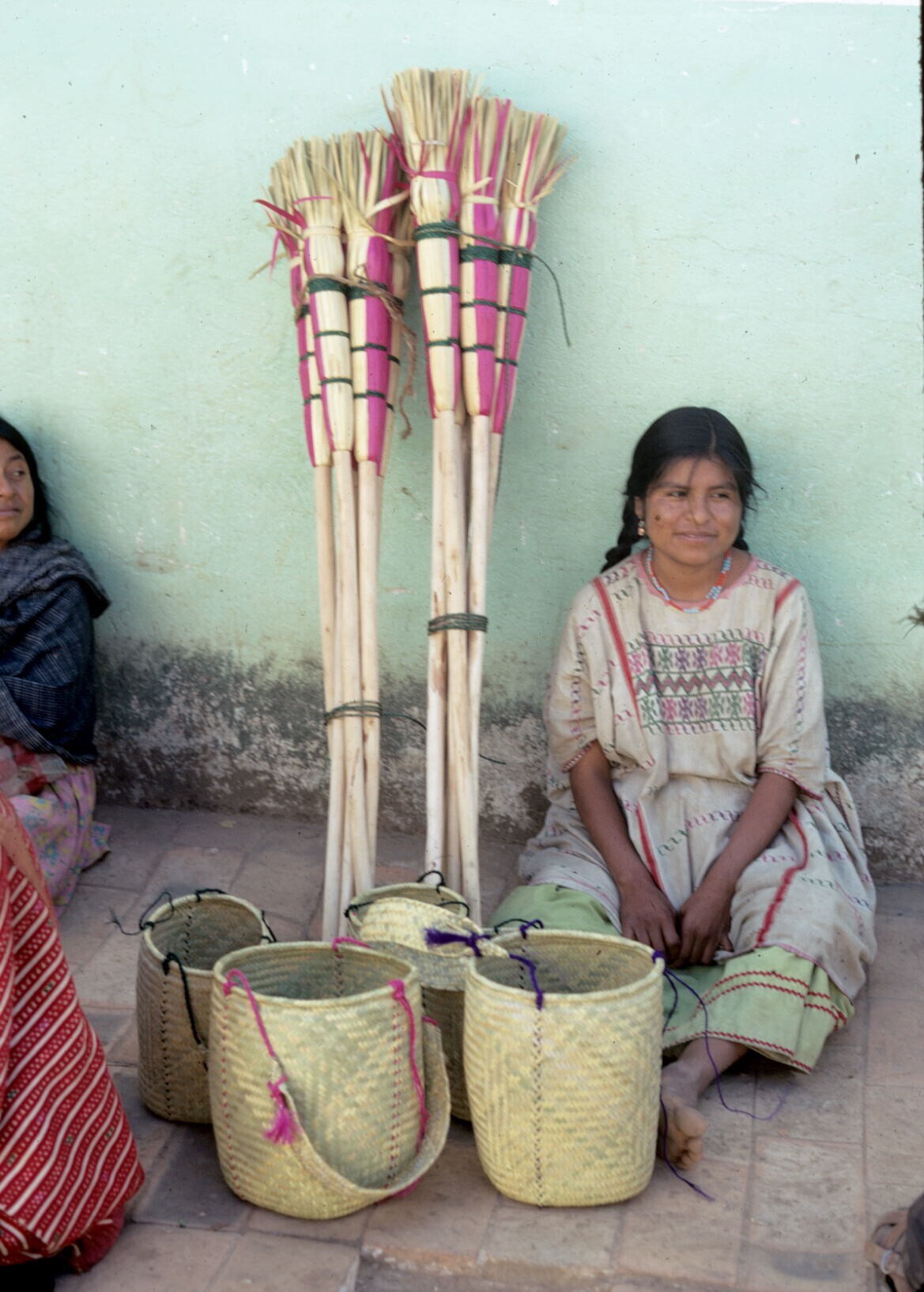 Amusgo vrouw met bezems en manden (canastas) voor ve...