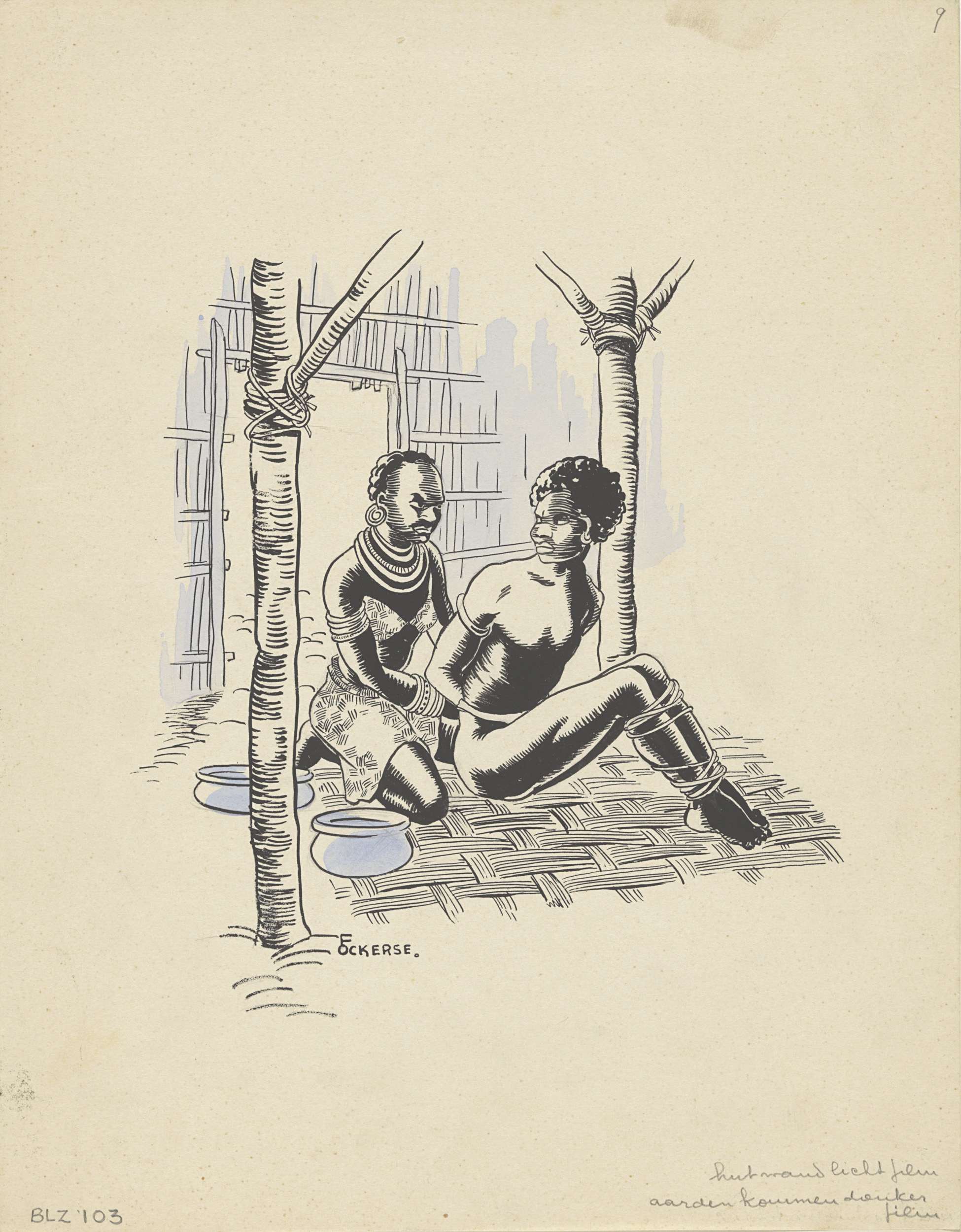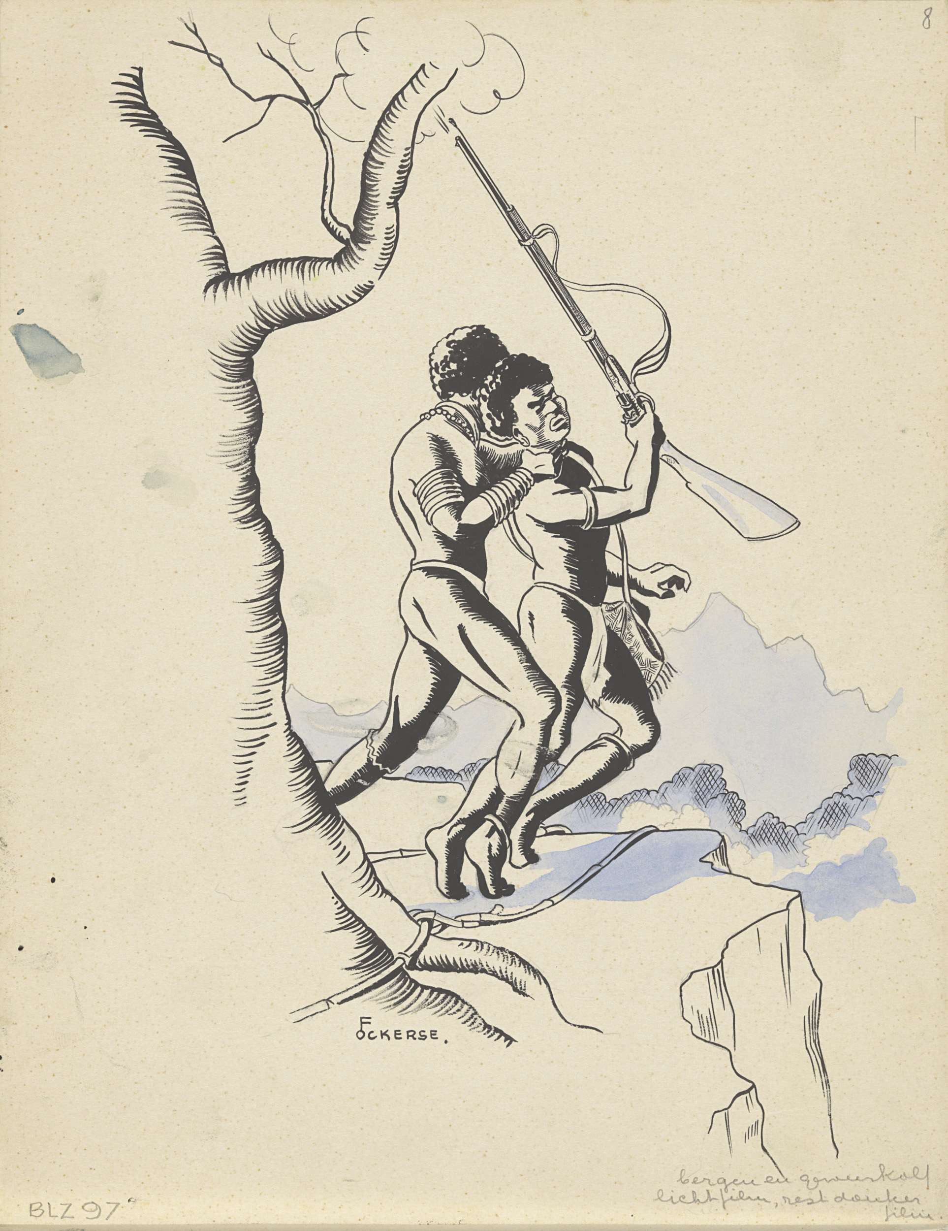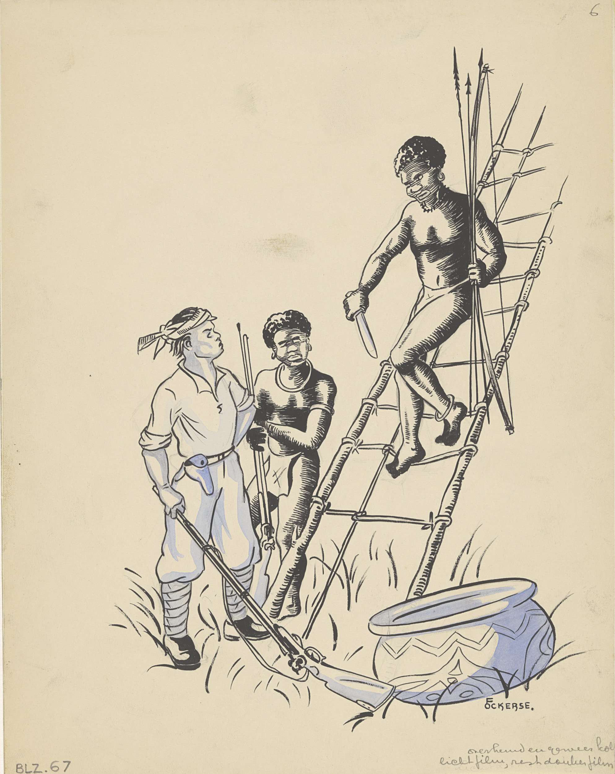 Nieuw-Guineese jager daalt af van een gevlochten ladder