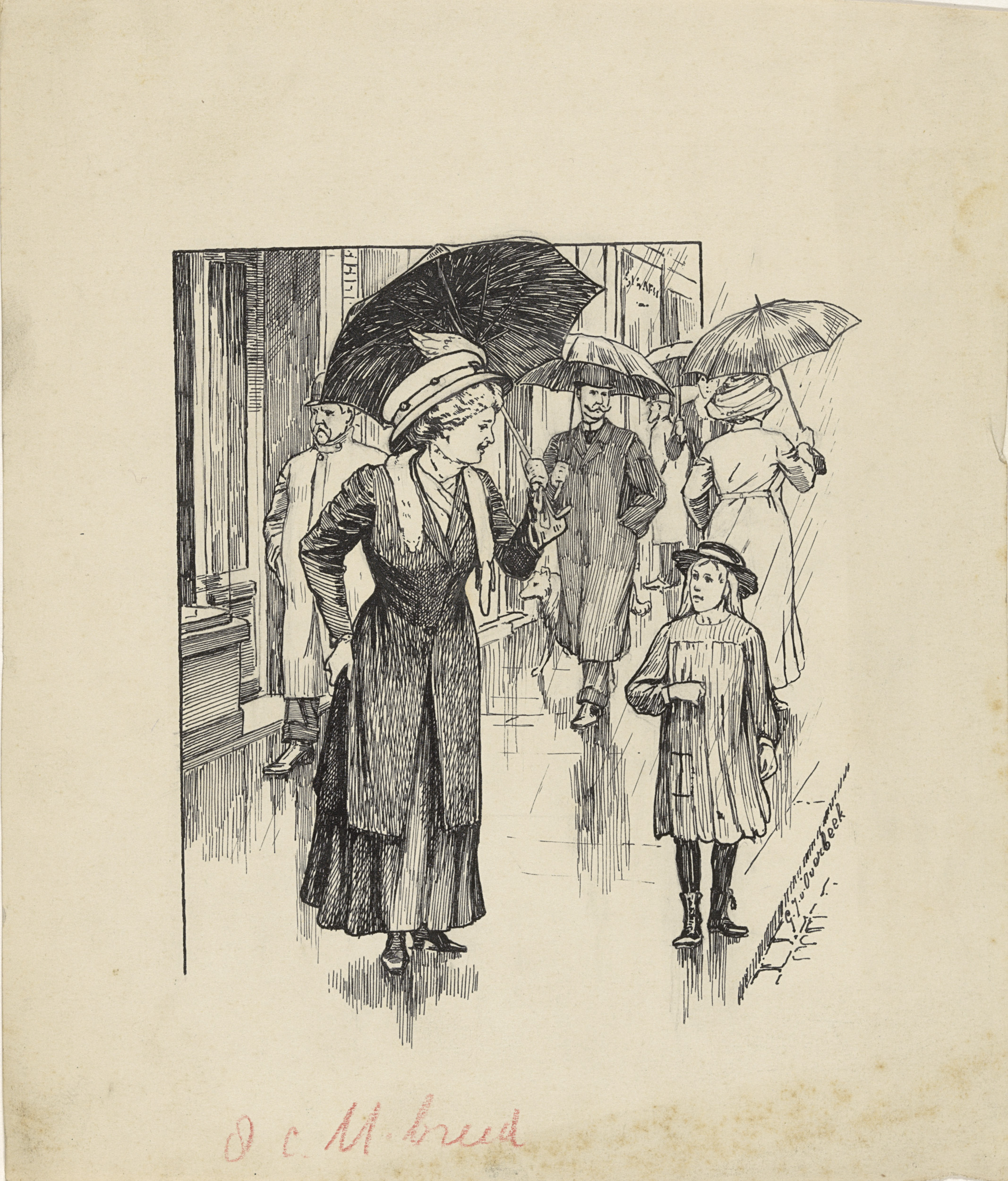 Vrouw en meisje op een regenachtige straat