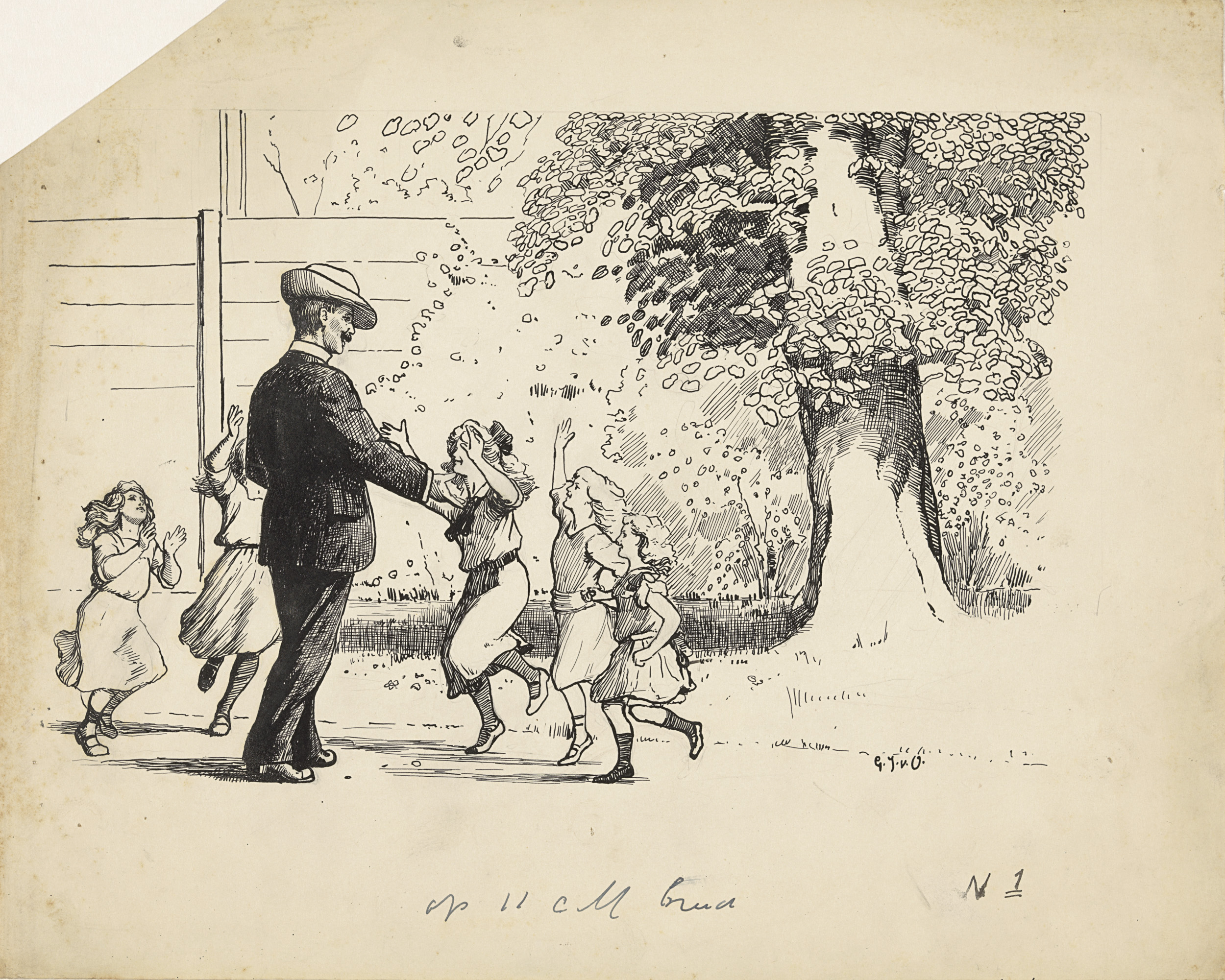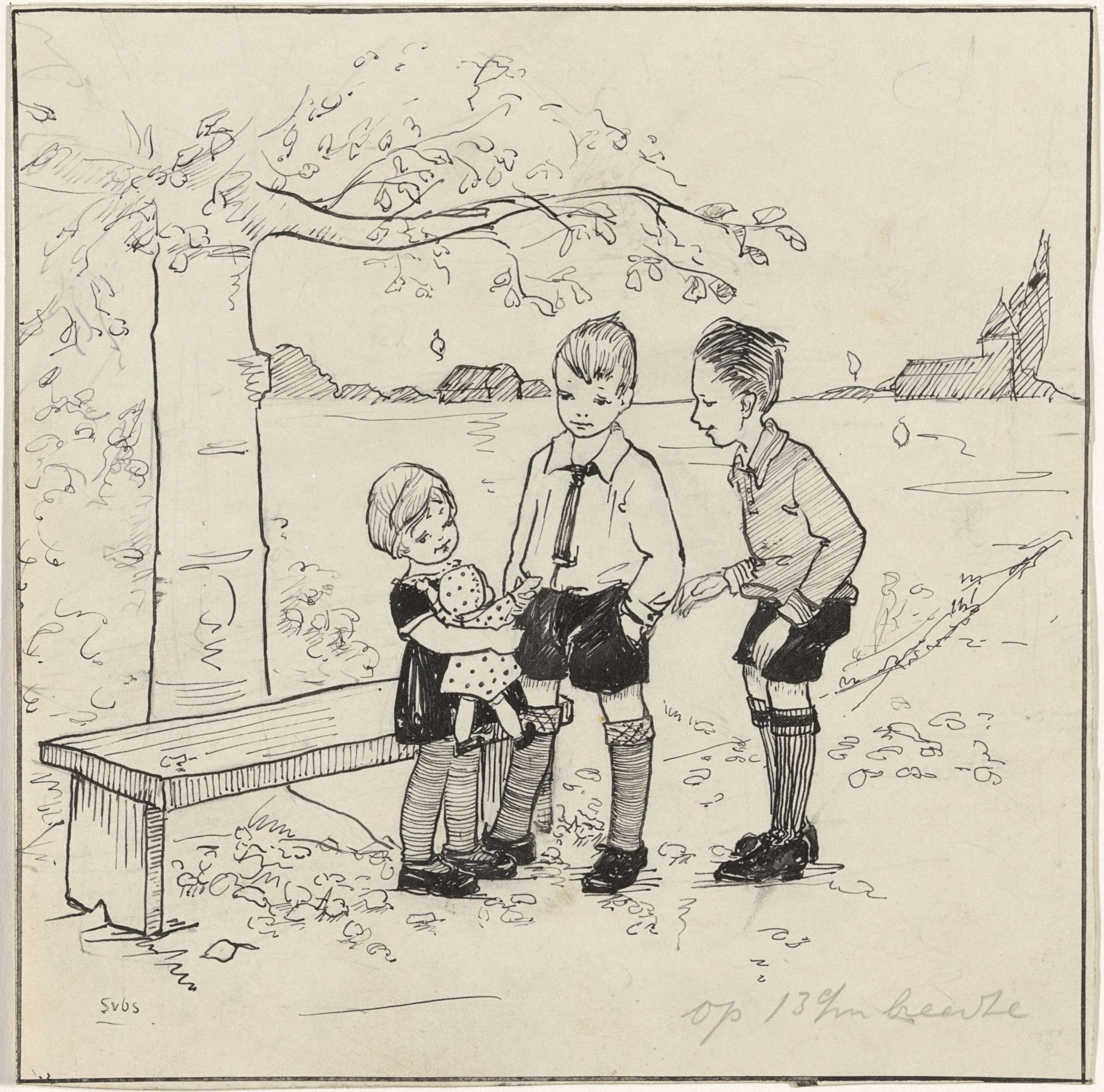 Meisje met pop en twee jongens bij een boom
