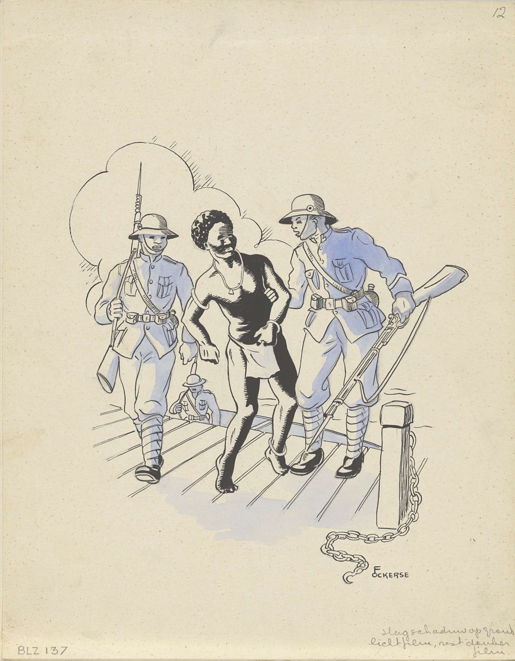 Twee soldaten nemen een Nieuw-Guineese man mee