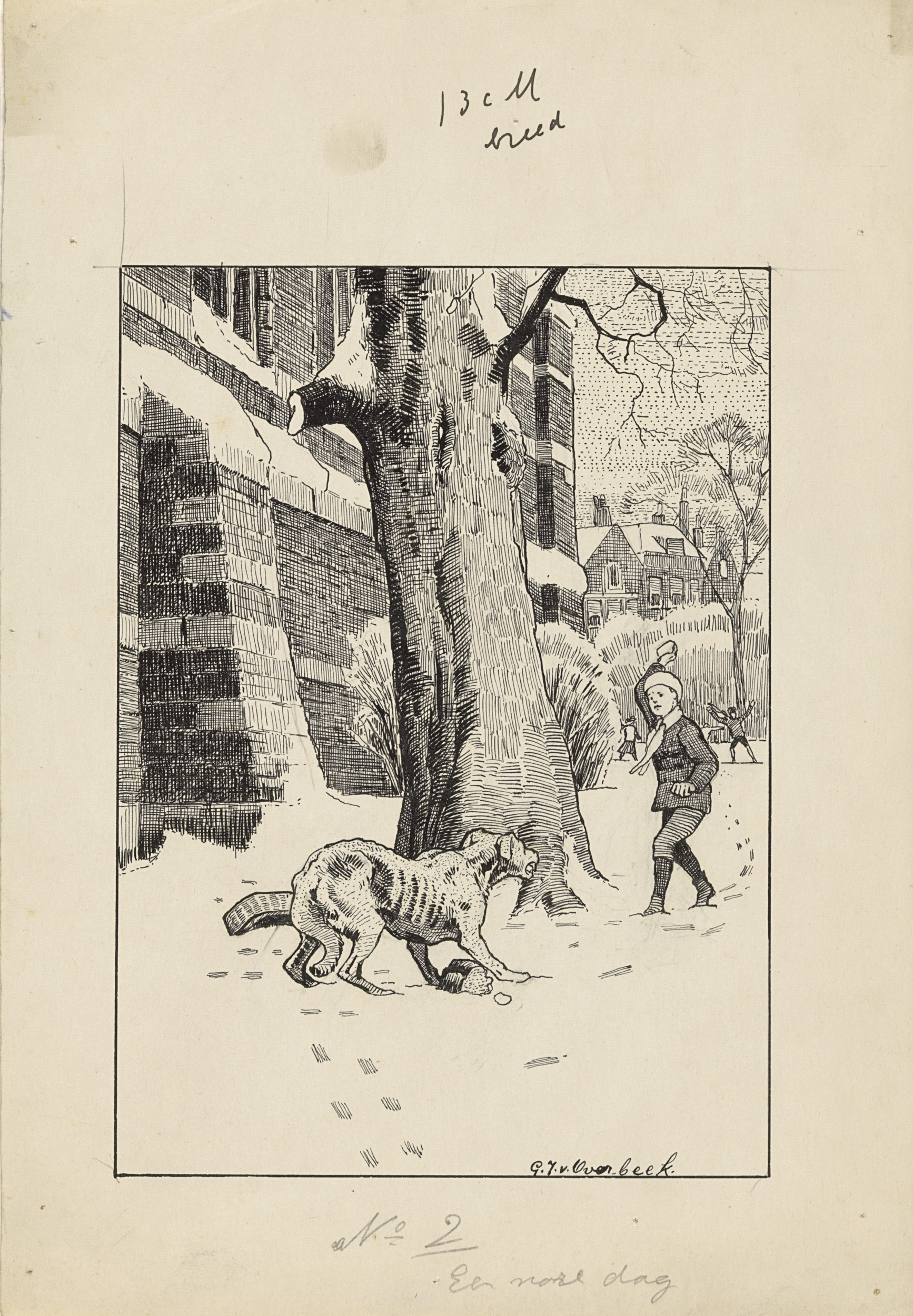 Jongen gooit een sneeuwbal richting een hond