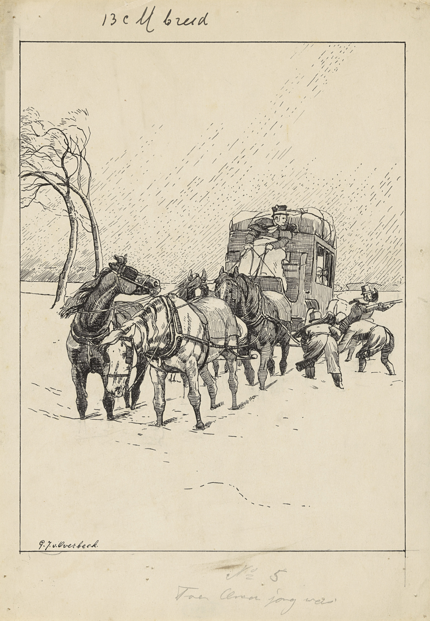 Vastgelopen paardenkoets in de sneeuw
