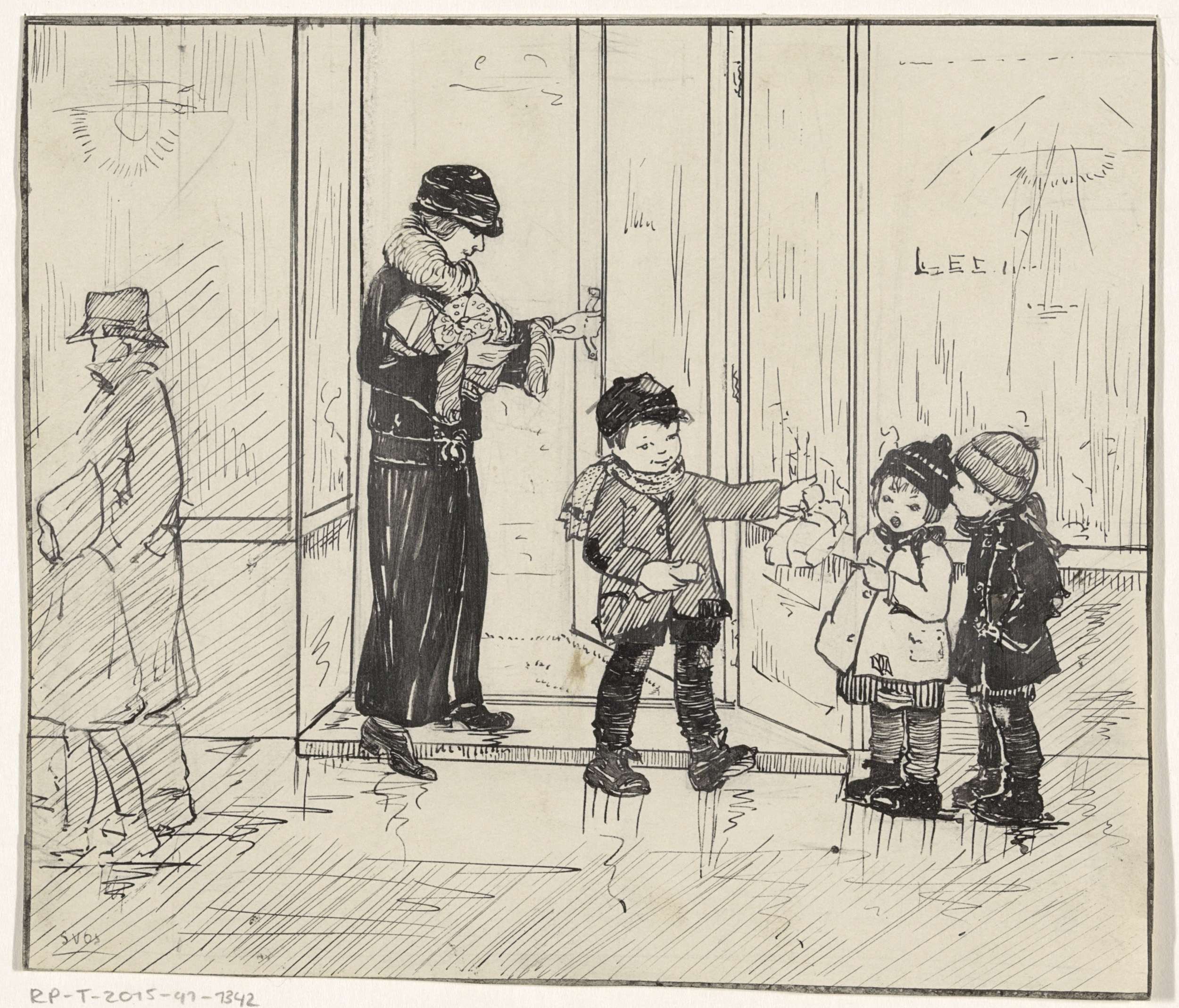 Jongen en moeder verlaten een winkel