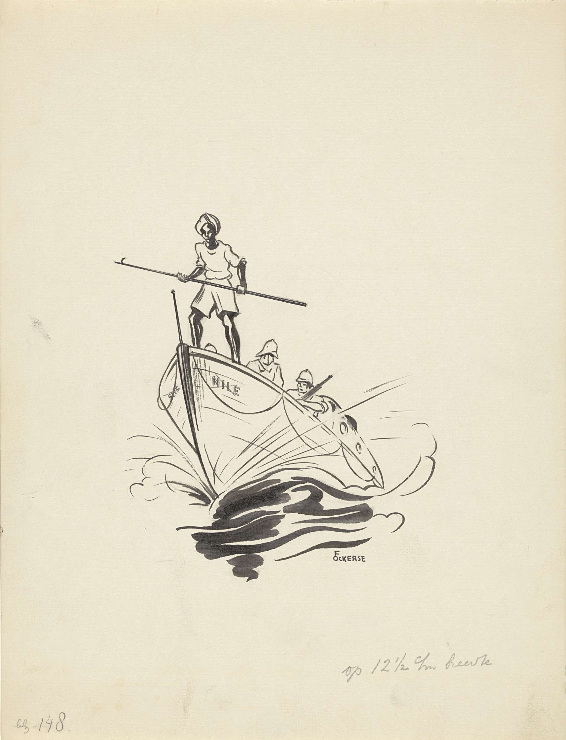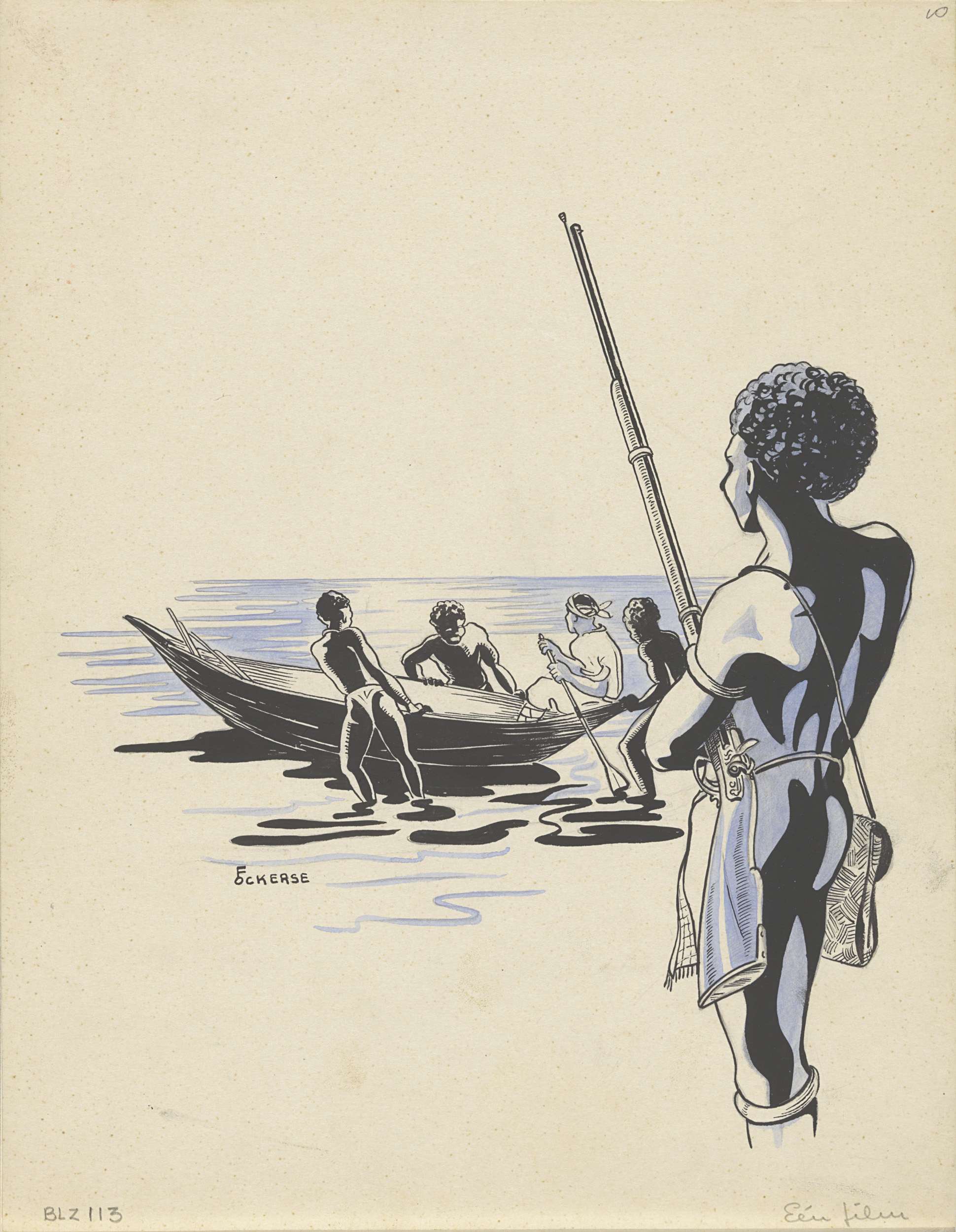 Nieuw-Guineese jager kijkt naar een vertrekkende boot