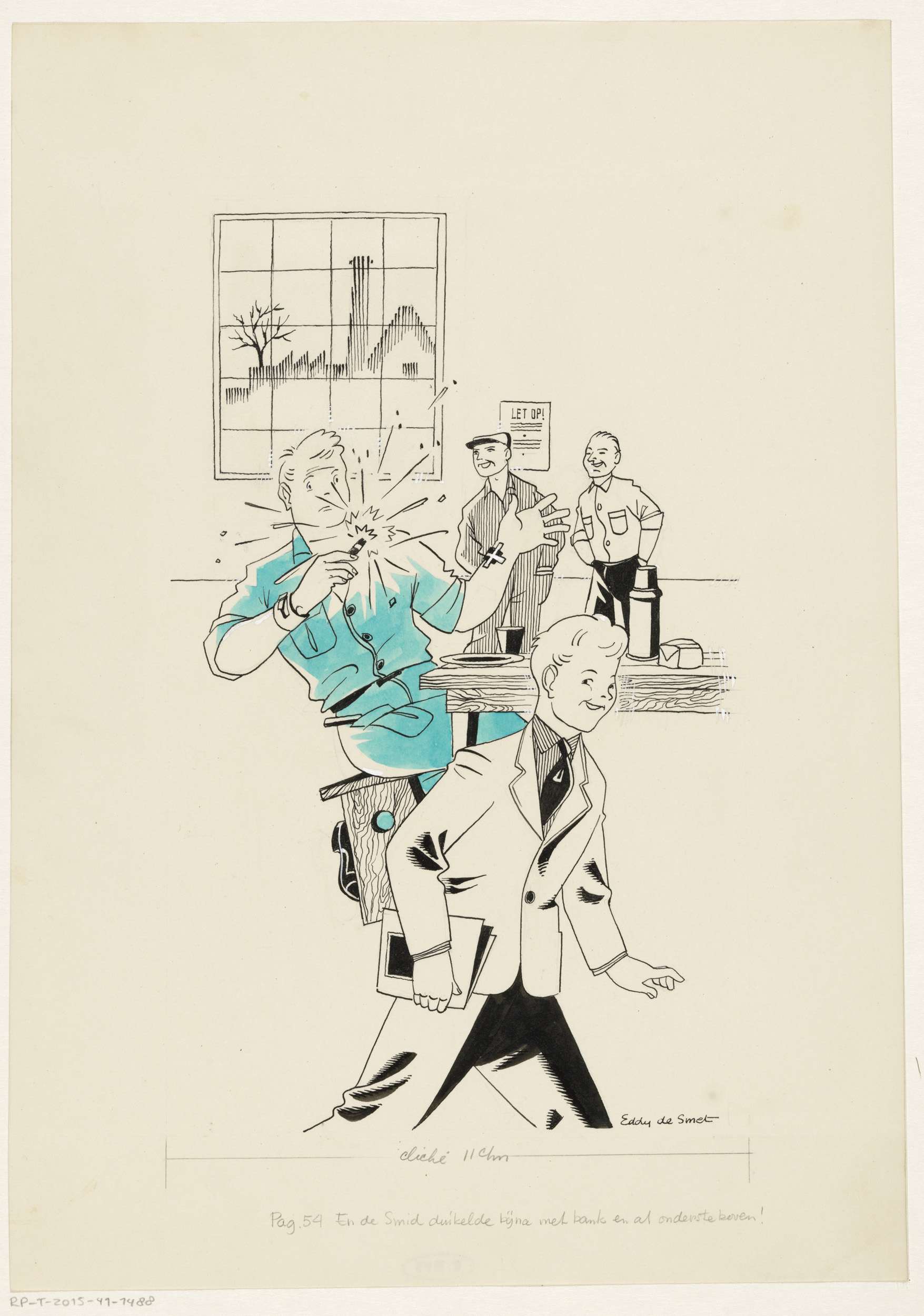 Dikkie houdt een krant omhoog in een klaslokaal