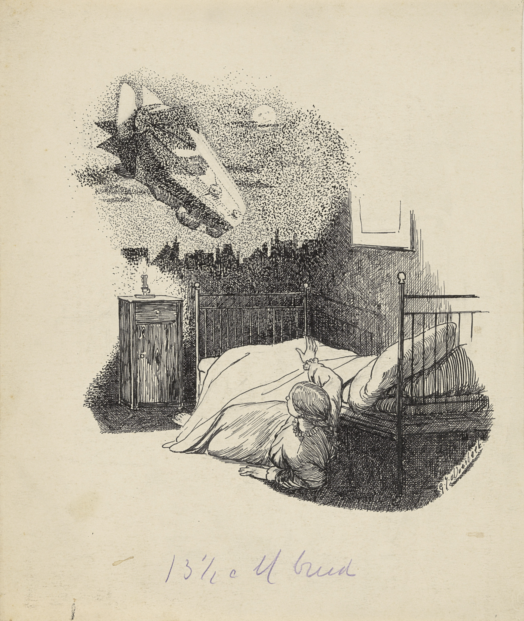 Meisje ziet een zeppelin vanuit bed