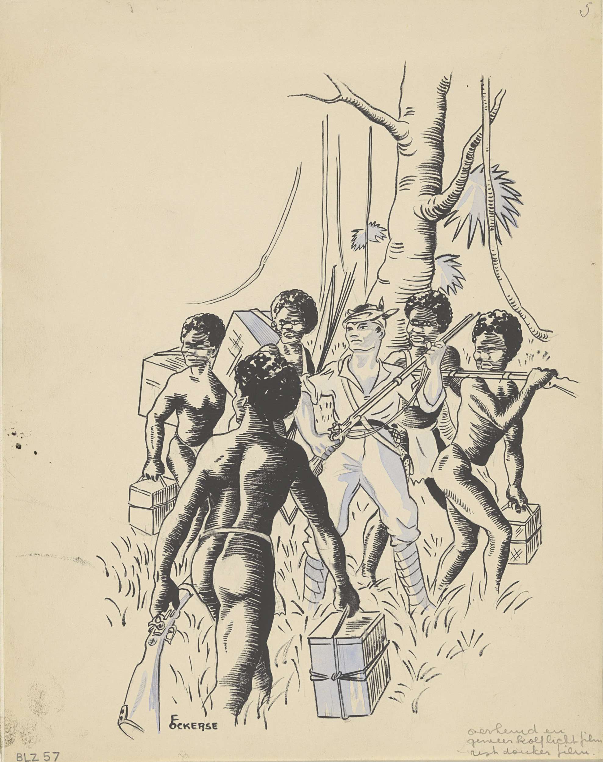 Witte man met vuurwapen tussen de Nieuw-Guineeërs