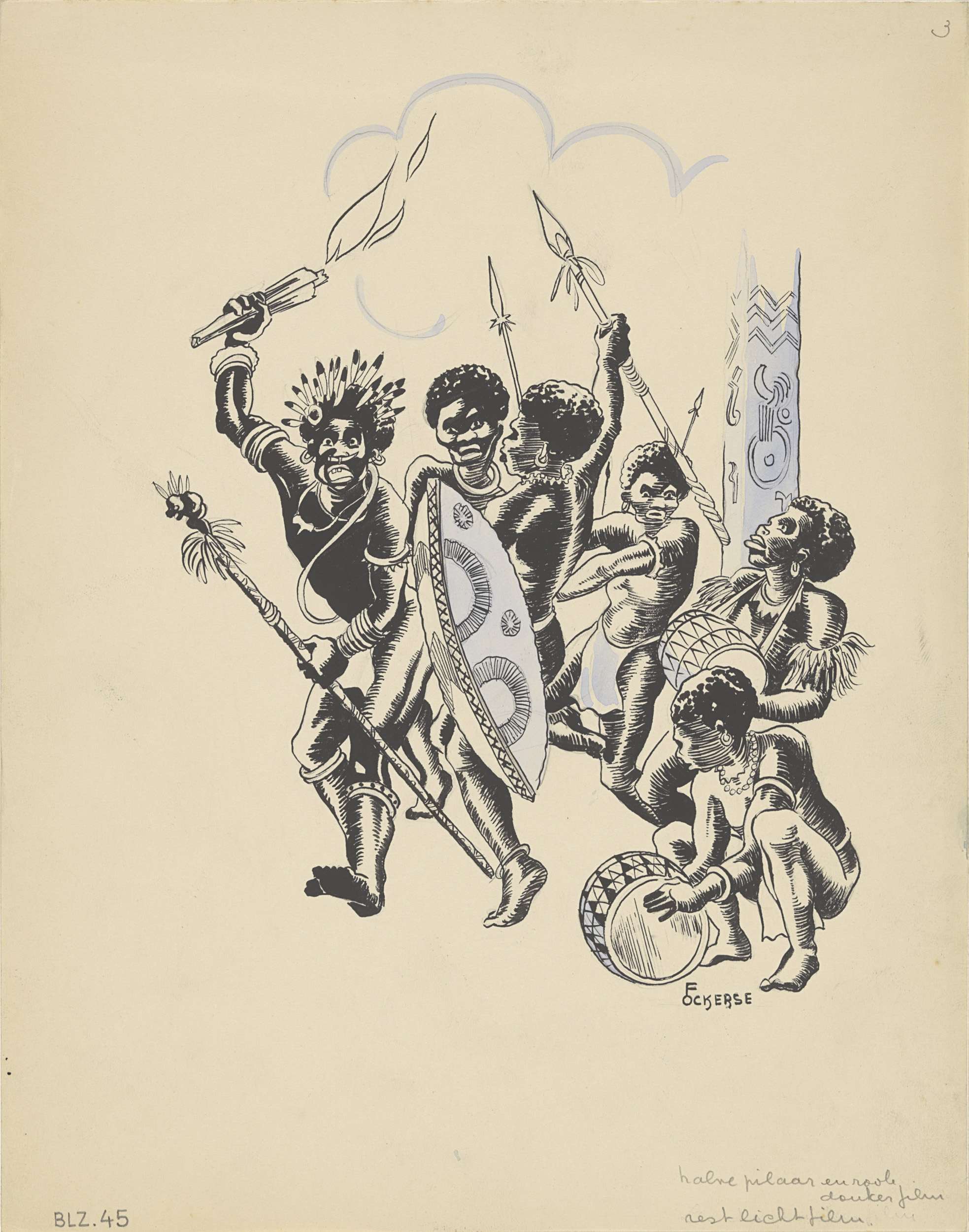 Nieuw-Guinees volk dansend rond een totempaal