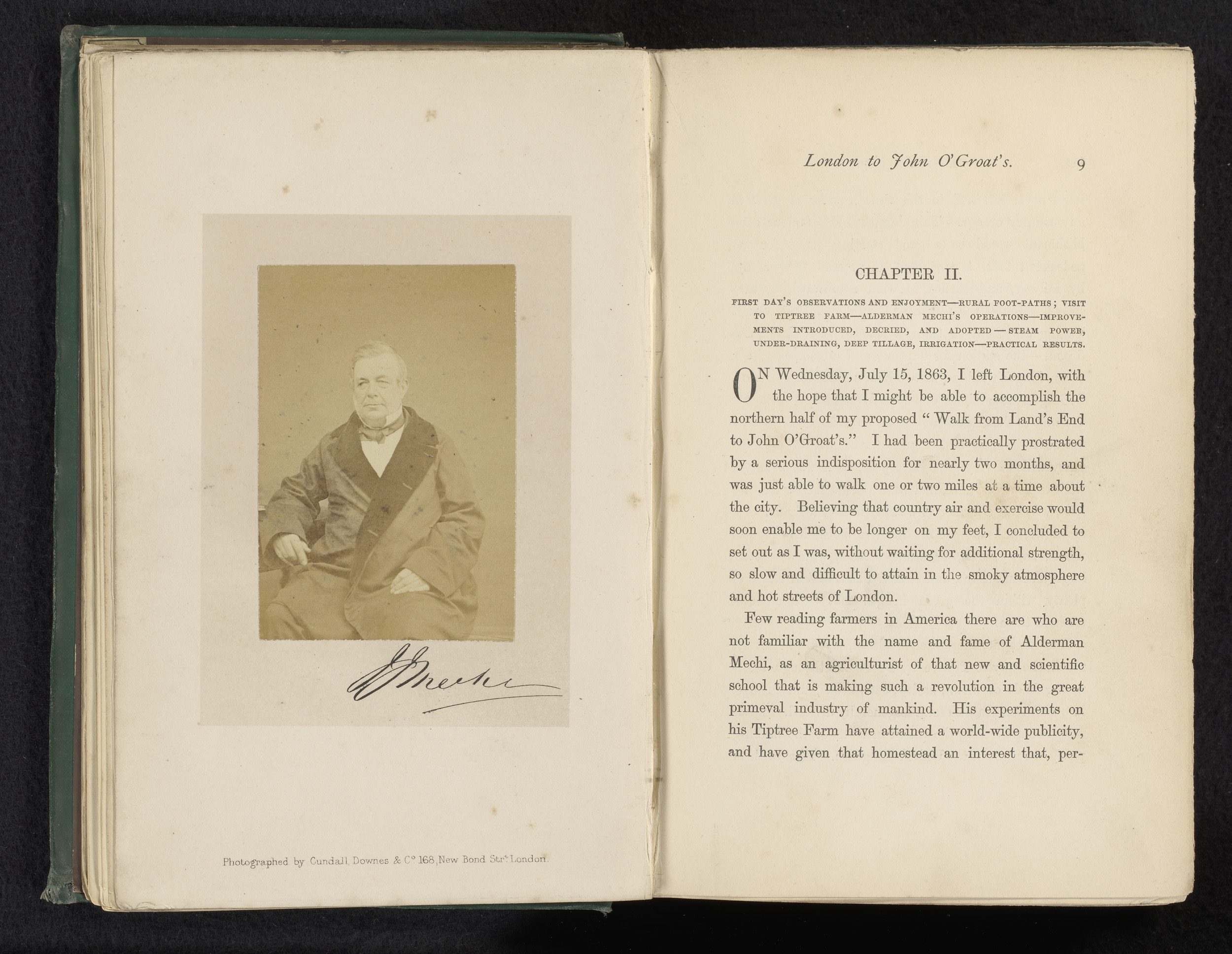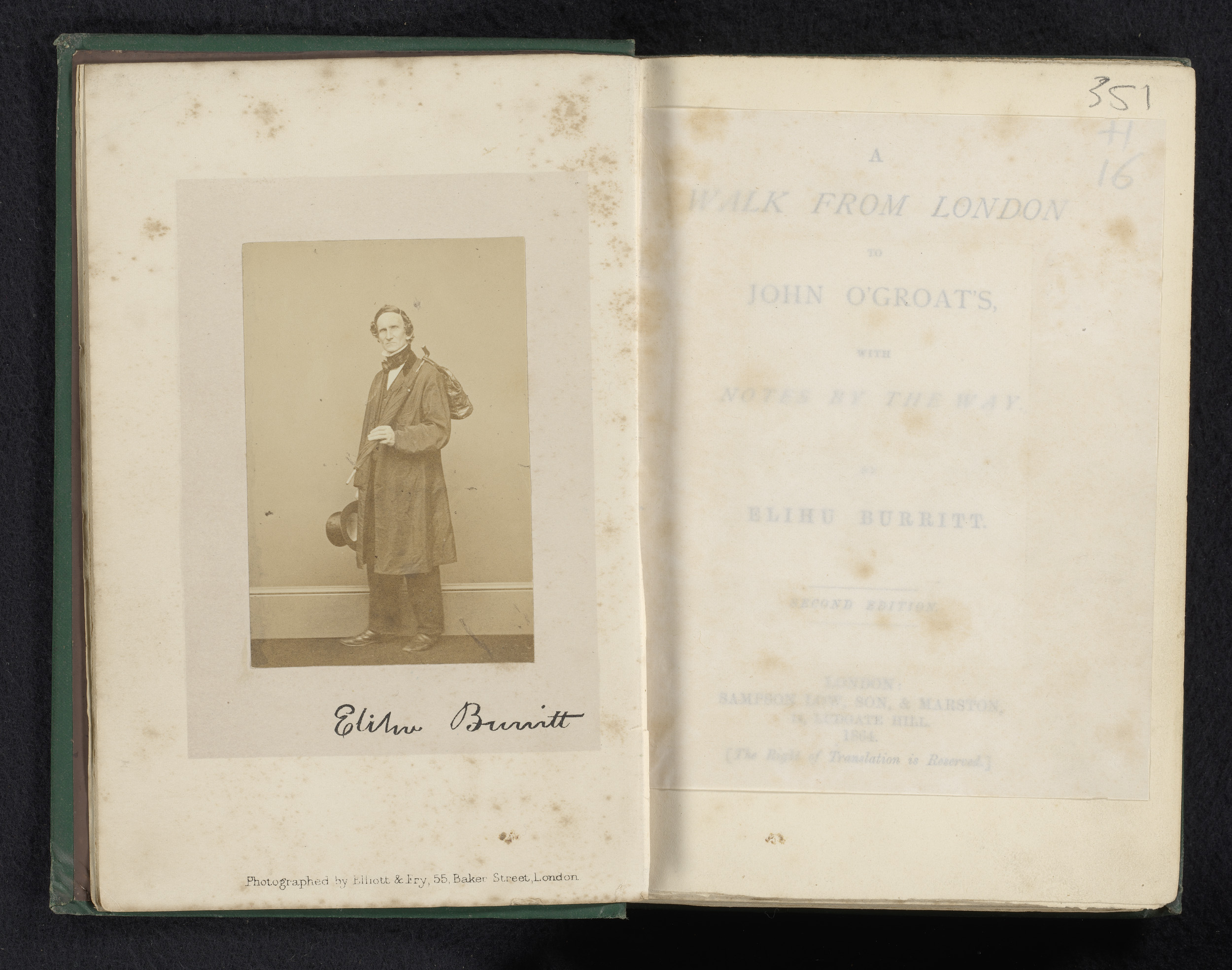 Portret van Elihu Burritt met hoed, tas en paraplu i...