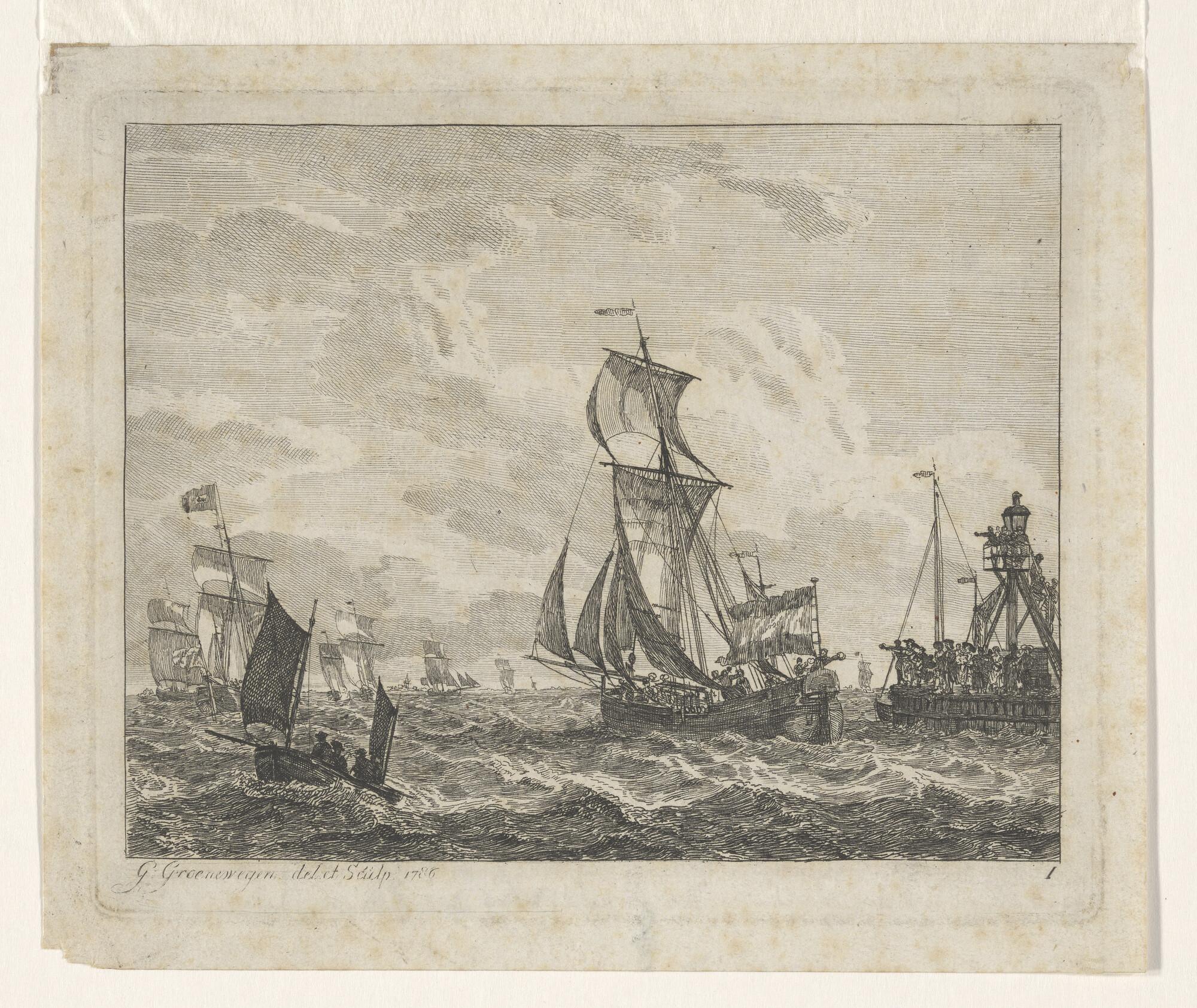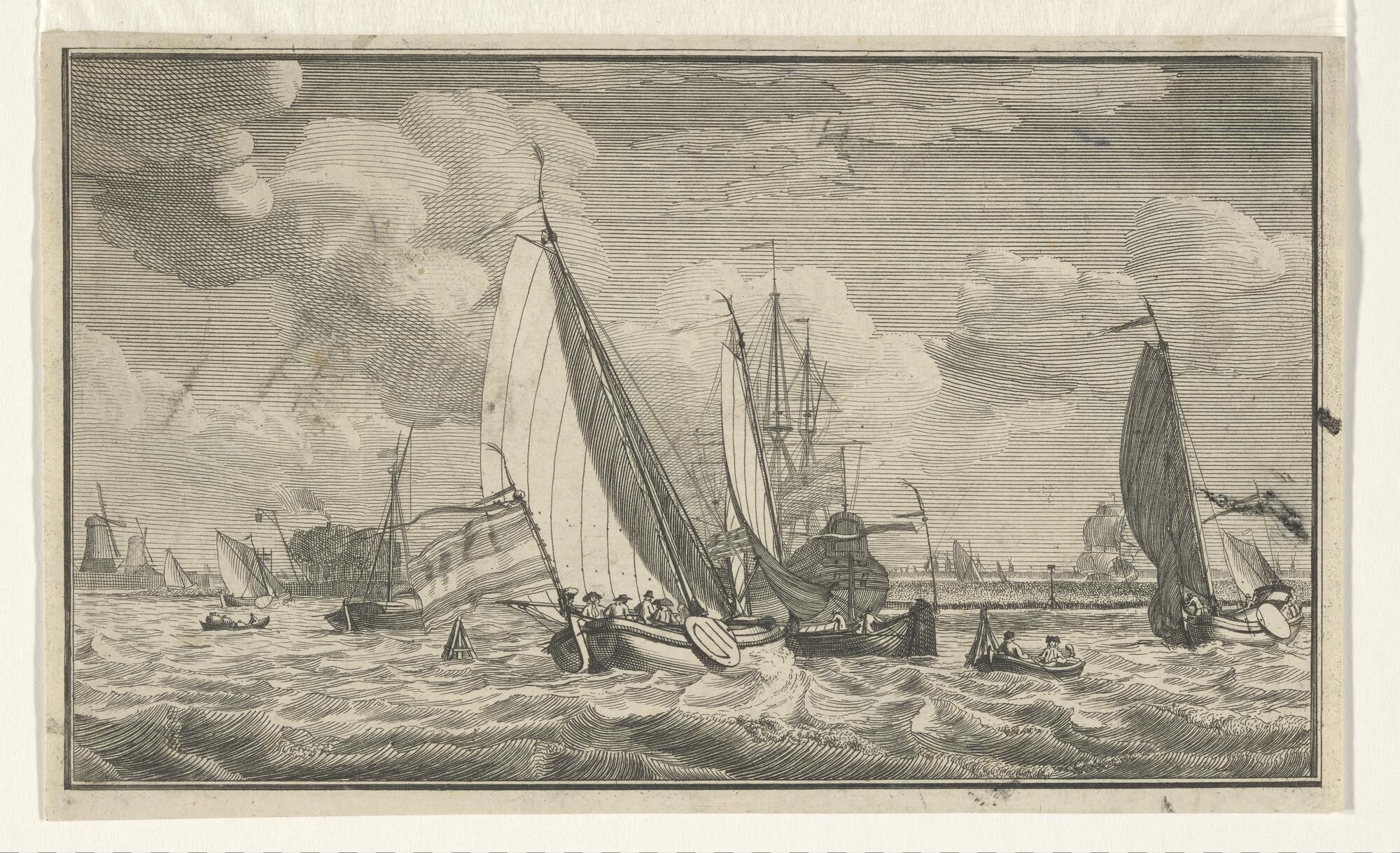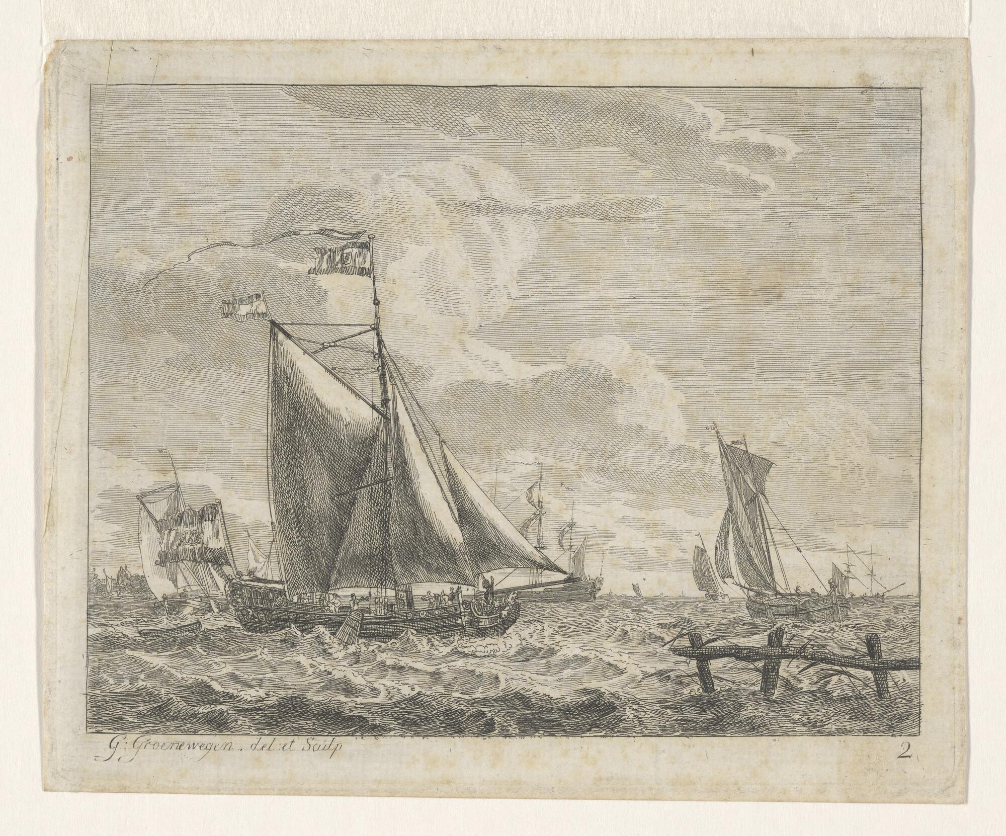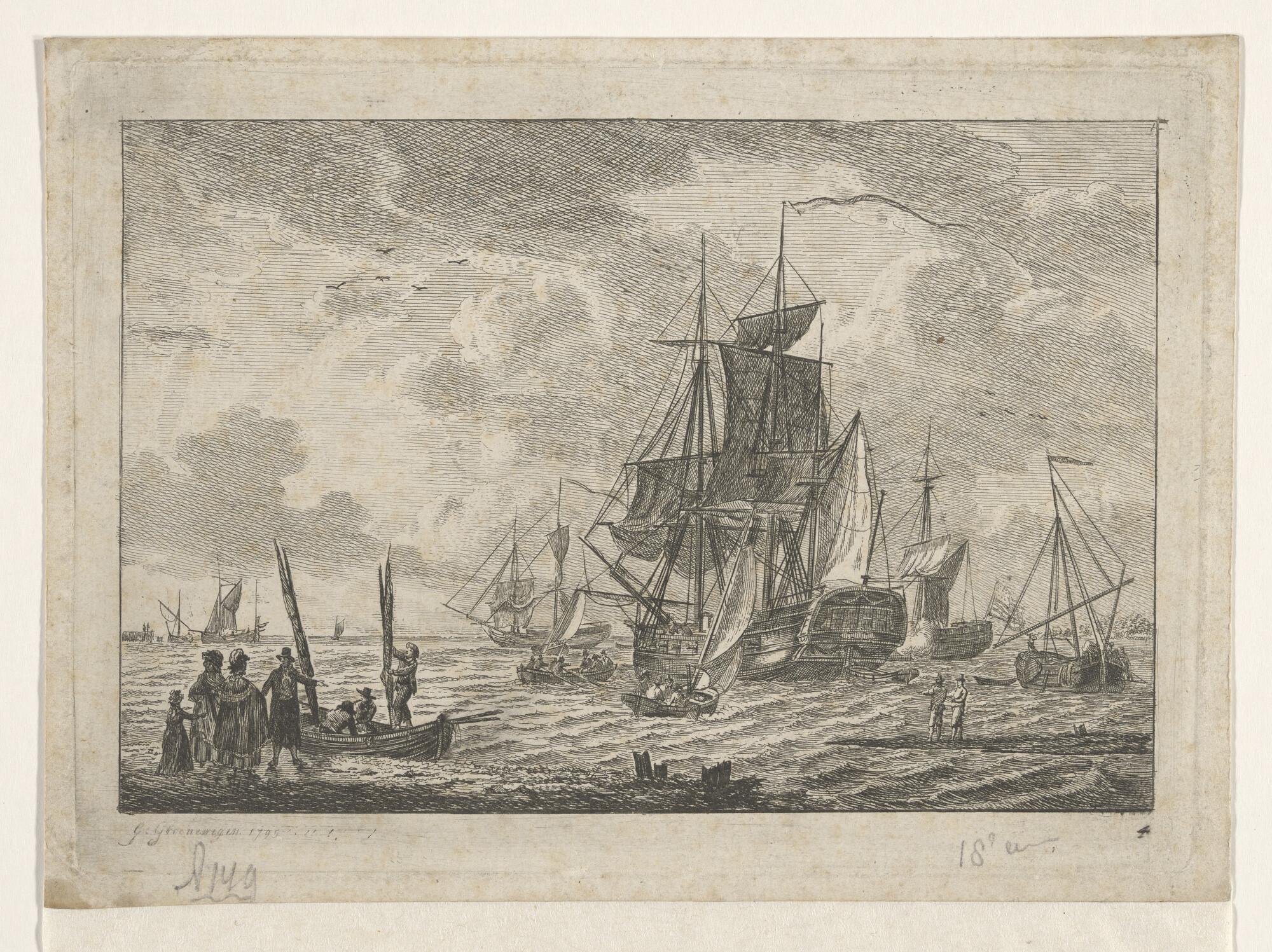 Zeegezicht, op den voorgrond een driemasthoeker, op ...