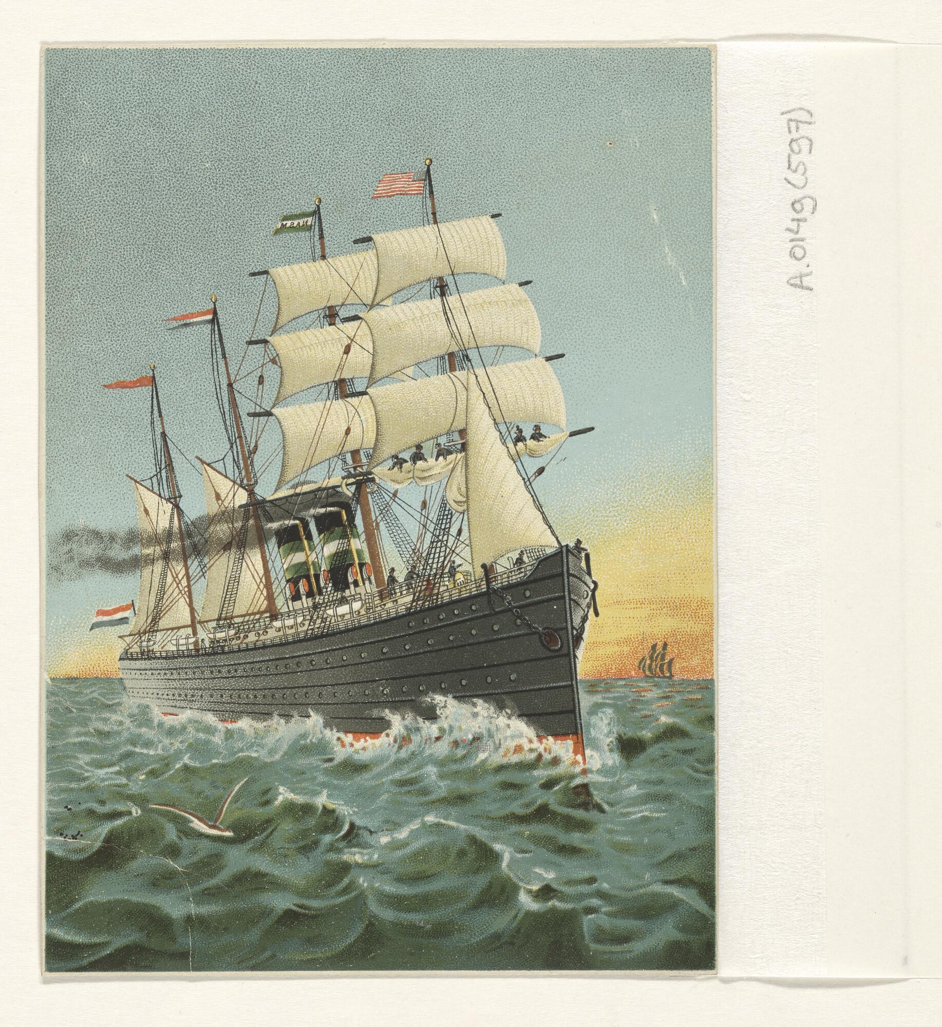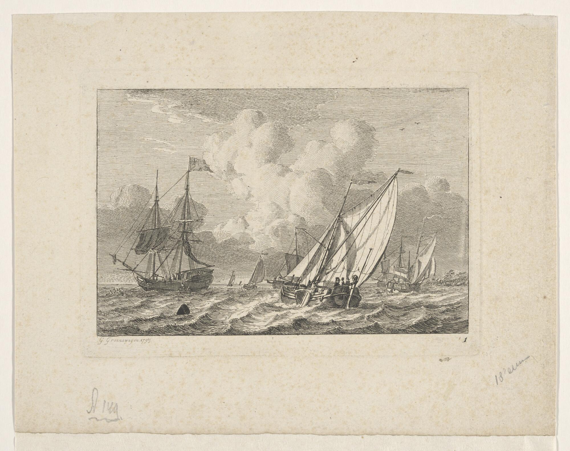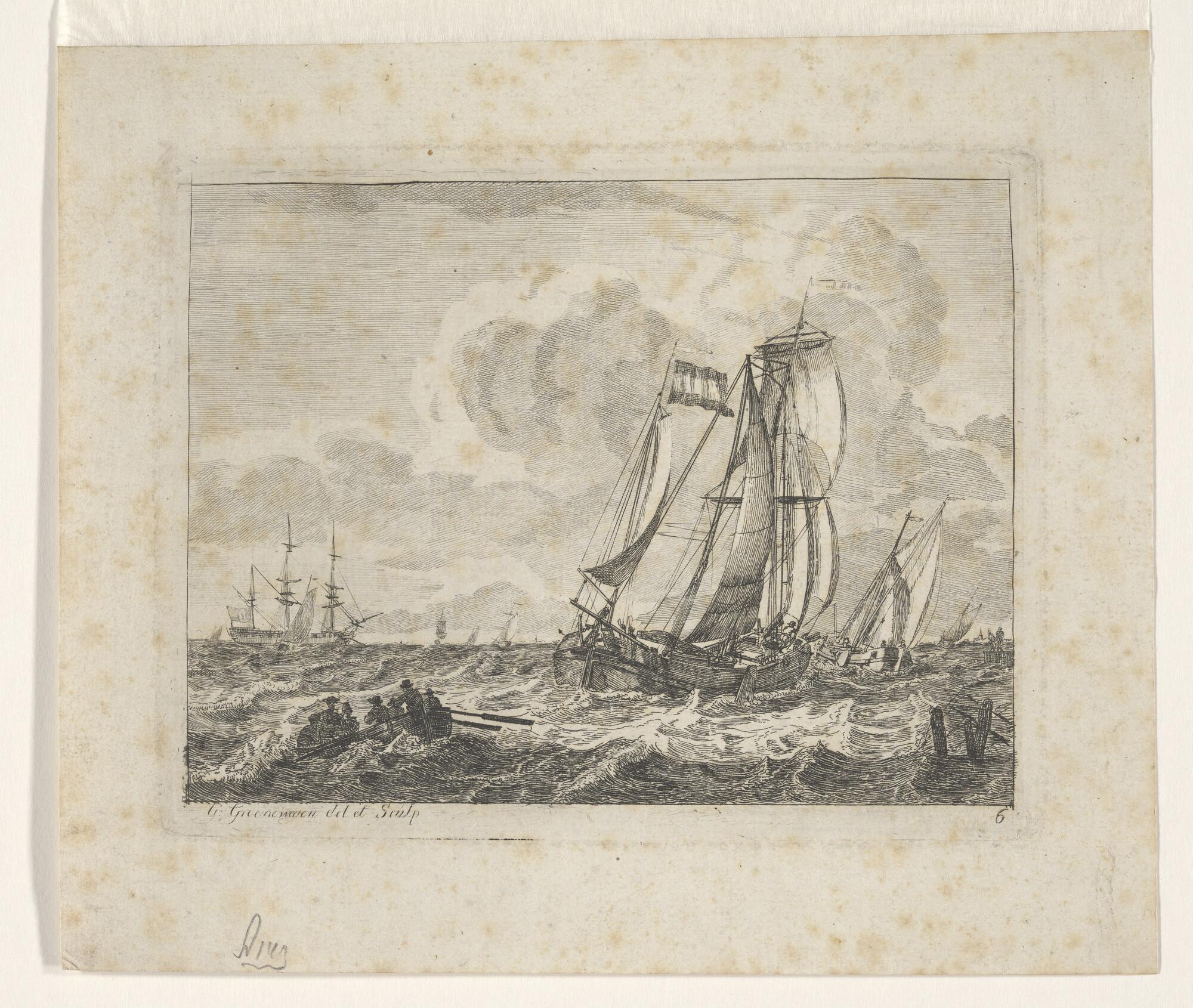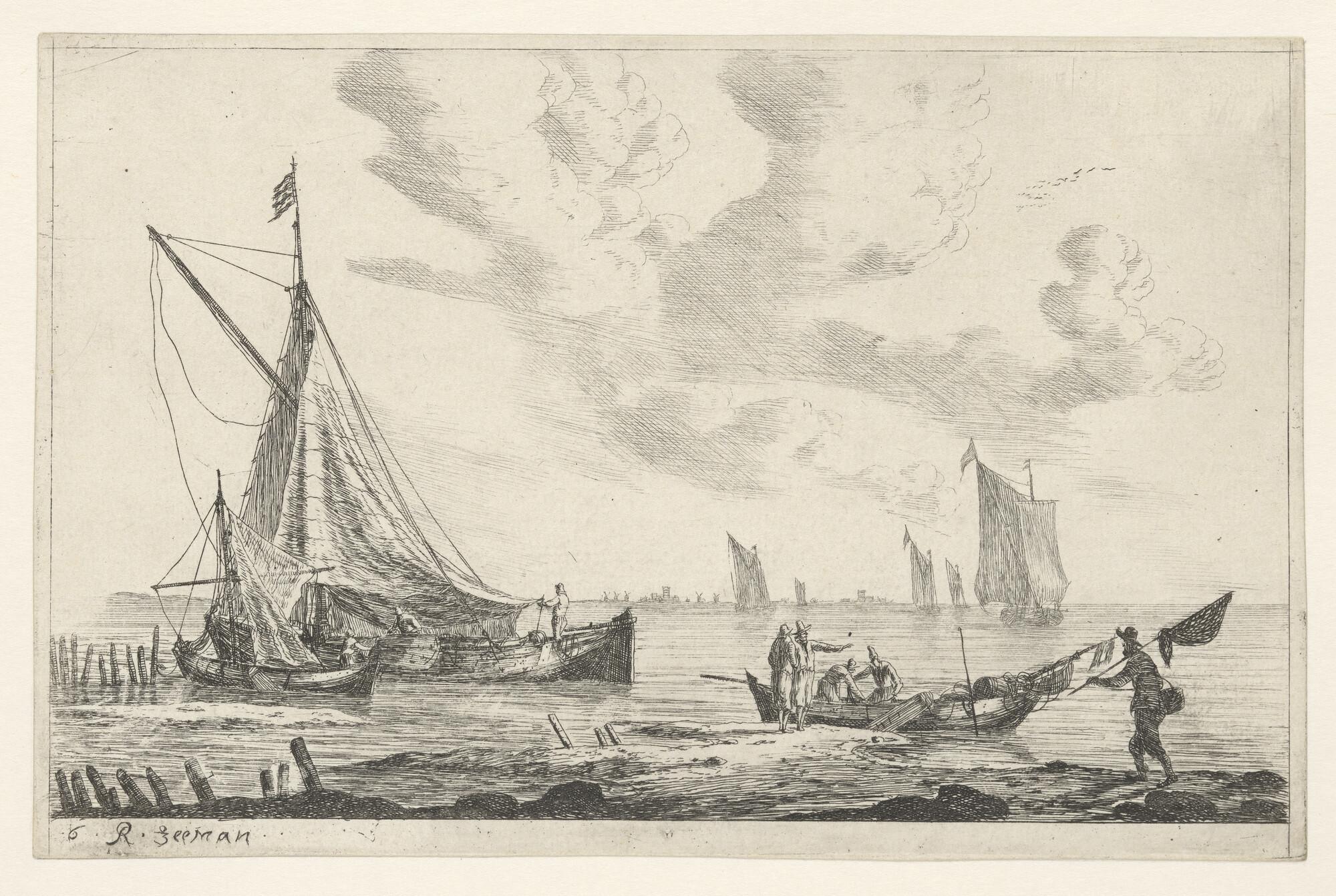 Zeegezicht, op den voorgrond een driemasthoeker, op ...