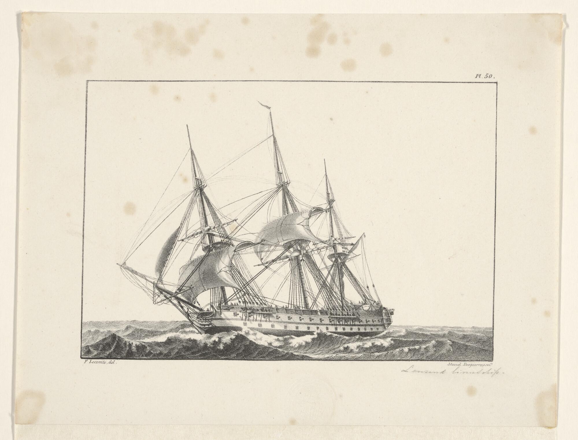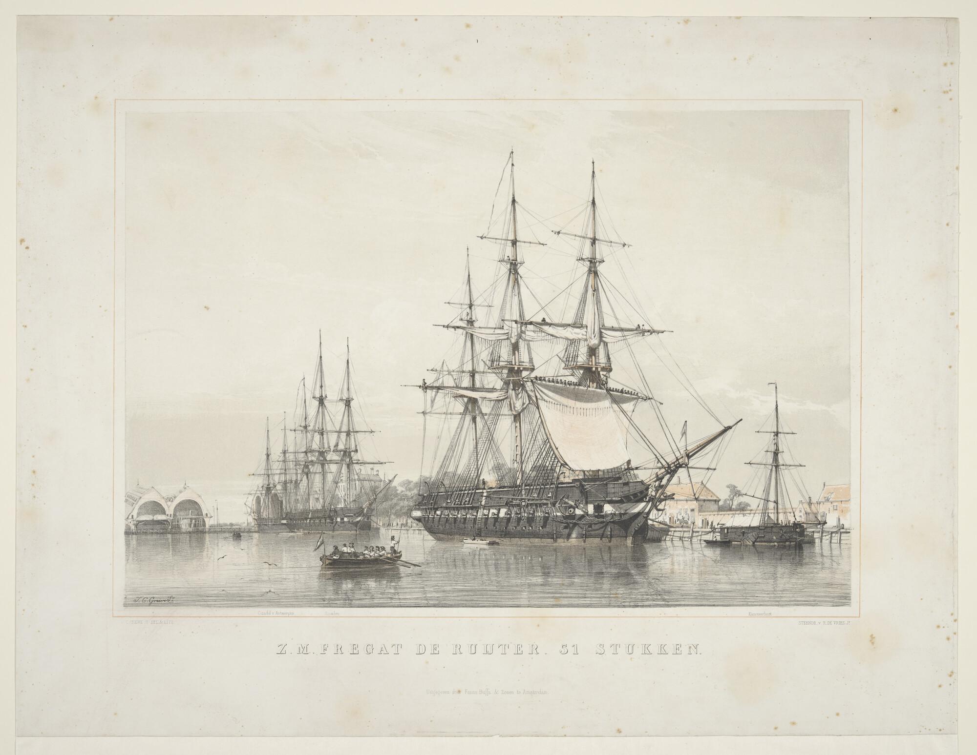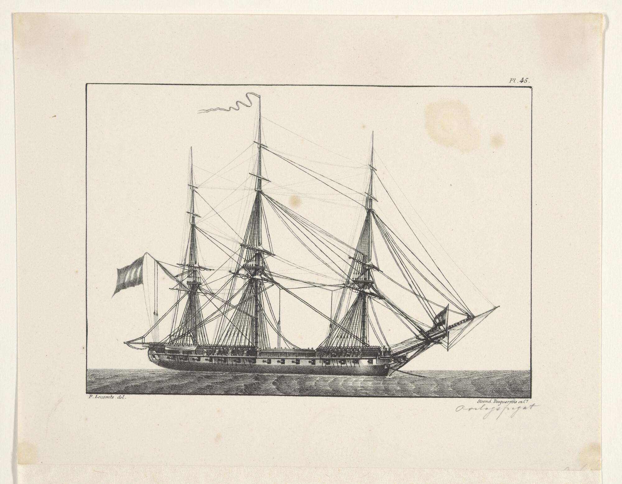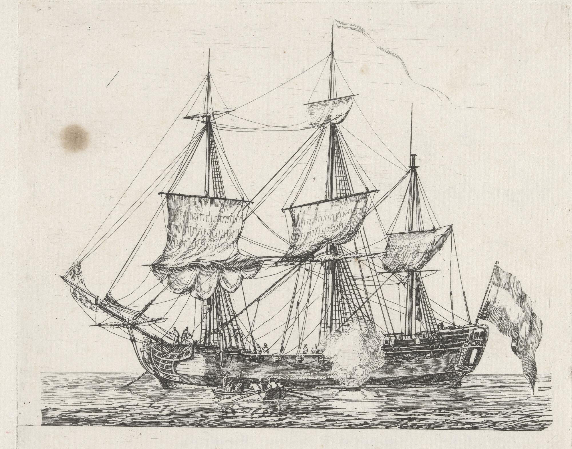 Prent van een fregatschip, voor anker liggende geeft...