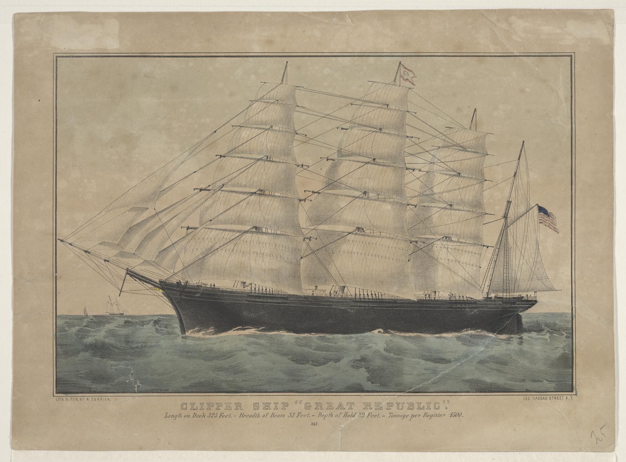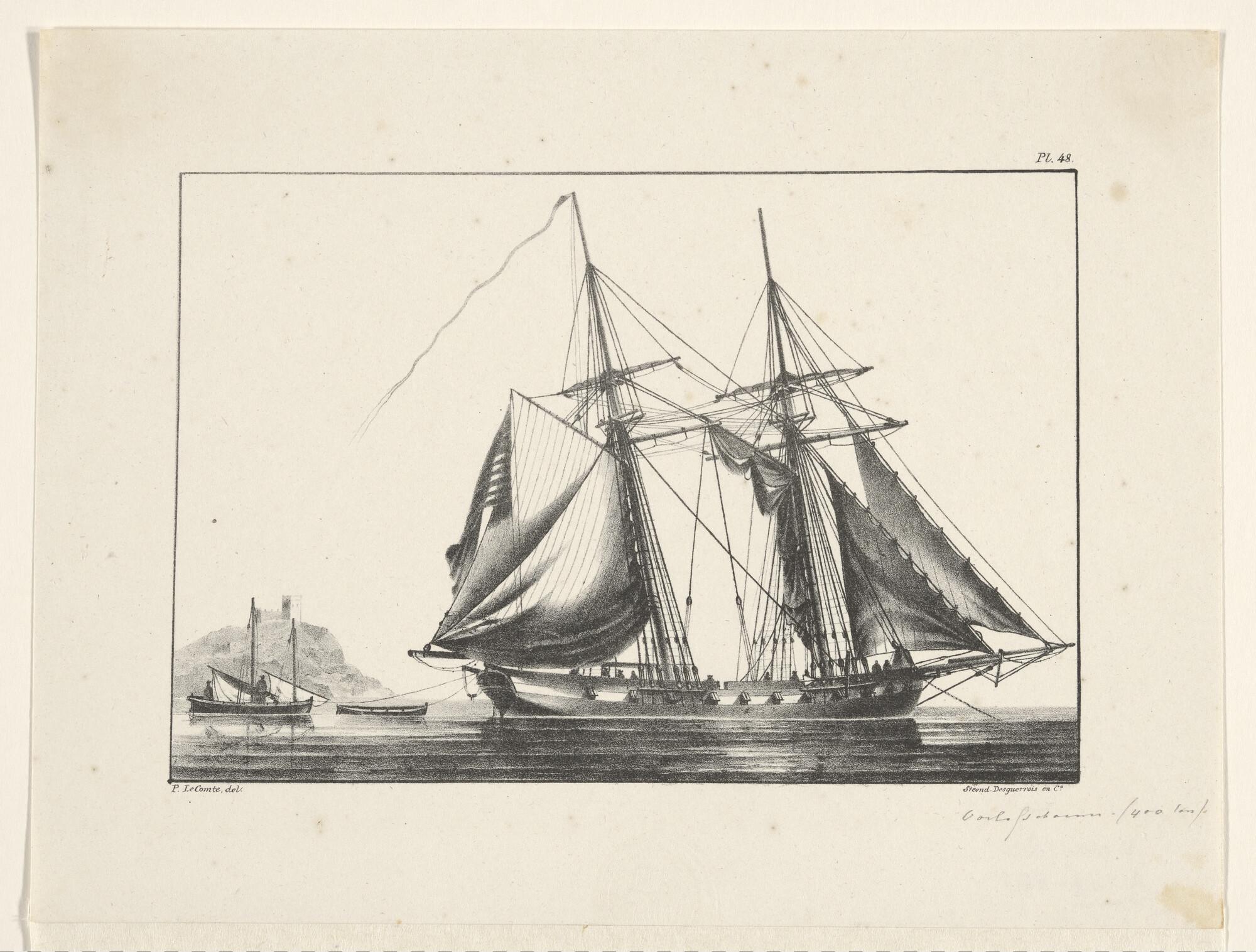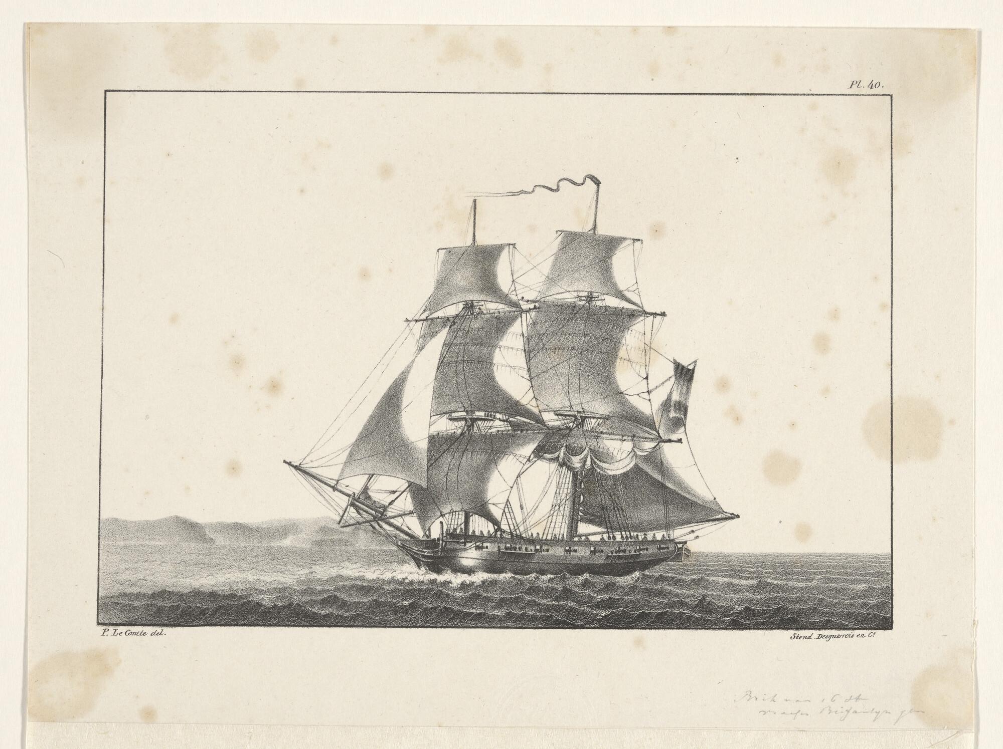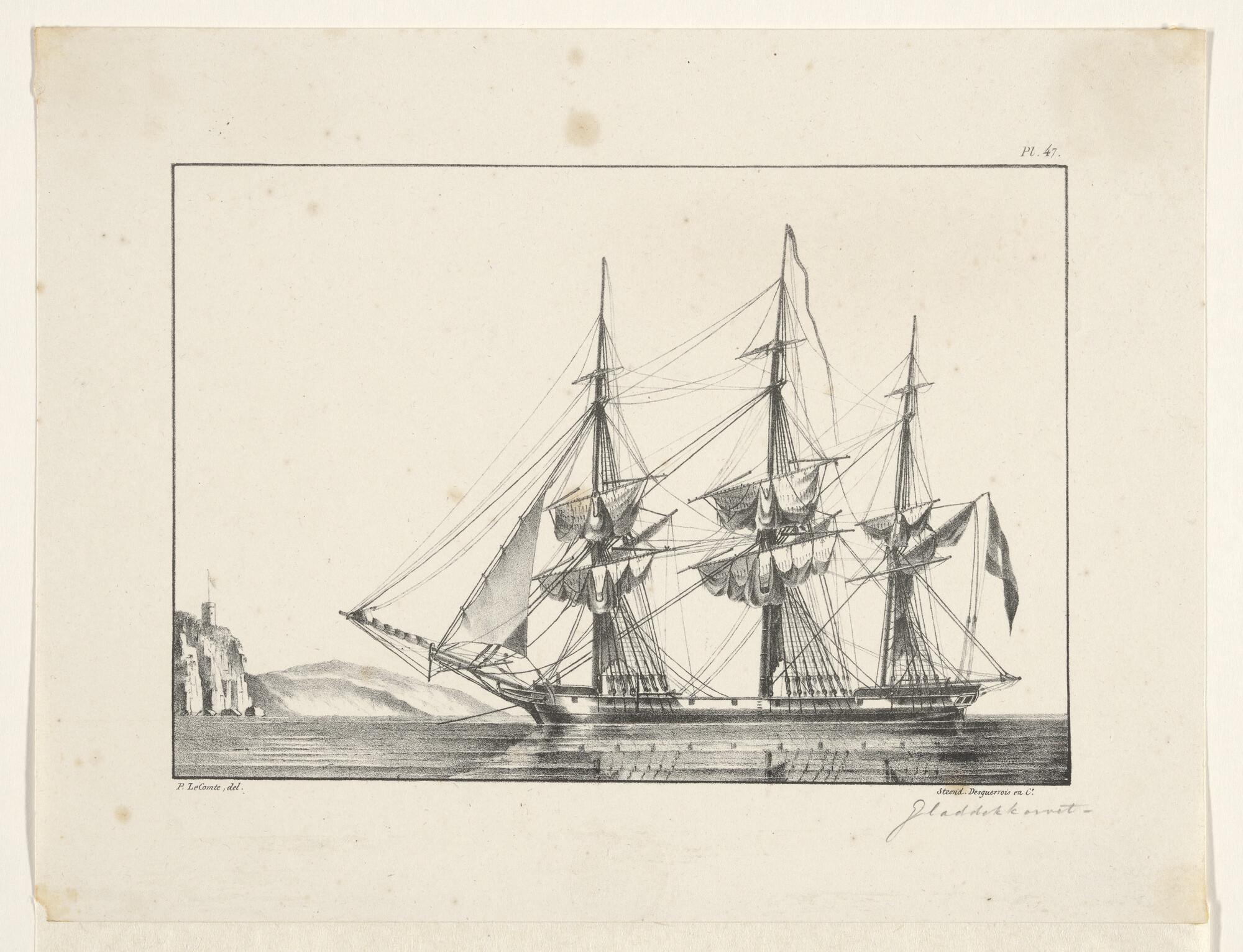 Prent van een fregatschip, voor anker liggende geeft...