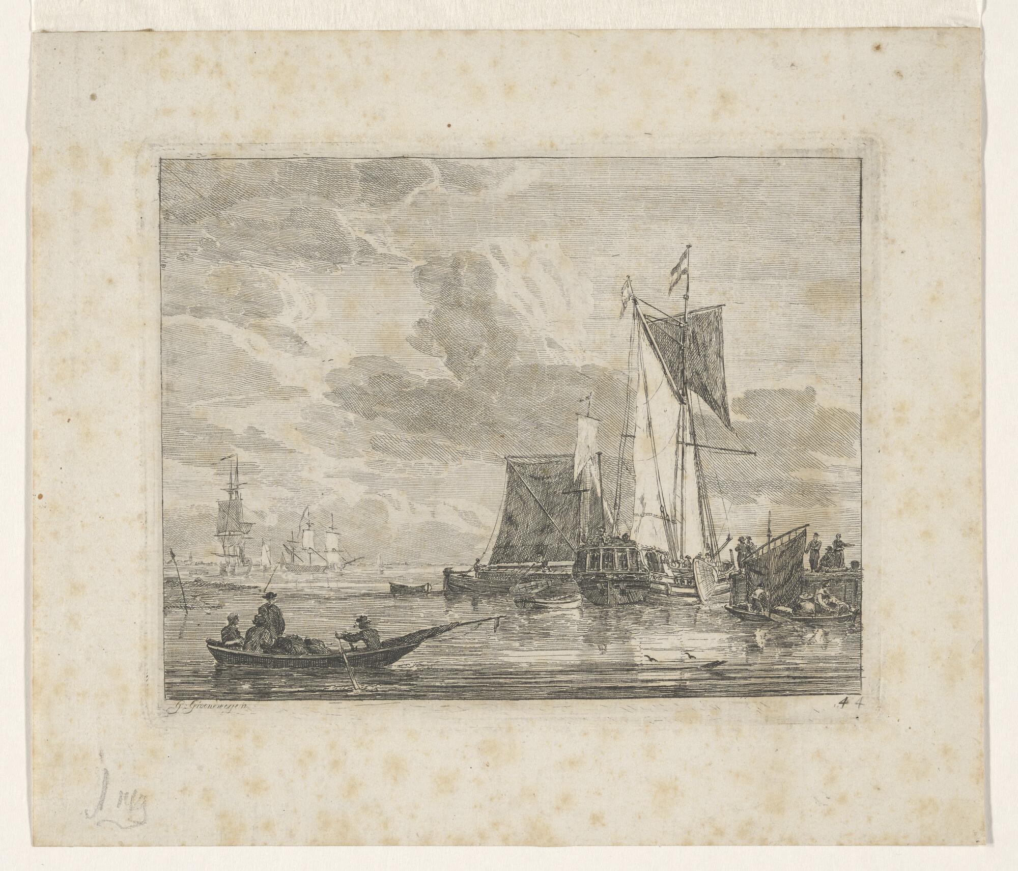 Binnenvaartschepen op een rede: jachten met fluit op...