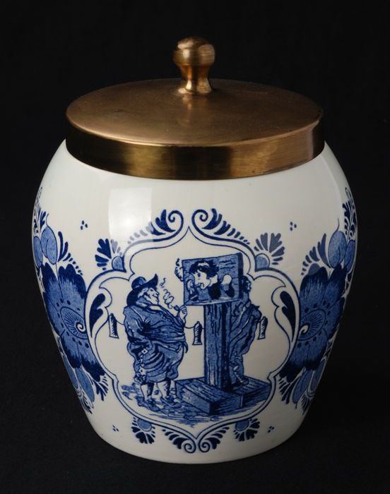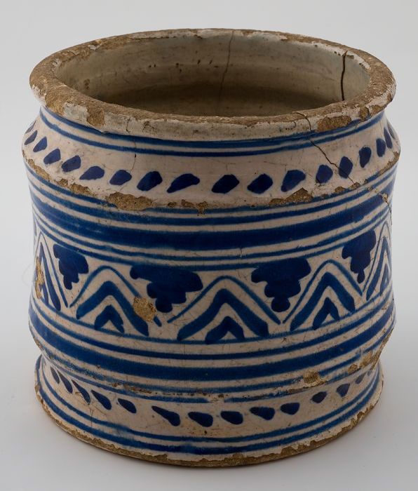 Grote majolica zalfpot met blauw decor op wit fond, ...