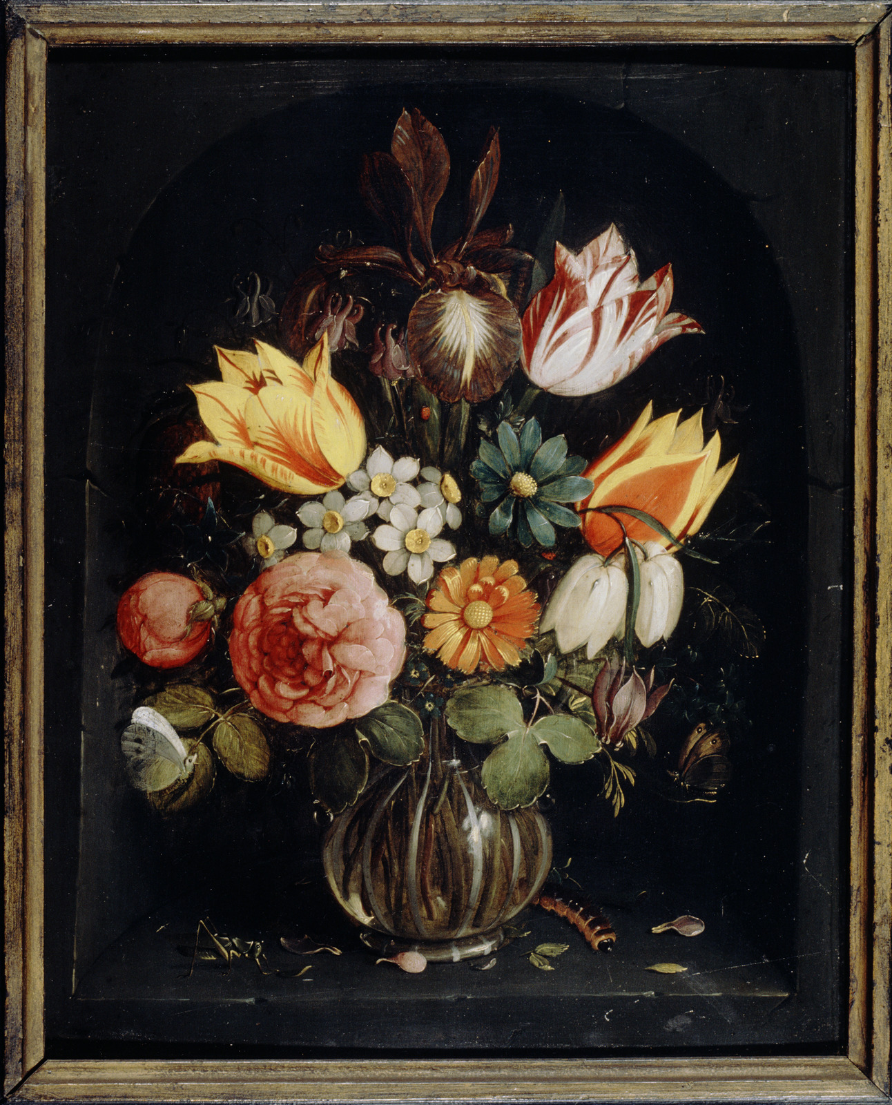 Stilleven met glazen bloemenvaas in een nis