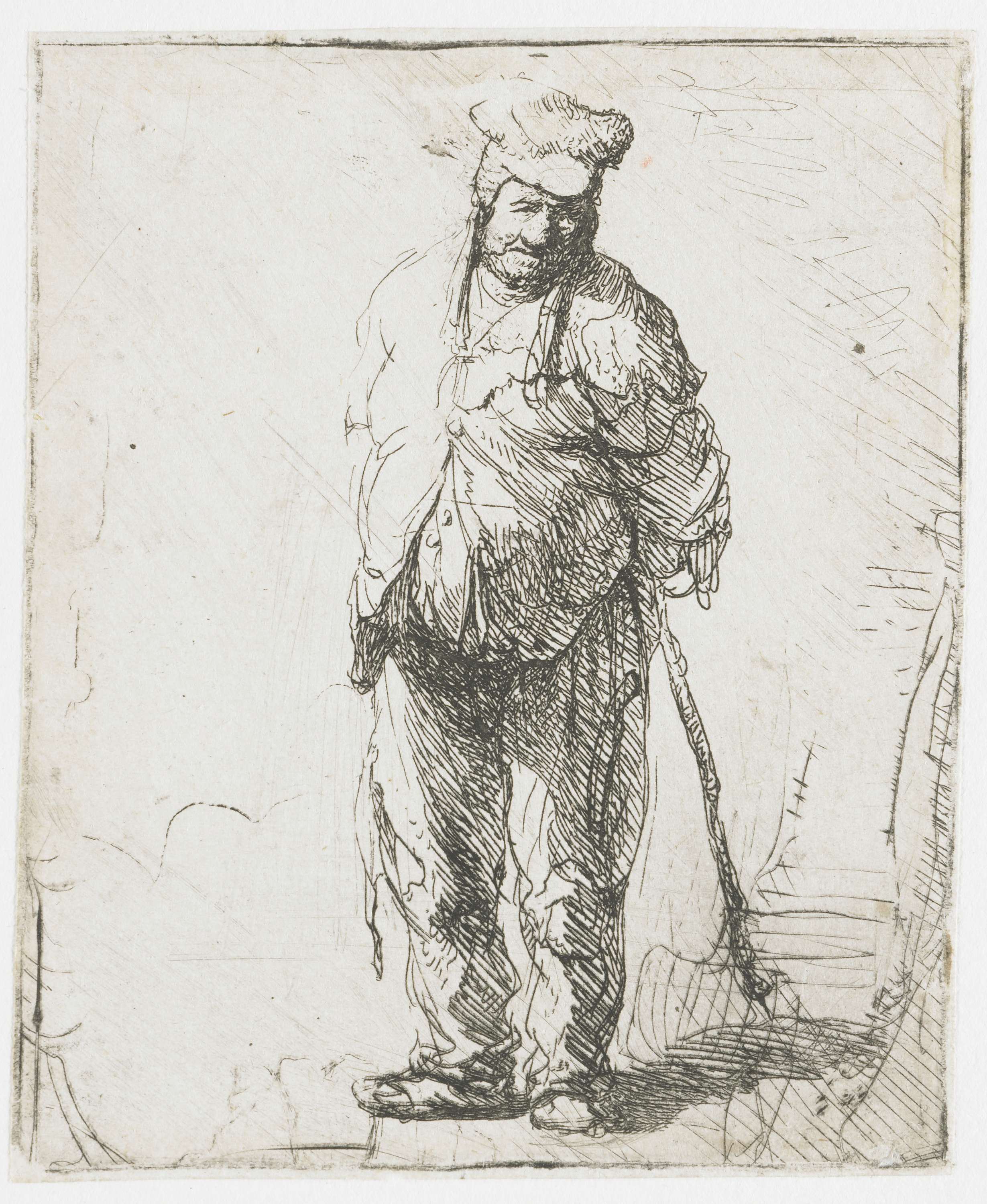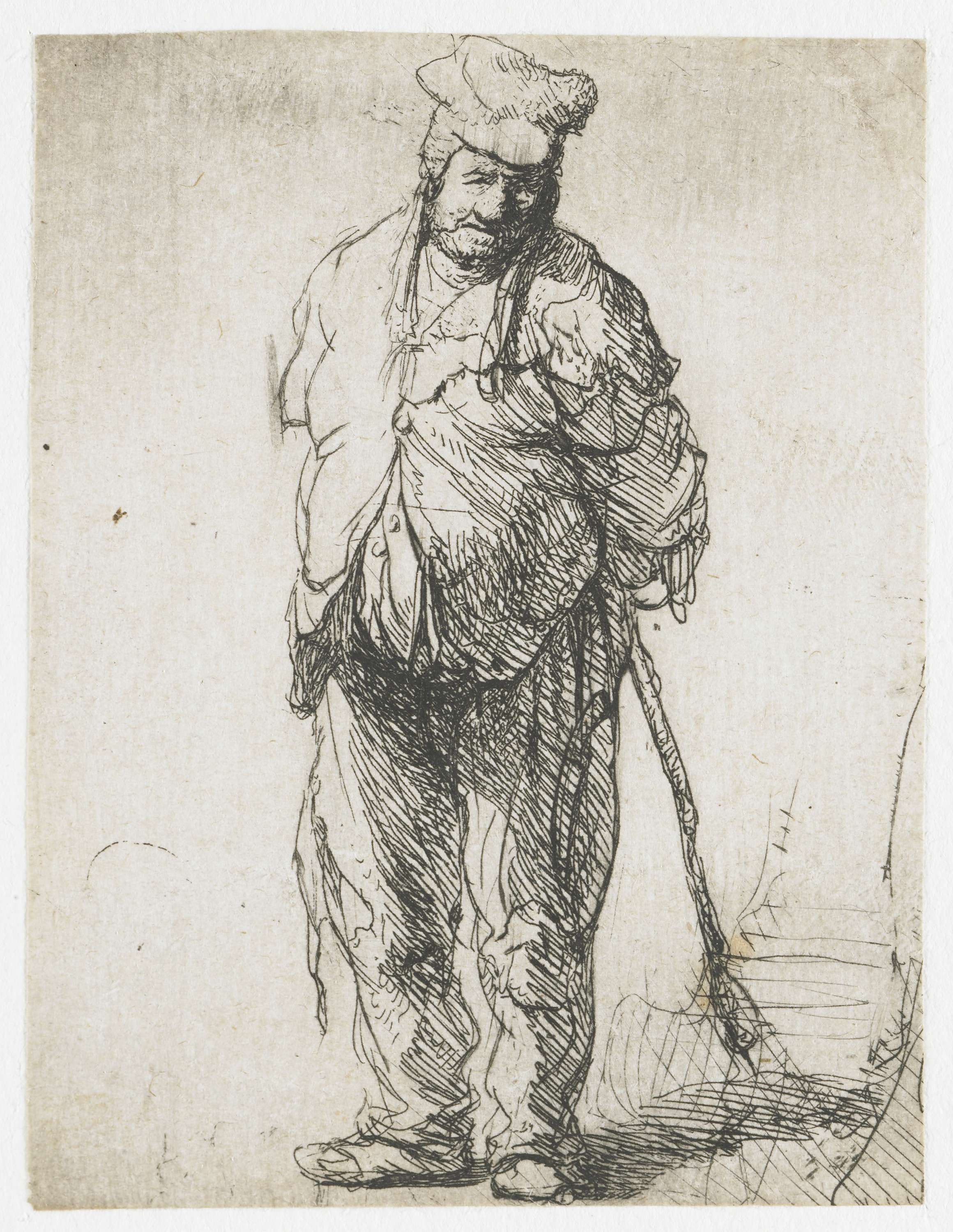 Ragged peasant with his hands behind him, holding a ...