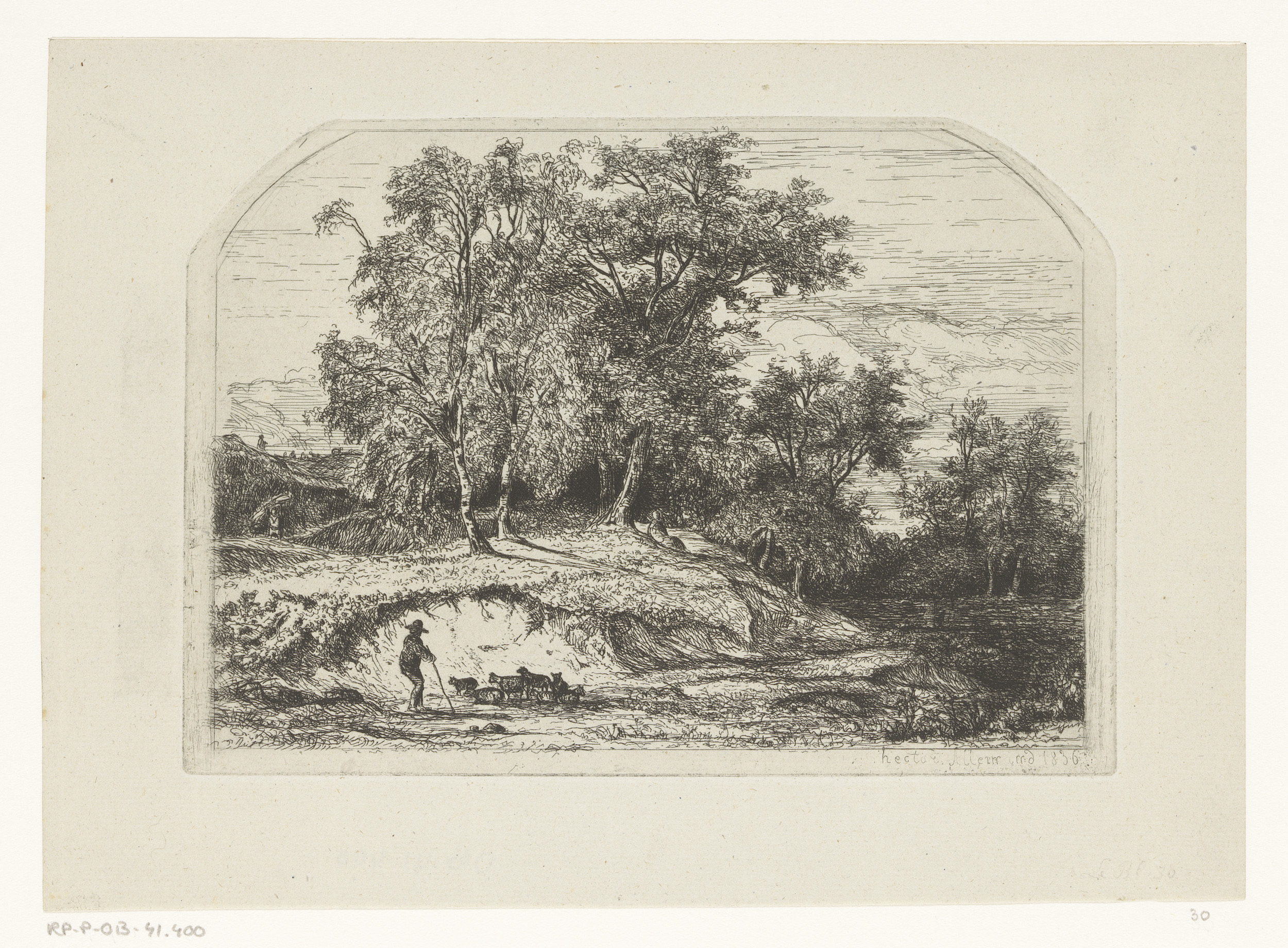 Herder met kudde in een boomrijk landschap