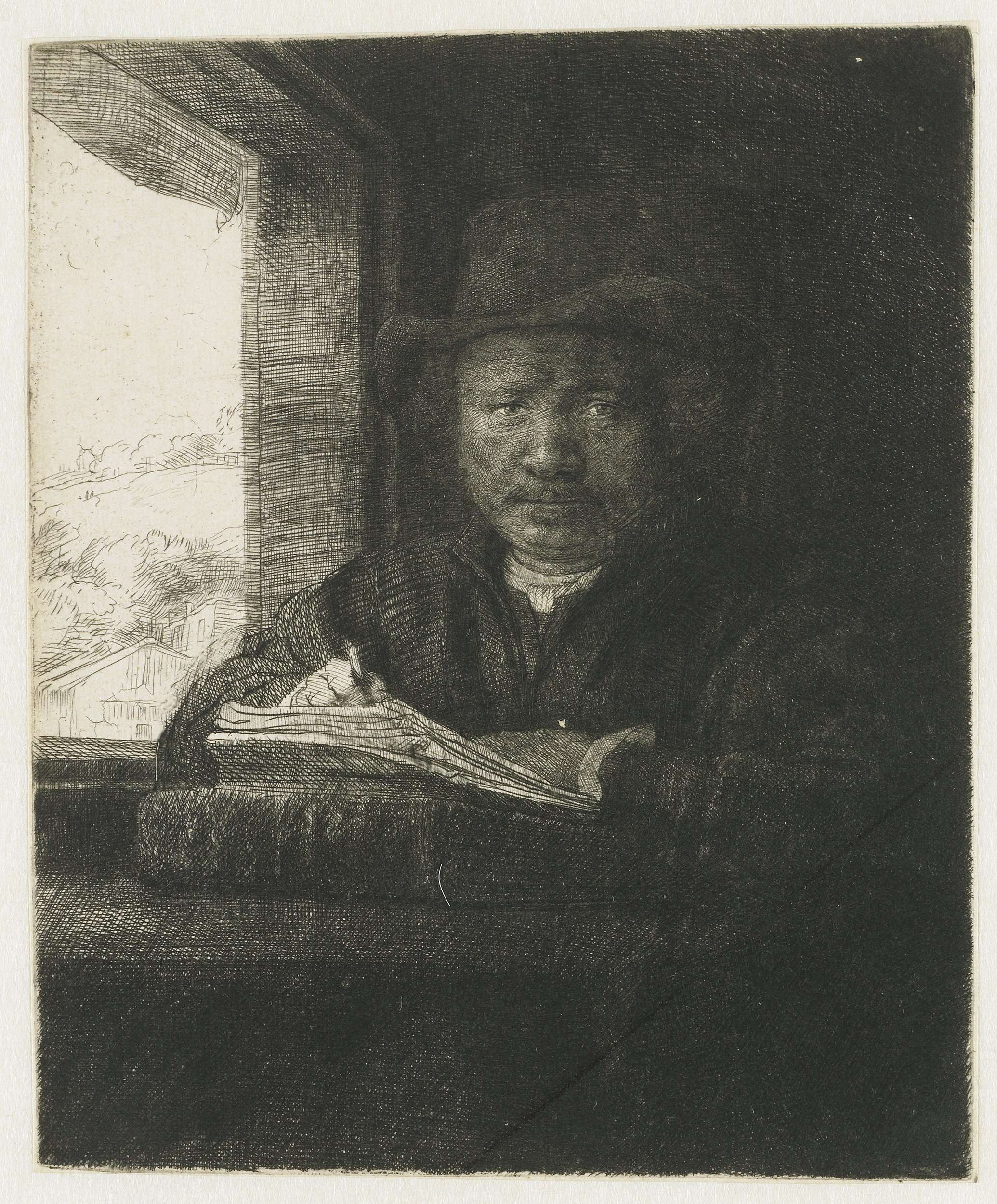 Self-portrait etching at a window