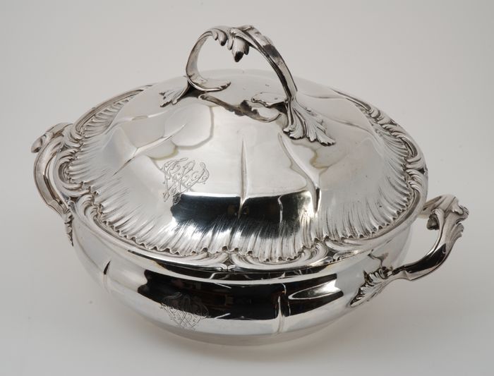 Zilveren terrine met binnenbak en deksel, gegraveerd...
