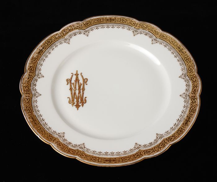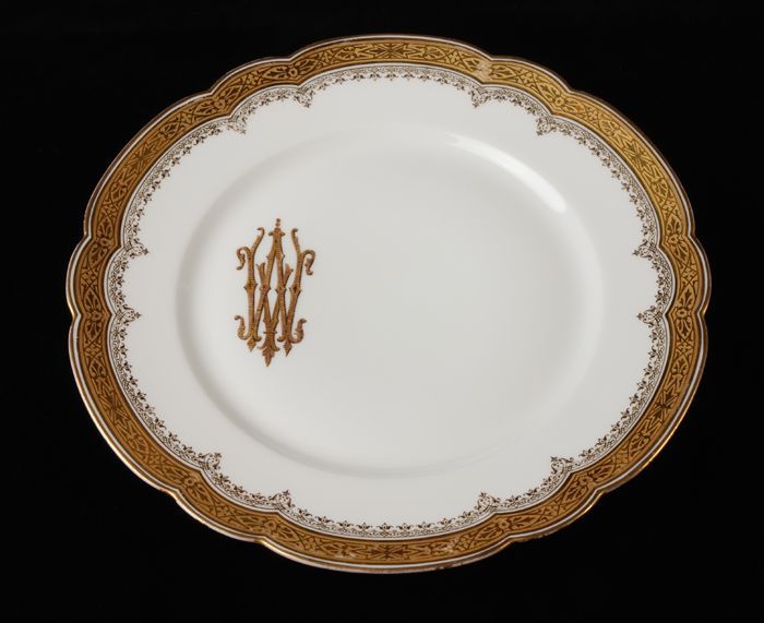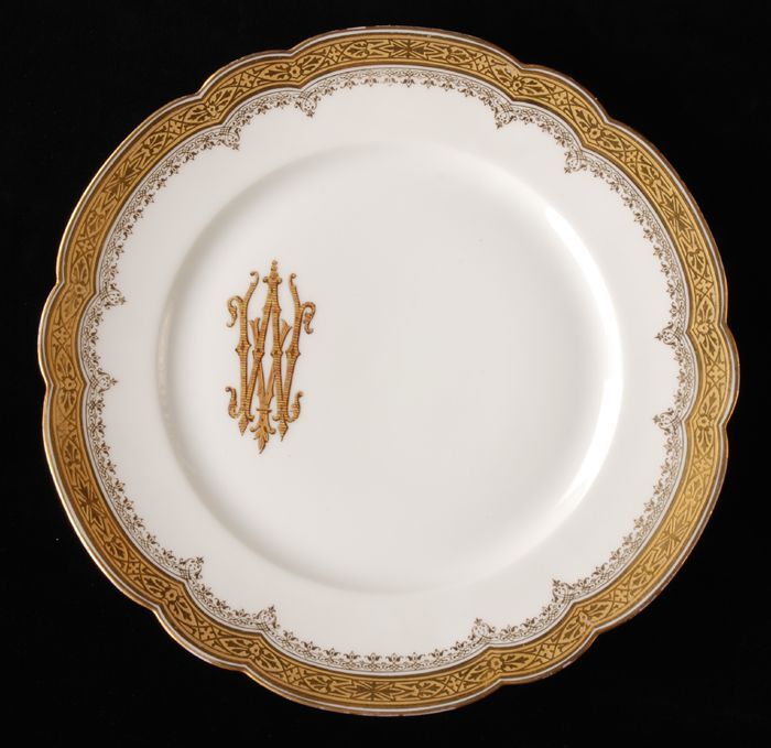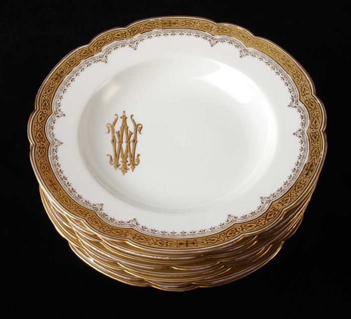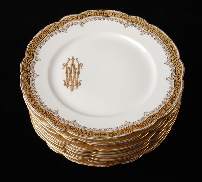 Elf grote platte porseleinen borden, goudluster lang...
