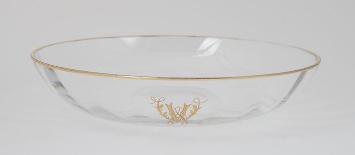 Grote ondiepe glazen schaal of vingerkom, gegraveerd...