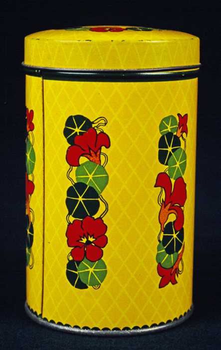 Rond blik met los deksel, "Verkade", geel en veelkle...