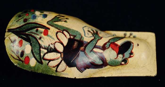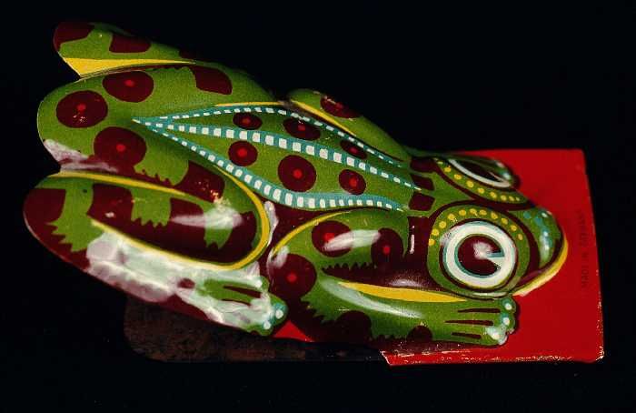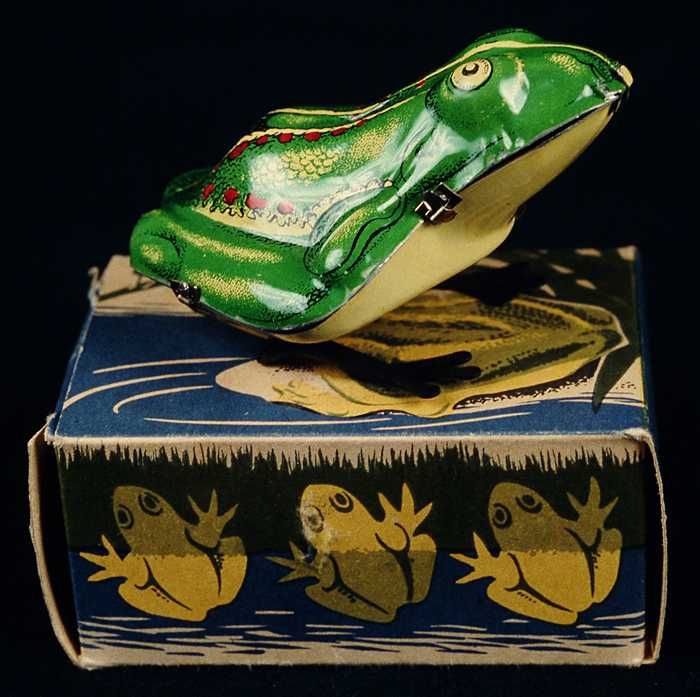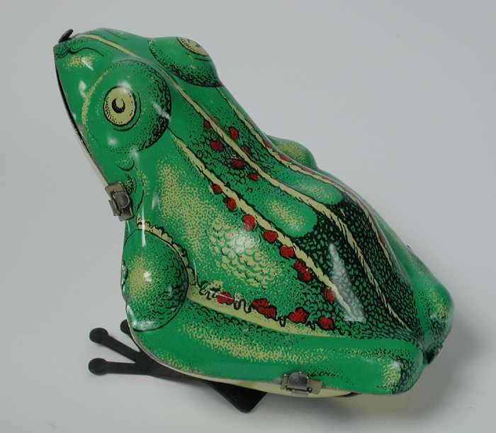 Blikken opwindkikker, groene bovenkant met lichtgele...