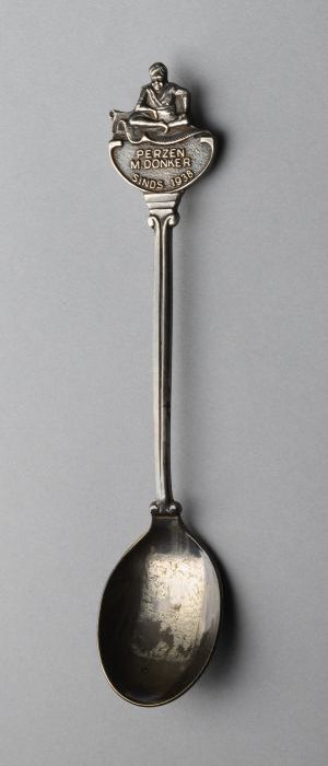 Zilveren theelepel "PERZEN / M. DONKER" met zittende...