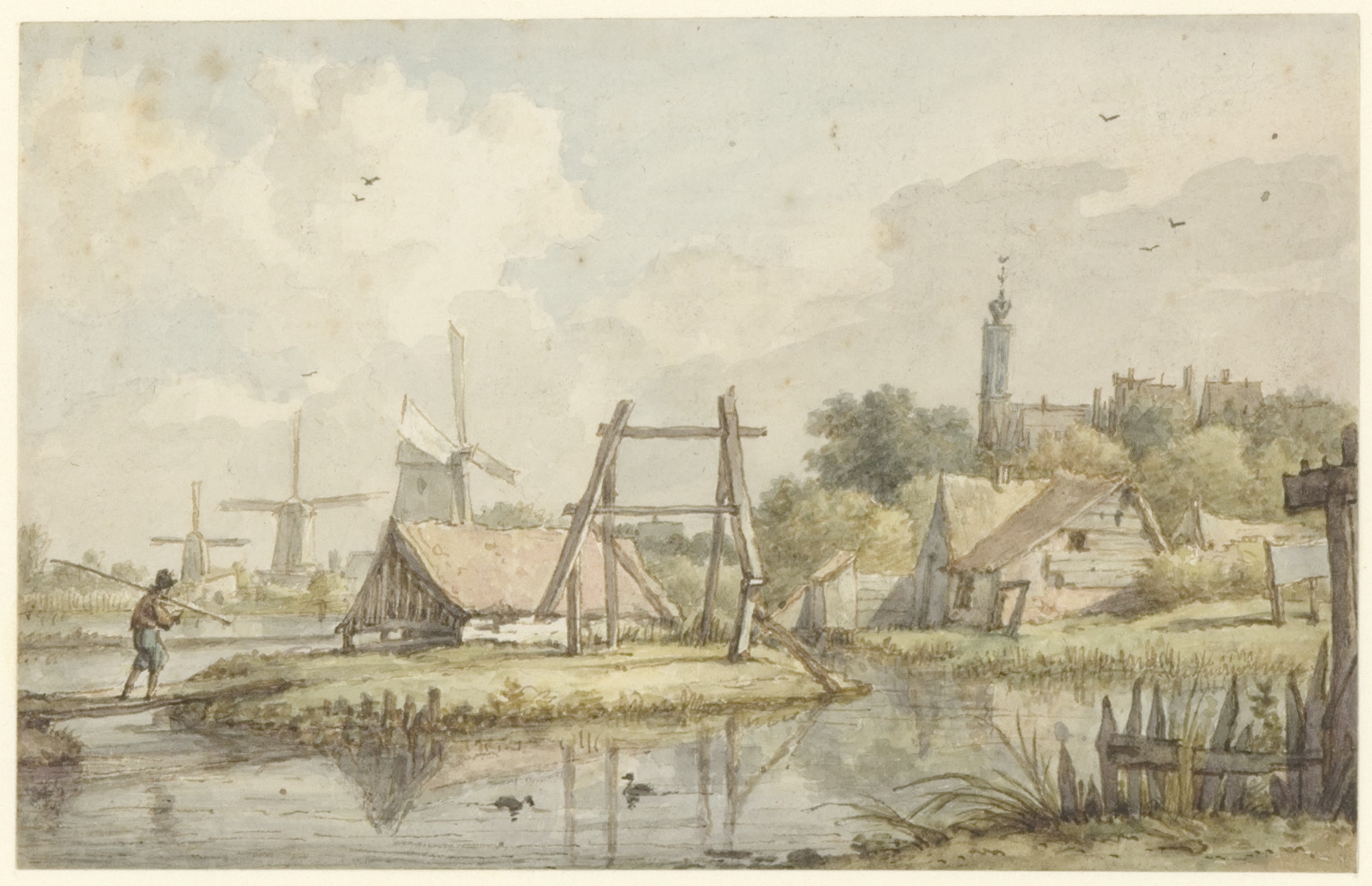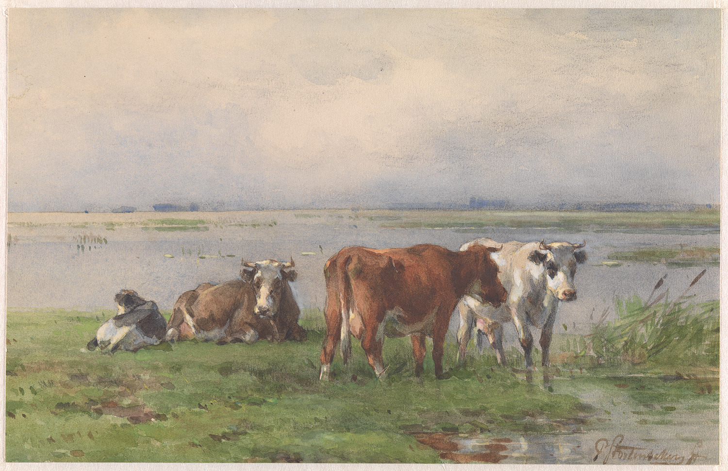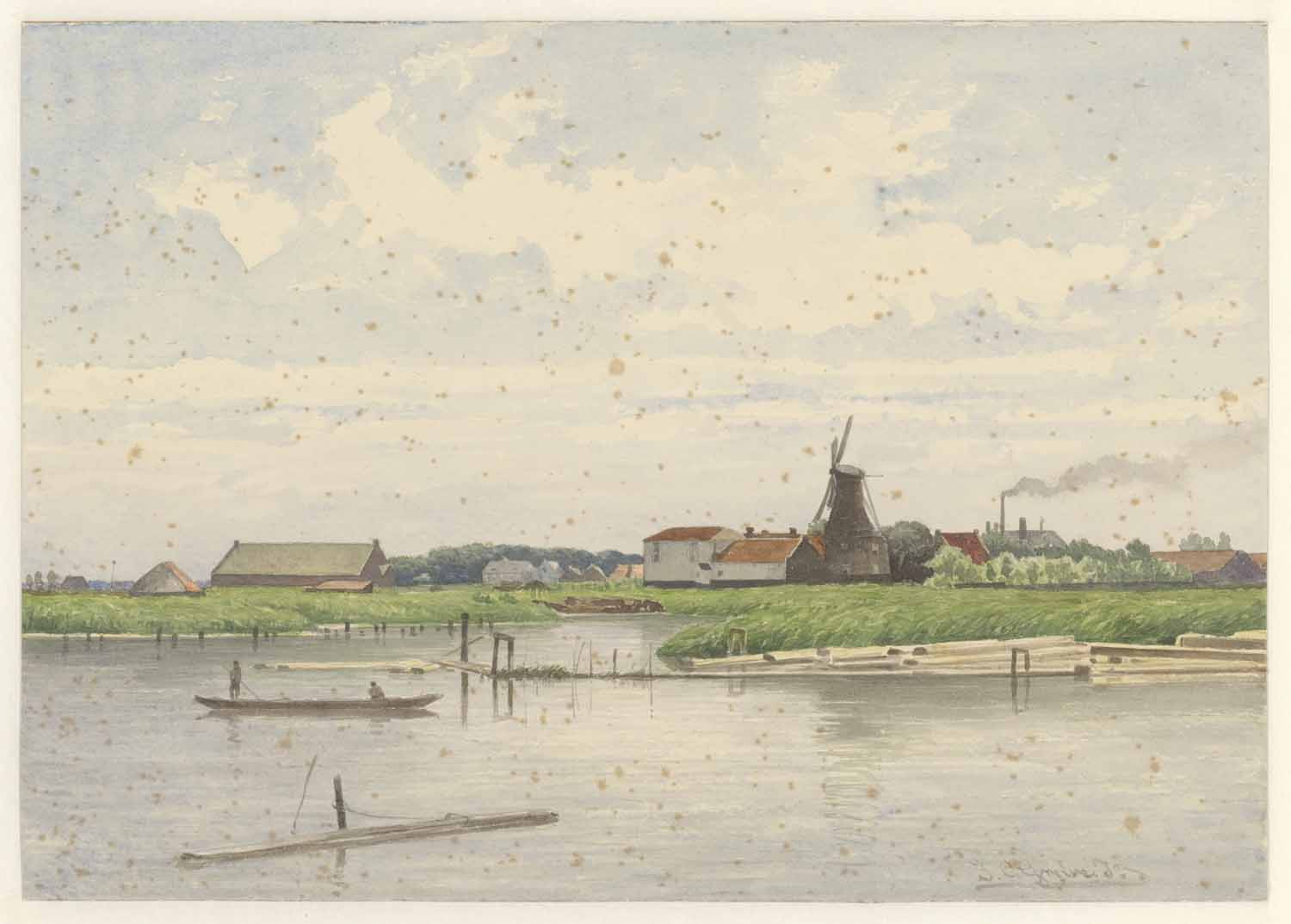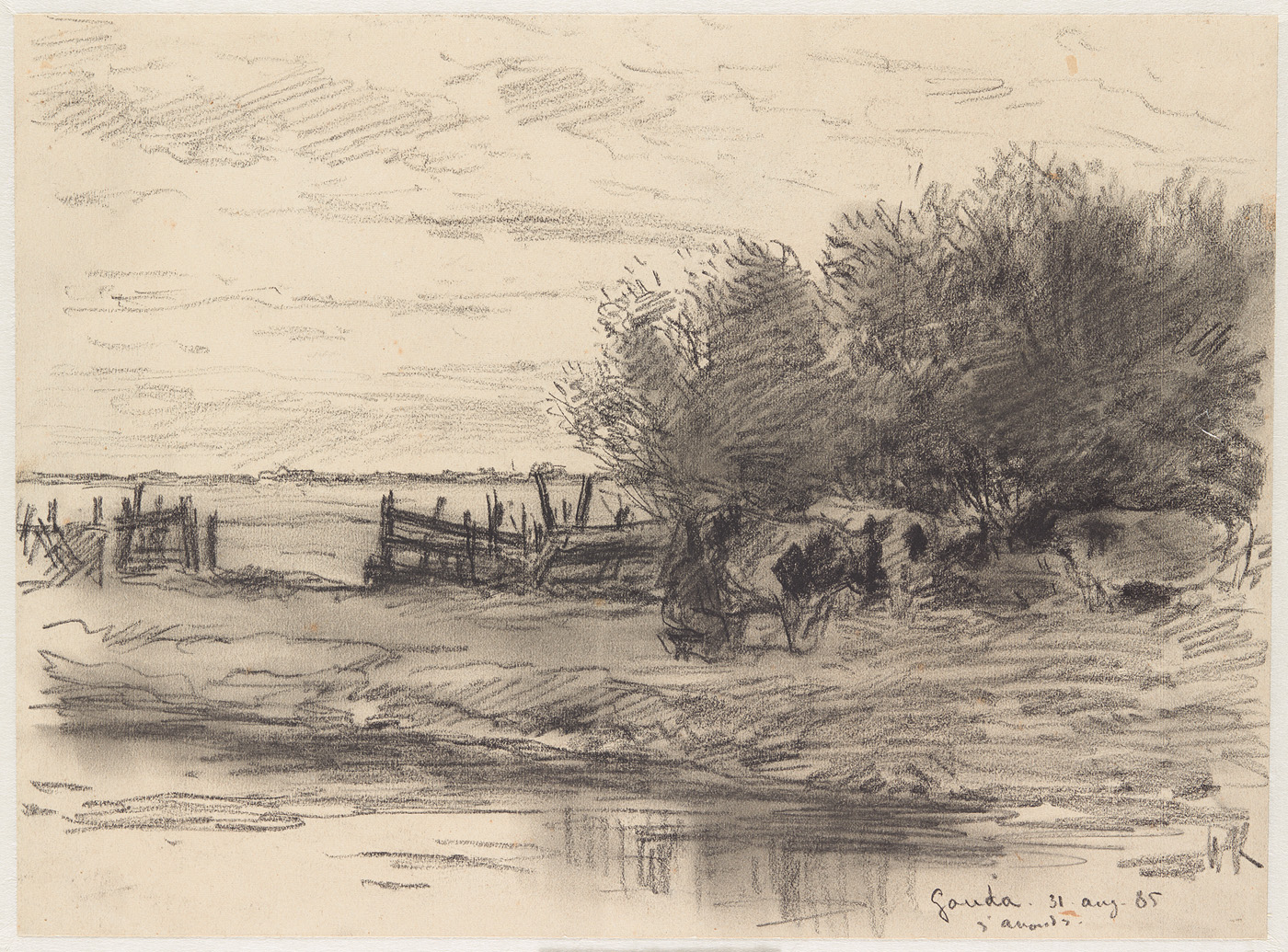 Koeien aan een water bij Gouda. Molen in landschap (...