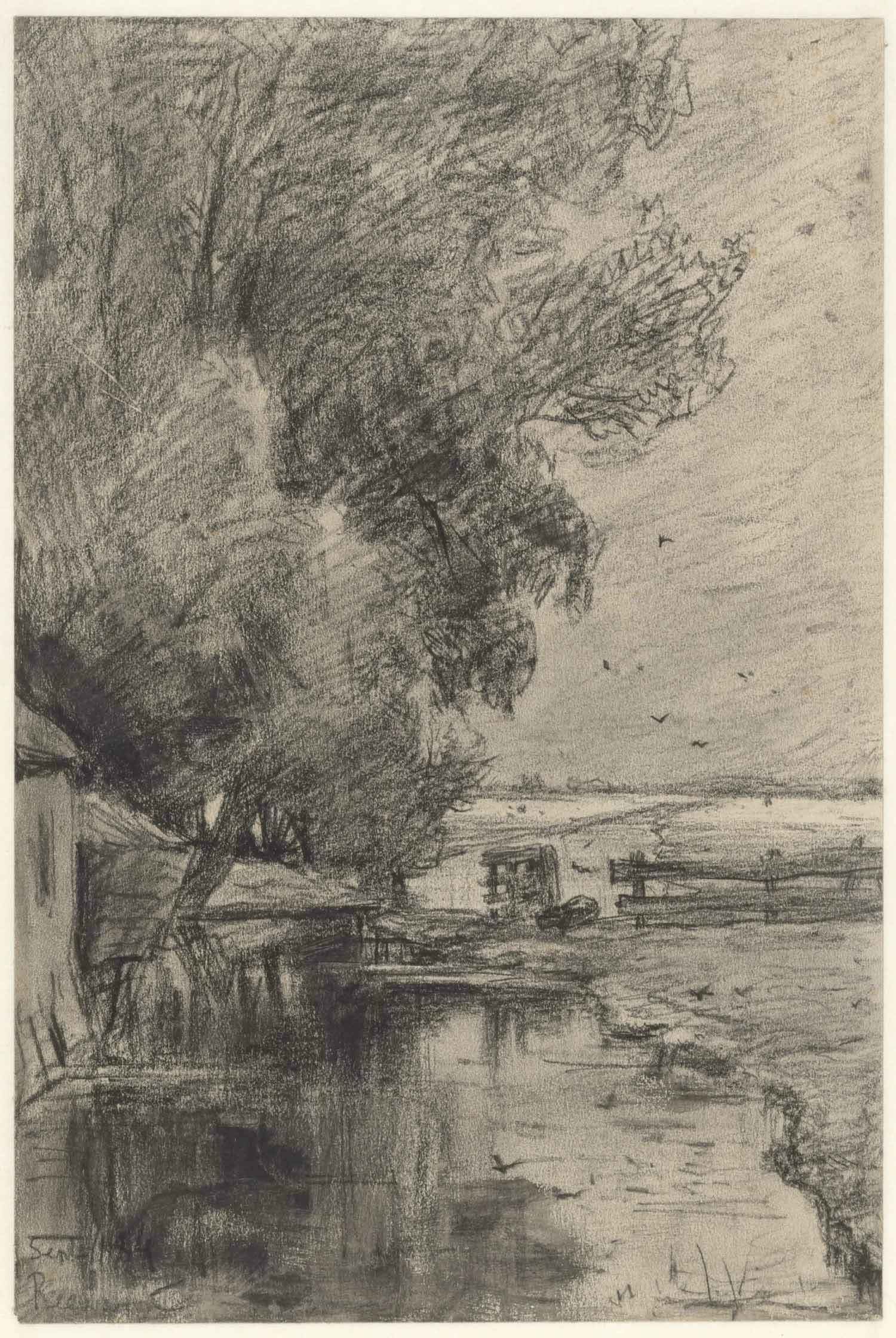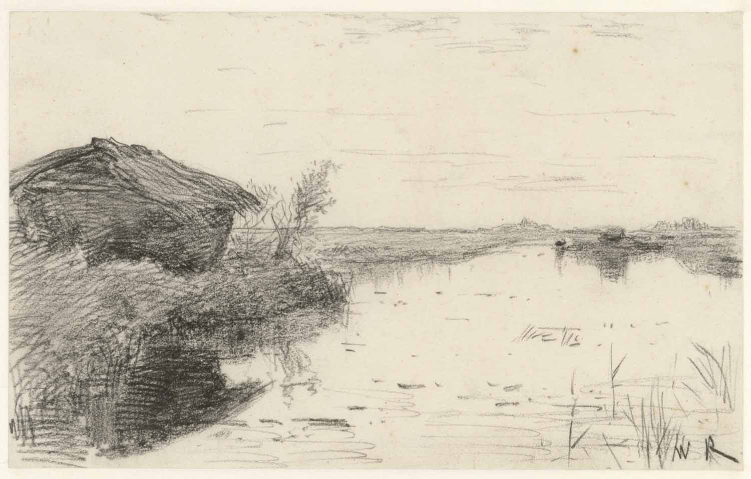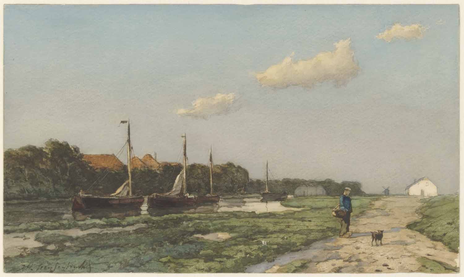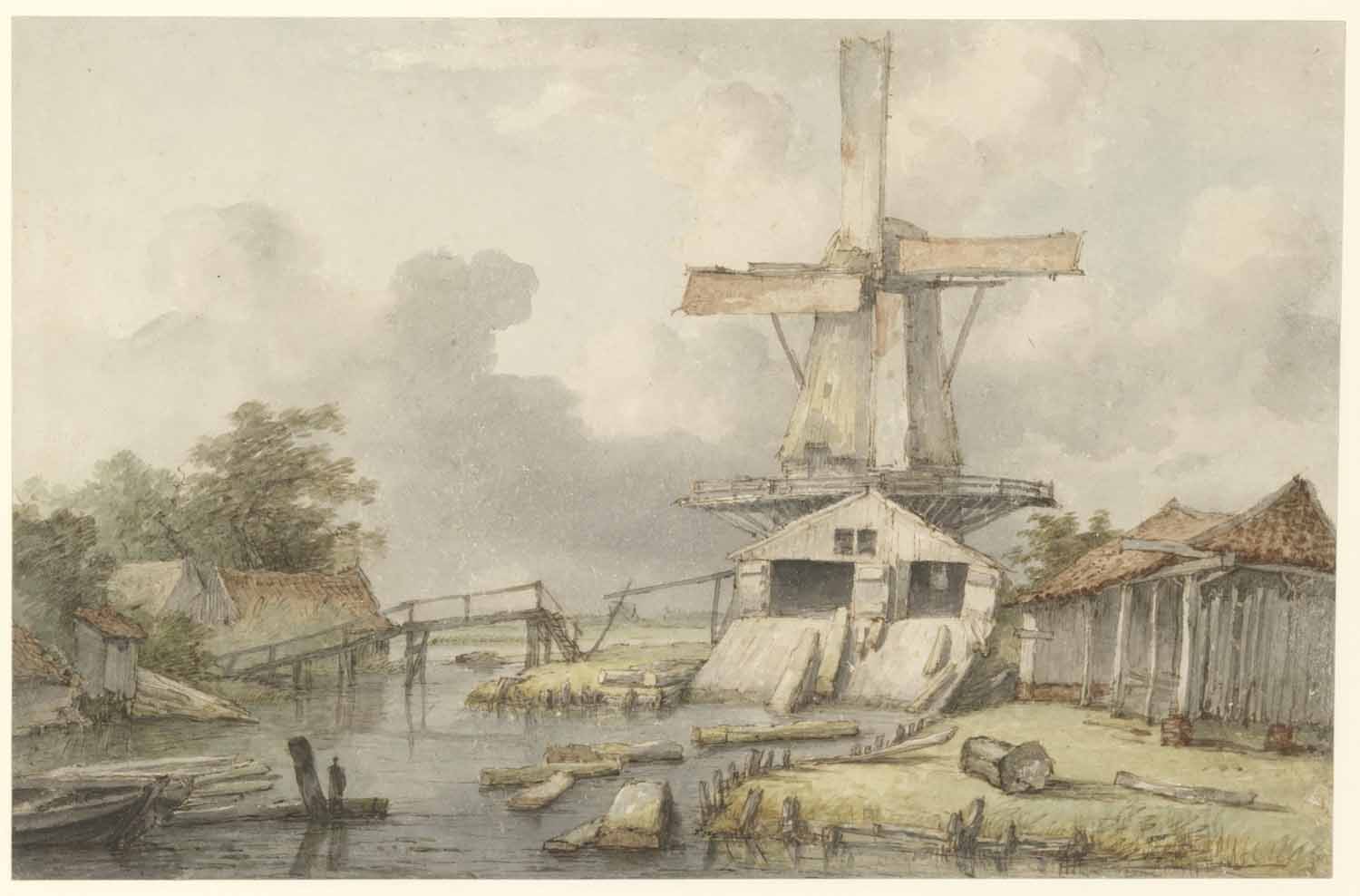Koeien aan een water bij Gouda. Molen in landschap (...