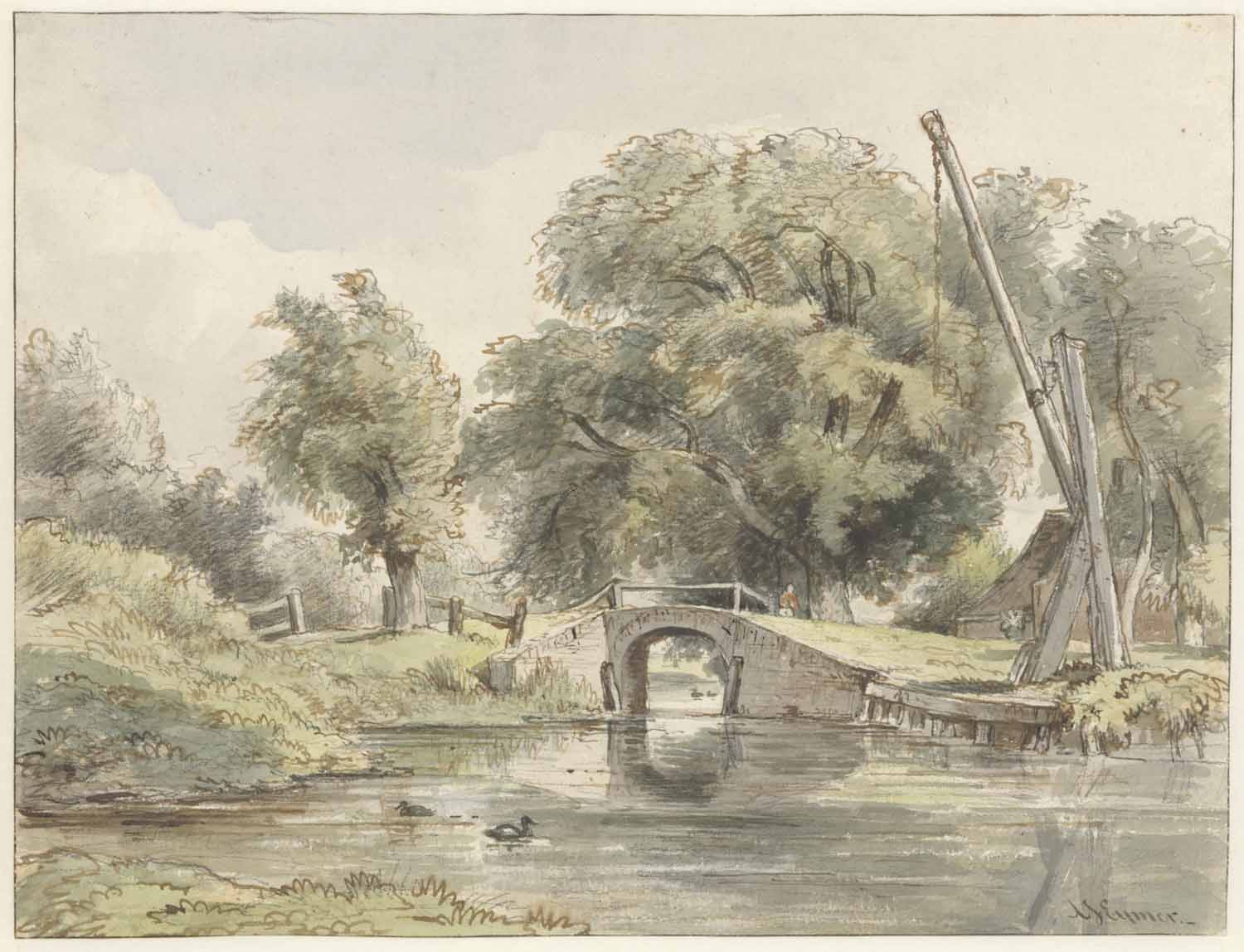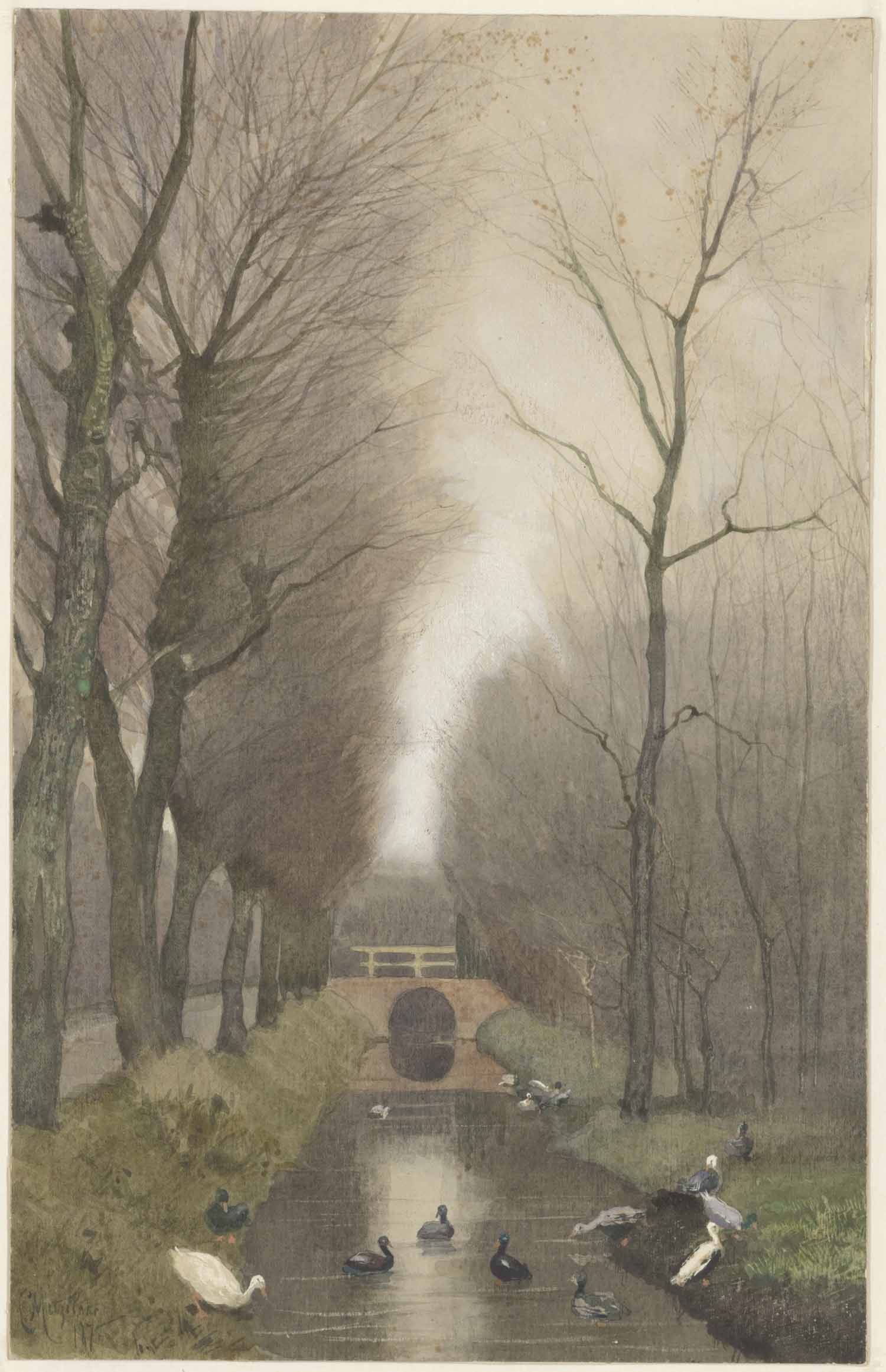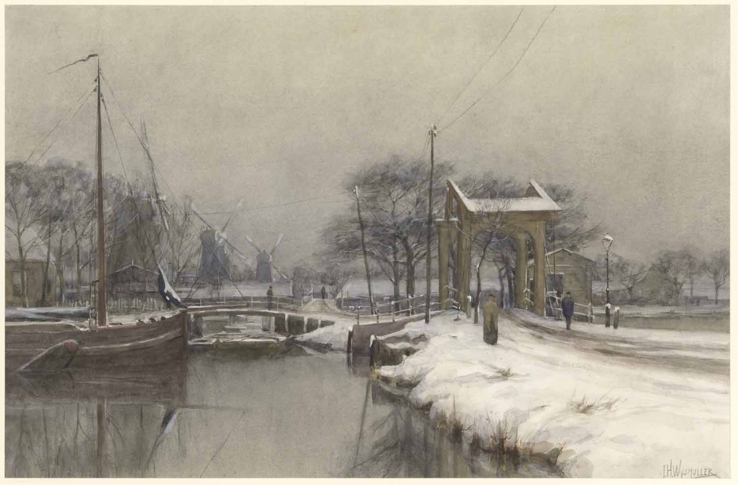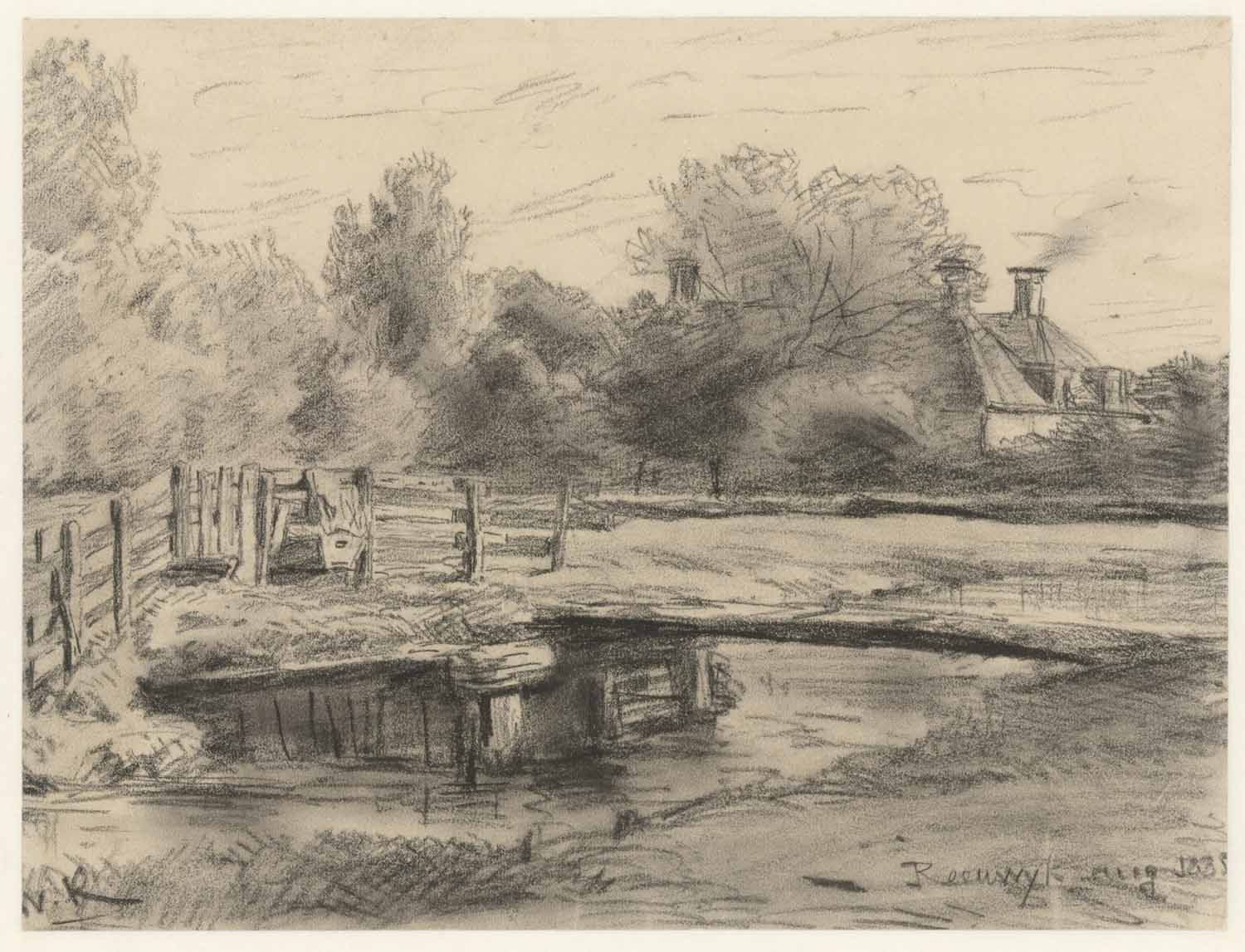 Koeien aan een water bij Gouda. Molen in landschap (...