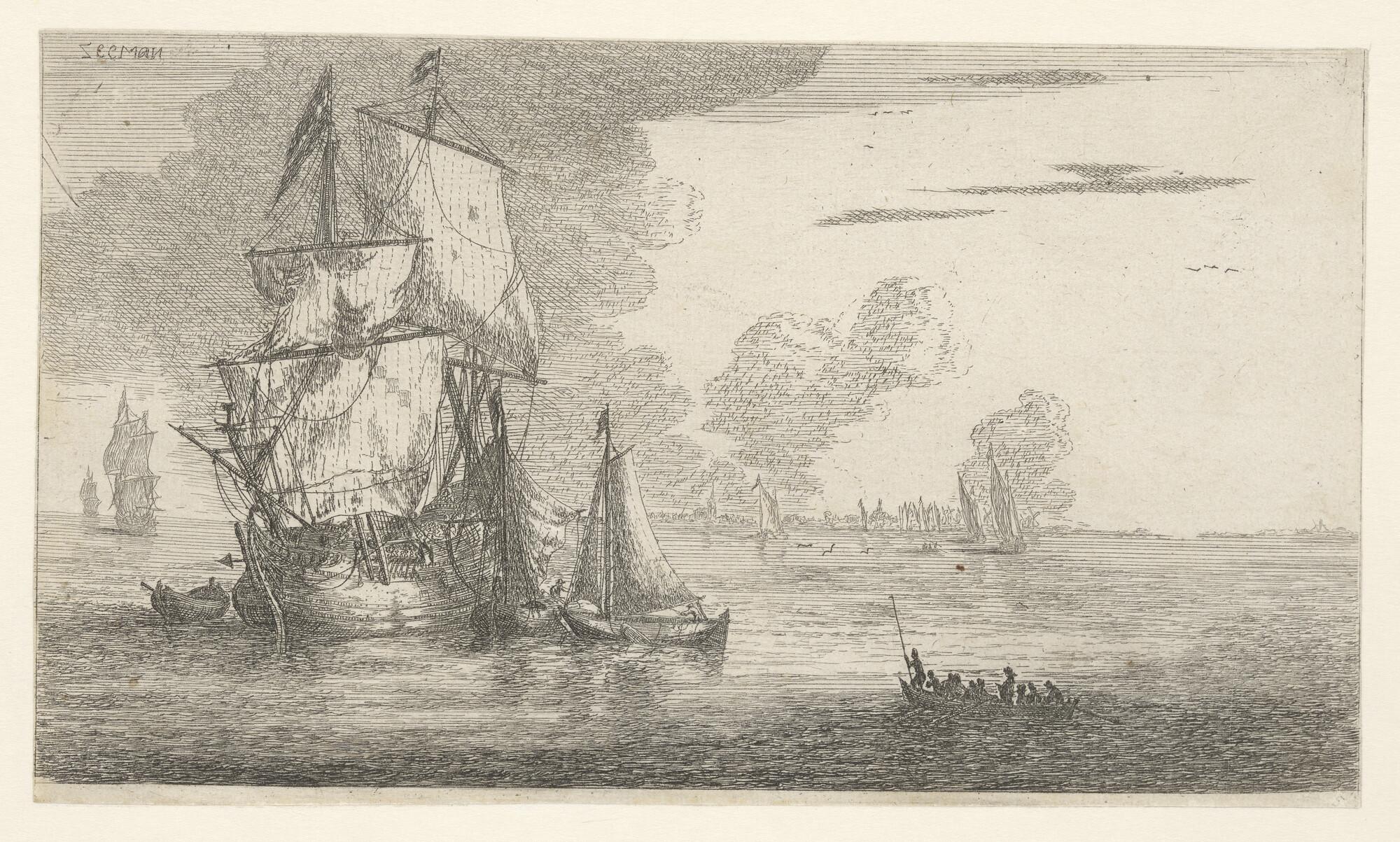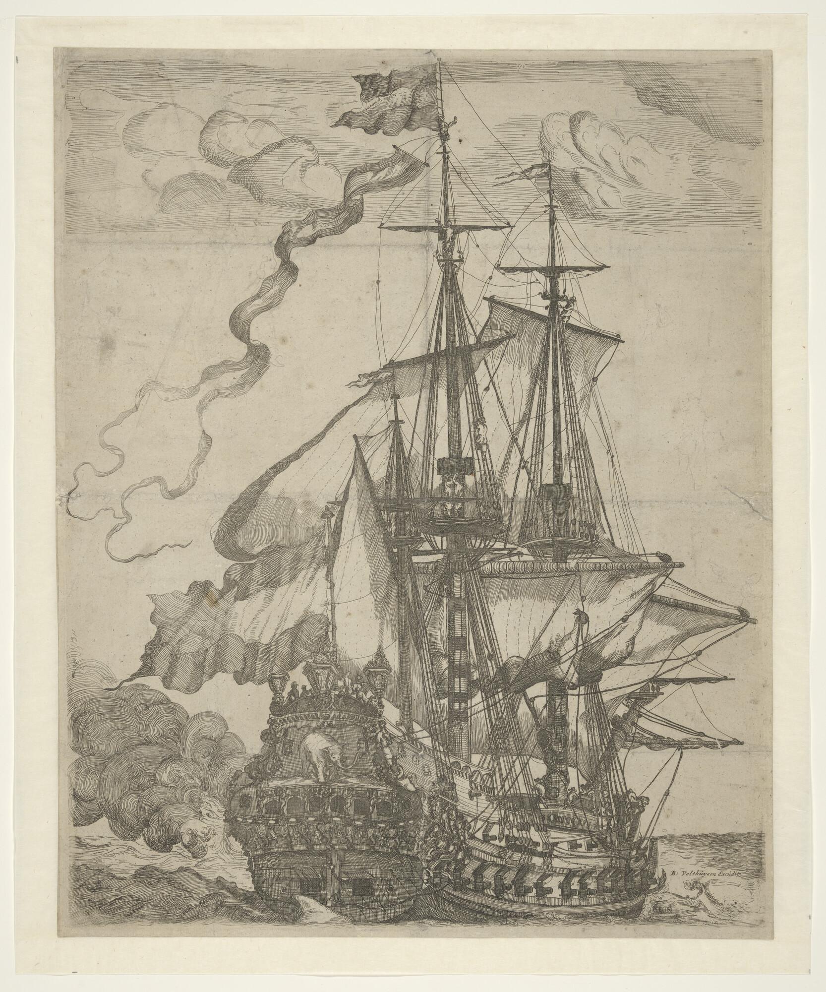 Een bewapende koopvaarder of oorlogsschip met op de ...